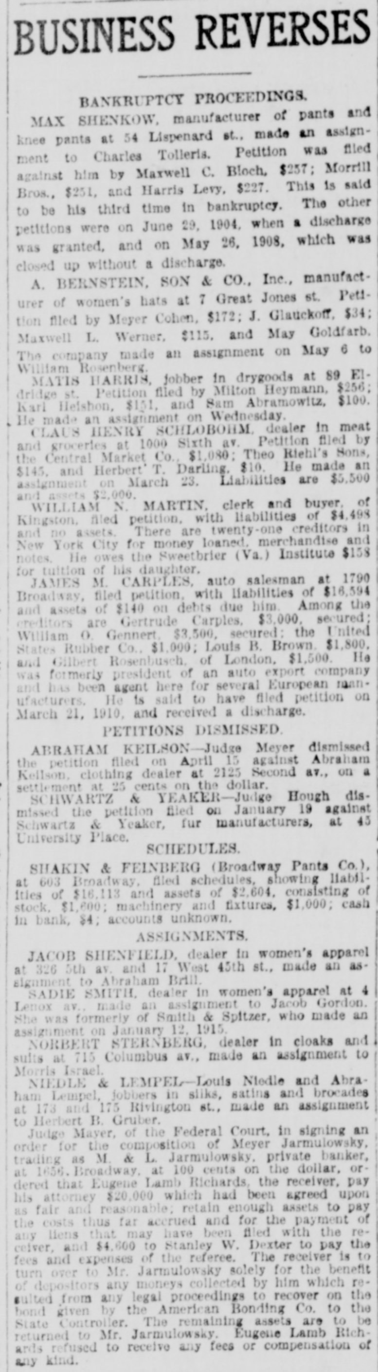 BUSINESS REVERSES BANKRUPTCY PROCEEDINGS. MAX SHENKOW, manufacturer of pants and knee pants at 54 Lispenard st., made an assignment to Charles Tolleris. Petition was filed against him by Maxwell C. Bloch, $257; Morrill Bros., $251, and Harris Levy, $227. This is said to be his third time in bankruptcy. The other petitions were on June 29, 1904, when a discharge was granted, and on May 26, 1908, which was closed up without a discharge. A. BERNSTEIN, SON & CO., Inc., manufacturer of women's hats at 7 Great Jones st. Petition filed by Meyer Cohen, $172; J. Glauckoff, $34; Maxwell L. Werner, $115, and May Goldfarb. The company made an assignment on May 6 to William Rosenberg. MATIS HARRIS, jobber in drygoods at 89 Eldridge st. Petition filed by Milton Heymann, $256; Kari Helshon, $151, and Sam Abramowitz, $100. He made an assignment on Wednesday. CLAUS HENRY SCHLOBOHM, dealer in meat and grocerles at 1000 Sixth av. Petition filed by the Central Market Co., $1,080; Theo Riehl's Sons, $145, and Herbert T. Darling. $10. He made an assignment on March 23. Liabilities are $5.500 and assets $2,000. WILLIAM N. MARTIN, clerk and buyer, of Kingston, filed petition, with liabilities of $4,498 and no assets. There are twenty-one creditors in New York City for money loaned, merchandise and notes. He owes the Sweetbrier (Va.) Institute $158 for tuition of his daughter. JAMES M. CARPLES, auto salesman at 1790 Broadway, filed petition, with liabilities of $16,594 and assets of $140 on debts due him. Among the creditors are Gertrude Carples, $3,000, secured; William O. Gennert, $3,500, secured; the United States Rubber Co., $1.000; Louis B. Brown. $1,800, and Gilbert Rosenbusch, of London, $1,500. He was formerly president of an auto export company and has been agent here for several European manufacturers. He is said to have filed petition on March 21, 1910, and received a discharge. PETITIONS DISMISSED. ABRAHAM KEILSON-Judge Meyer dismissed the petition filed on April 15 against Abraham Kellson, clothing dealer at 2125 Second av., on a settlement at 25 cents on the dollar. SCHWARTZ & YEAKER-Judge Hough dismissed the petition filed on January 19 against Schwartz & Yeaker, fur manufacturers, at 45 University Place. SCHEDULES. SHAKIN & FEINBERG (Broadway Pants Co.), at 603 Broadway, filed schedules, showing liabilities of $16.113 and assets of $2,604, consisting of stock, $1,600; machinery and fixtures, $1,000; cash in bank, $4; accounts unknown. ASSIGNMENTS. JACOB SHENFIELD, dealer in women's apparel at 326 5th av. and 17 West 45th st., made an assignment to Abraham Brill. SADIE SMITH, dealer in women's apparel at 4 Lenox av., made an assignment to Jacob Gordon. She was formerly of Smith & Spitzer, who made an assignment on January 12, 1915. NORBERT STERNBERG, dealer in cloaks and sults at 715 Columbus av., made an assignment to Morris Israel. NIEDLE & LEMPEL-Louis Niedle and Abraham Lempel, jobbers in sliks, satins and brocades at 173 and 175 Rivington st., made an assignment to Herbert B. Gruber. Judge Mayer, of the Federal Court, in signing an order for the composition of Meyer Jarmulowsky, trading as M. & L. Jarmulowsky, private banker, at 1656. Broadway, at 100 cents on the dollar, ordered that Eugene Lamb Richards, the receiver, pay his attorney $20,000 which had been agreed upon as fair and reasonable; retain enough assets to pay the costs thus far accrued and for the payment of any liens that may have been filed with the receiver, and $4.600 to Stanley W. Dexter to pay the fees and expenses of the referee. The receiver is to turn over to Mr. Jarmulowsky solely for the benefit of depositors any moneys collected by him which resulted from any legal proceedings to recover on the bond given by the American Bonding Co. to the State Controller. The remaining assets are to be returned to Mr. Jarmulowsky. Eugene Lamb Richards refused to receive any fees or compensation of any kind.