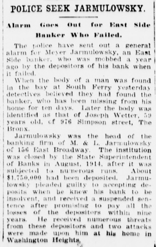 POLICE SEEK JARMULOWSKY. Alarm Goes Out for East Side Banker Who Failed. The police have sent out a general alarm for Meyer Jarmulowsky, an East Side banker. who was mobbed a year ago by the depositors of his bank when it failed. When the body of a man was found in the bay at South Ferry yesterday detectives believed they had found the banker. who has been missing from his home for ten days. Later the body was identified as that of Joseph Wetter. 59 years old, of 976 Simpson street, The Bronx. Jarmulowsky was the head of the banking firm of M. & L. Jarmulowsky of 156 East Broadway. The institution was closed by the State Superintendent of Banks in August, 1914. after it was subjected to numerous runs. About $1,750,000 had been deposited. Jarmulowsky pleaded guilty to accepting deposits when be knew his bank to be insolvent, and received a suspended sentence after promising to pay all the losses of the depositors within nine years. He received numerous threats from these depositors and two attacks were made upon him at his home in Washington Heights