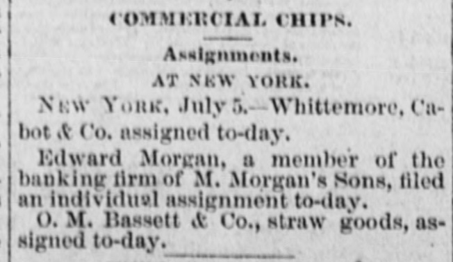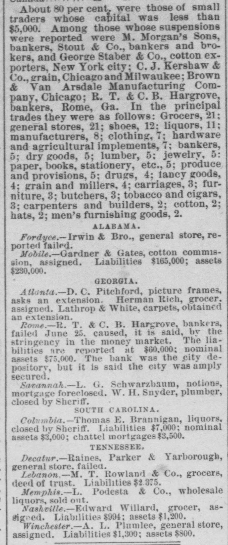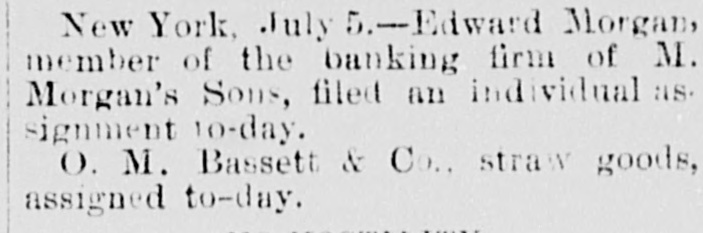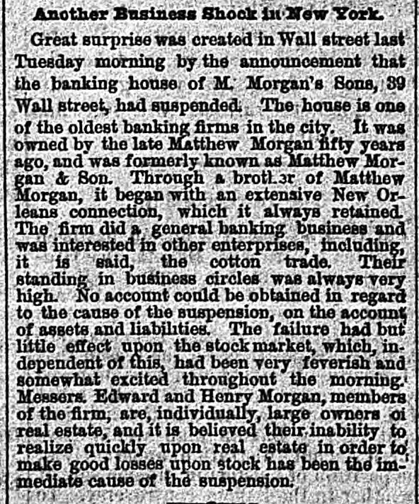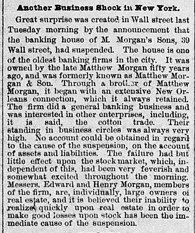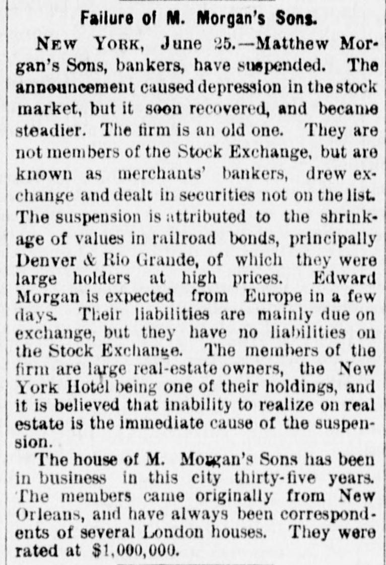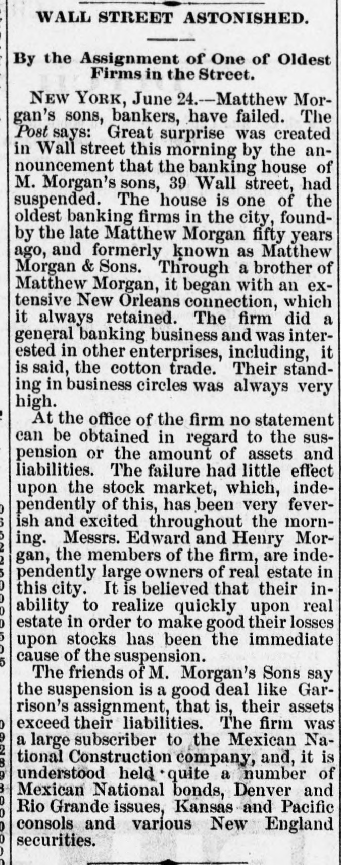 FLURRY IN STOCKS. ANOTHER FAILURE IN WALL STREET. suspension of Matthew Morgan's Showing Sons, Merchant Bankers--Figure $1,a Depreciation in Stocks of 500,000,000 in Three Years. FAILURE OF M. MORGAN'S SONS. NEW YORK, June 24.-Matthew Mor- The Sons, bankers, have suspended. stock announcement gan's caused depression in the became market, but It soon recovered, and are steadier. The firm is an old one. They members of the Stock Exchange, but are not known as merchants' bankers, drew e the list change and dealt in securities not on shrink The suspension is attributed to the of values in railroad bonds, principally were age Denver & Rio Grande, of which they Edward holders at high prices. few large Morgan is expected from Europe in due on days. Their liabilities are mainly liabilities on but they have no of the exchange, the Stock Exchange. real-estate The owners, members the New firm are Hotel large being one of their holdings, real and York believed that inability to realize on estate it is is the immediate cause of the suspension. house of M. Morgan's Sons has been The business in this city thirty-five years. New In members came originally from The and have always been correspond- were ents Orleans, of several London houses. They rated WALLSTREET, at $1,000,000. June 21-1 p. -Stocks highest buoyant and prices up to the It is reare the day for some shares. point of that a prominent railway capitalist Europe. ported effected a loan for 6,000,000 in Island Western has Union sold up to 521/2, Rock to St. Paul to 61%, Northwestern Pacific 851/1, to 1081/6, Lake Shore to 73, and Union to 35% m. Another attack was made on 1:15 p. market. Prices declined the share Western] Union was again the objective 521/6 11/4. and was forced down from latter point, 51, but all efforts to get it below the o'clock unavailing. About one the figure there was were a recovery of 1/1 to % and market was YORK, firm June again. 24. Correspondence H. NEW Cyrus W. Field and William in between Vanderbilt, under date, is published, that Mr. Vanderbilt denies the rumor return which become a "bear" since his each he has and offers $1,000 for from Europe, of any kind that he is connected with six share as a Director, that he has sold within weeks. NEW YORK, June 24 Since March best the depreciation in stocks according to about the as authorities on e street, has been Gould, Vanderbilt, $50,000,000 follows: Huntington stocks, $20,000, $70,000,000; 000;six(other activesecurity nearly $40,000. Central depreciation in Now York 000. The March 1 is about $18,000,0006 stocks since m Lake Shore, $15,000,000 Michigan $6,800,000 Northwestern, $19,000,000; & tral. $7,500.0 Louisville Lackawanna, 80,000,000; K nsas & Texas, Union Nashville, Pacific, 84,100,000; 82,400,000; Wabash, Central PaUnion, 200,000; Western $16,800,000; Chesapeake & Ohio, $1,200,000; elfic, Denver & Rio Grande, $4,900, Pacific, Erie, $9,200,000; Northern Read 000; Pacific Mail, 88,200,000; $1,400,000; Rock Island, $8,000,000. ing. The $10,700,000; decline: really began with Since the assas- then sination of Garfield in 1881. in the price of has been a decline there security. Taintor & Holt, the prices bank- of every their careful analysis of the deers, in estimate the total raifroad preciation stocks, in the value of all quotable March rallsecurities from July 1, 1881, to road 1884, at $1,185,590,181 The the deprecia- total tion since March 1 must make over Jay $1,500,000,000. Gould denies that of any $2,000,000 trust com- on that be is unable to him be true pany and that has called it couldn't a loan meet for the sim- He said reason that he had no loans out. ple Wash Connor, Gould's partner, publicly and of a 55,000 bill on the street who fered held up it for the name of the person started the Gould Vanderbilts rumor. are heavy losers been The decline, younger but William H. has not In the in it. The whole secret 0 yesterInterested was a determined effort join to day's sensation the market and send Gould to of break in bankruptoy. The ramor Garrison Judge Hilton's failure is authoritatively of the denied. LONDON, June --The press comments Ameriextensively market The unanis can rallway opinion expressed is that n threaten mous of affairs exists. The Times embarthat state the rumors of Mr. gentleman Gould' Passmont for It gives to have been able disothers. profit by the storm Yet, I which It has should hapnatrous that to he was obliged to suspend would the Times pen is not certain but the result mar be more beneficial to the sorely operations. tried long held subject to his Van kets so June The Brown & Arsdale CHICAGO, Manufacturing Company, as Kingsstreet, made an signment bury Alderman John T. Noyes firm manufactured to cast-Iron wagon machinery the city. of the largest in and was one occupied the entire block Kingsbury The works between Michigan and half Illinois way streets, and extended east rly men street. Several hundred to Market employed. Mr. C.B. Brown. Habill- Prest dent were of the company estimates the the asat about $110,000, and ties at $200,000 The assignment some was sets precipitated by the refusal an of extencreditors to grant Eastern of time. Unsuccessful attempts were firm sion loan, and then the made to to negotiate make general assignment. The the decided real estate on which the works merchandise, stand, entire plant, book accounts, assignee. were turned over to the to etc., The value of these alone is supposed creditors' than equal to the be claims more In 1877 the company went through This and paid fifty per cent. bankruptcy supposed to have crippled them some, and is they have since done a large prosperous though business, amounting months to $800,000 the During the past two of trade. R company year. suffered from the dullness Ga. June 24. There was a Court Adjourned to Give Them Room. 509.