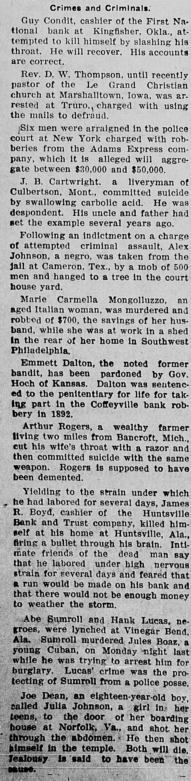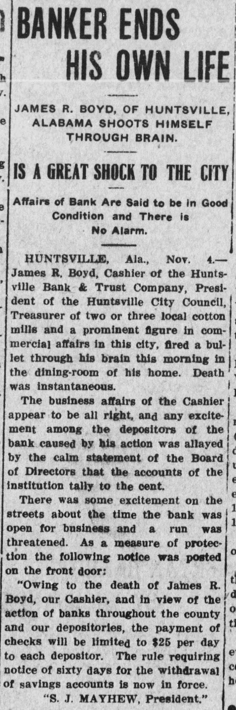 BANKER ENDS HIS OWN LIFE JAMES R. BOYD, OF HUNTSVILLE, e ALABAMA SHOOTS HIMSELF THROUGH BRAIN. IS A GREAT SHOCK TO THE CITY Affairs of Bank Are Said to be in Good Condition and There is No Alarm. HUNTSVILLE, Ala., Nov. 4.James R, Boyd, Cashier of the Huntsville Bank & Trust Company, President of the Huntsville City Council, Treasurer of two or three local cotton mills and a prominent figure in commercial affairs in this city, fired a bullet through his brain this morning in the dining-room of his home. Death was instantaneous. The business affairs of the Cashier appear to be all right, and any excitement among the depositors of the bank caused by his action was allayed o by the calm statement of the Board of Directors that the accounts of the institution tally to the cent. There was some excitement on the 1 streets about the time the bank was 1 open for business and a run was threatened. As a measure of proteco tion the following notice was posted on the front door: t "Owing to the death of James R. Boyd, our Cashier, and in view of the o action of banks throughout the county and our depositories, the payment of checks will be limited to $25 per day to each depositor. The rule requiring c notice of sixty days for the withdrawal h of savings accounts is now in force. "S. J. MAYHEW, President."