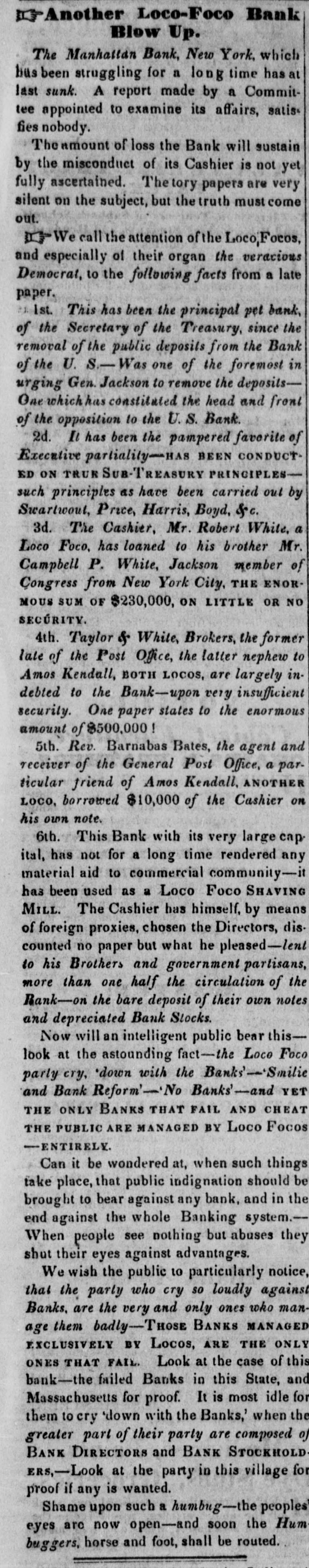 x Another Loco-Foco Bank Blow Up. The Manhattan Bank, New York, which us been struggling for a long time has at last sunk. A report made by a Committee appointed to examine its affairs, salis s nobody. The mmount of loss the Bank will sustain by the misconduct of its Cashier is not yet fully ascertained. The tory papers are very silent on the subject, but the truth must come out. D-We call the attention of the Loco,Focos, and especially of their organ the veracious Democrat, to the following facts from a late paper. 1st. This has been the principal pet bank, of the Secretary of the Treasury, since the removal of the public deposits from the Bank of the U. S.Was one of the foremost in urging Gen. Jackson to remove the depositsOne which has constituted the head and front of the opposition to the U.S Bank. 2d. It has been the pampered favorite of Executive partiality-HAS BEEN CONDUCT ED ON TRUR SUB TREASURY PRINCIPLESsuch principles as have been carried out by Swartwout, Price, Harris, Boyd, &c. 3d. The Cashier, Mr. Robert White, a Loco Foco, has loaned to his brother Mr. Campbell P. White, Jackson member of Congress from New York City, THE ENOR MOUS SUM OF $230,000, ON LITTLE OR NO SECURITY. 4th. Taylor & White, Brokers, the former late of the Post Office, the latter nephew to Amos Kendall, BOTH Locos, are largely indebted to the Bank-upon very insufficient security. One paper states to the enormous amount of ($500,000 ! 5th. Rev. Barnabas Bates, the agent and receiver of the General Post Office, a particular friend of Amos Kendall, ANOTHER Loco, borrowed $10,000 of the Cashier on his own note. 6th. This Bank with its very large cap ital, has not for a long time rendered any material aid to commercial community-in has been used as a Loco Foco SHAVING MILL. The Cashier has himself, by means foreign proxies, chosen the Directors, dis. counted no paper but what he pleased-lent to his Brothers and government partisans, more than one half the circulation of the Bank-on the bare deposit of their own notes and depreciated Bank Stocks. Now will an intelligent public bear thislook at the astounding fact-the Loco Foco party cry, down with the Banks'--Smilie and Bank Reform'--'No Banks'-and YET THE ONLY BANKS THAT FAIL AND CHEAT THE PUBLIC ARE MANAGED BY Loco Focos -ENTIRELY. Can it be wondered at, when such things take place, that public indignation should be brought to bear against any bank, and in the end against the whole Banking system. When people see nothing but abuses they shut their eyes against advantages. We wish the public to particularly notice, that the party who cry so loudly against Banks, are the very and only ones who manage them badly-Those BANKS MANAGED EXCLUSIVELY BY Locos, ARE THE ONLY ONES THAT FAIL Look at the case of this bank-the failed Banks in this State, and Massachusetts for proof. It is most idle for them cry 'down with the Banks,' when the greater part of their party are composed of BANK DIRECTORS and BANK STOCKHOLD ERS,-Look at the party in this village for proof if any is wanted. Shame upon such a humbug-the peoples eyes are now open-and soon the Hum buggers, horse and foot, shall be routed.