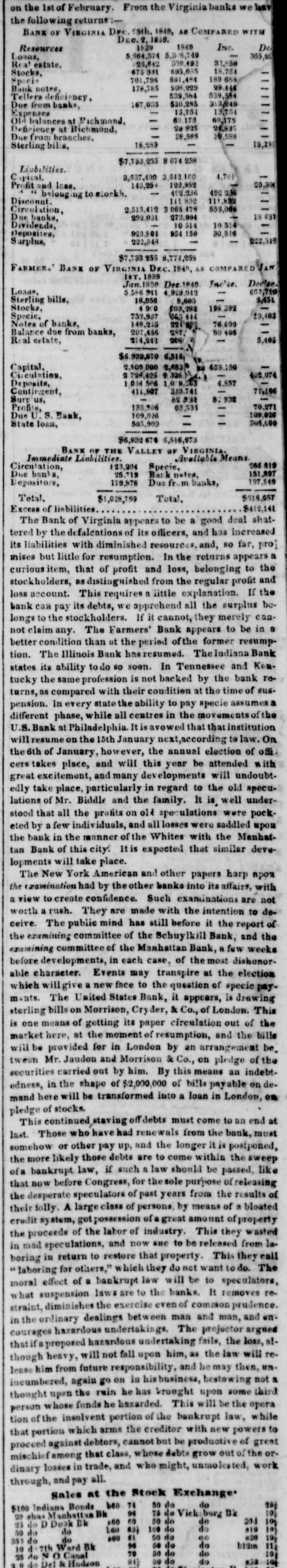 on the 1st of February. From the Virginia banks we hav the following returns:- # BANK OF VIRGINIA DEC. 15th, 1840, AB COMPARED WITH DEC. 2, 1839. Resources 1839 1540 Inc. De Loans, 5,664.374 5,3 8,749 355,60 Rea' estate, 26,642 359.492 32,950 Stocks, 675 331 695,035 18.754 Specie 701,796 891,494 189 658 Bank notes, 178,765 508,229 29.444 Tellers deficieney, 539,584 539,554 Due from banks, 167,035 530,285 3:3,249 Expenses 13,754 13.754 Old balances at Pichmond, 60.178 60,175 Deficiency at Richmond, 28 825 24,825 Due from branches, 38,589 28,588 Sterling bilis, 18,999 18,239 $7,783,255 8 674 258 Liabilities. Capital. 3,637,490 3,642 100 4,701 Profit and loss. 143,25 122,952 20,30 Discount, "belonging to slockh. 492.236 492 236 111 832 111.832 Circulation, 2,513,412 3 065.478 553,066 Due banks, 292,031 273.994 18 437 Dividends, 10 514 10. 514 Deposites, 923,501 954 150 30,316 Sarplus, 222,343 222,319 $7,733 255 8,774,255 # FARMER BANK OF VIRGINIA DEC. 1840, AS COMPARED JAN IsT. 1839 Jan. 1839. Dec.1940. Inc'se. Decse. Loads, 5.566 941 4,929,042 657,790 Sterling bills, 18,056 8,605 9,451 Stocks, 4900 203,282 198.382 Specie, 759,937 63 444 29,493 Notes of banks, 148,225 224 805 76.699 Balance due from banks, 207,456 257 80 406 Real estate, 214,242 266/ 5.408 N $6.939,670 6,516 Capital, 2,500 000 2,653 653,150 Immediate Liabilities. Circulation, 123,204 Circulation, 2724,425 2326 402,074 Deposits, 1,014 506 1,0-9,563 4.857 Contingent, 411,907 310.741 71,166 Surplus, 82 932 8.932 Profits, 133,306 63,535 70.271 Due U. S. Bank, 109,026 109,026 State loan, 505,000 505,000 $6,932 670 6,516,073 # BANK OF THE VALLEY OF VIRGINIA. Available Means. Specie, 266 819 Due banks, 25.719 Bark notes, 151,897 Depositors, 179,876 Due from banks, 197,540 Total, $1,028,799 Total, $516,657 Excess of liabilities. $412,141 The Bank of Virginia appears to be a good deal shat- tered by the defalcations of its officers, and has increased its liabilities with diminished resources, and, so far, pro- mises but little for resumption. In the returns appears a curious item, that of profit and loss, belonging to the stockholders, as distinguished from the regular profit and loss account. This requires a little explanation. If the bank caa pay its debts, we apprehend all the surplus be- longs to the stockholders. If it cannot, they merely can- not claim any. The Farmers' Bank appears to be in a better condition than at the period of the former resump- tion. The Illinois Bank has resumed. The Indiana Bank states its ability to do so soon. In Tennessee and Kem- tucky the same profession is not backed by the bank re- turns, as compared with their condition at the time of sus- pension. In every state the ability to pay specie assumes a different phase, while all centres in the movements of the U.S. Bank at Philadelphia. It is avowed that that institution will resume on the 15th January next, according to law. On the 6th of January, however, the annual election of offi cers takes place, and will this year be attended with great excitement, and many developments will undoubt- edly take place, particularly in regard to the old specu- lations of Mr. Biddle and the family. It is well under- stood that all the profits on old speculations were pock- eted by a few individuals, and all losses were saddled upon the bank in the manner of the Whites with the Manhat- tan Bank of this city. It is expected that similar deve- lopments will take place. The New York American and other papers harp now the examination had by the other banks into its affairs, with a view to create confidence. Such examinations are not worth a rush. They are made with the intention to de- ceive. The public mind has still before it the report of the examining committee of the Schuylkill Bank, and the examining committee of the Manhattan Bank, a few weeks before developments, in each case, of the most dishonor- able character. Events may transpire at the election which will give a new face to the question of specie pay- monts. The United States Bank, it appears, is drawing sterling bills on Morrison, Cryder, & Co., of London. This is one means of getting its paper circulation out of the market here, at the moment of resumption, and the bille will be provided for in London by an arrangement be- tween Mr. Jaudon and Morrison & Co., on pledge of the securities carried out by him. By this means an indebt- edness, in the shape of $2,000,000 of bills payable on de- mand here will be transformed into a loan in London, on pledge of stocks. This continued staving off debts must come to an end at last. Those who have had renewals from the bank, must somehow or other pay up, and the longer it is postponed, the more likely those debts are to come within the sweep of a bankrupt law, if such a law should be passed, like that now before Congress, for the sole purpose of releasing the desperate speculators of past years from the results of their folly. A large class of persons, by means of a bloated credit system, got possession of a great amount of property the proceeds of the labor of industry. This they wasted in mad speculations, and now sue to be released from la- boring in return to restore that property. This they call "laboring for others," which they do not want to do. The moral effect of a bankrupt law will be to speculators, what suspension laws are to the banks. It removes re- straint, diminishes the exercise even of common prudence. in the ordinary dealings between man and man, and en- courages hazardous undertakings. The projector argues that if a proposed hazardous undertaking fails, the loss, al- though heavy, will not fall upon him, as the law will re- lease him from future responsibility, and he may then, un- incumbered, again go on in his business, bestowing not a thought upon the ruin he has brought upon some third person whose funds he hazarded. This will be the opera- tion of the insolvent portion of the bankrupt law, while that portion which arms the creditor with 