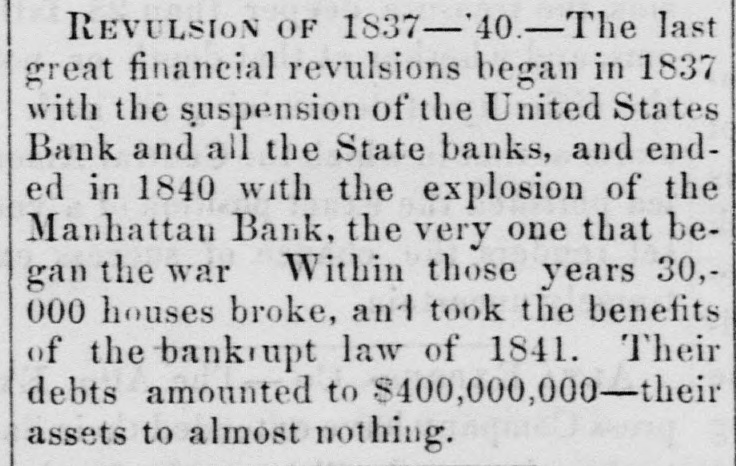 REVULSION OF 1837-40. The last great financial revulsions began in 1837 with the suspension of the United States Bank and all the State banks, and ended in 1840 with the explosion of the Manhattan Bank, the very one that began the war Within those years 30,000 houses broke, and took the benefits of the bankrupt law of 1841. Their debts amounted to $400,000,000-their assets to almost nothing.