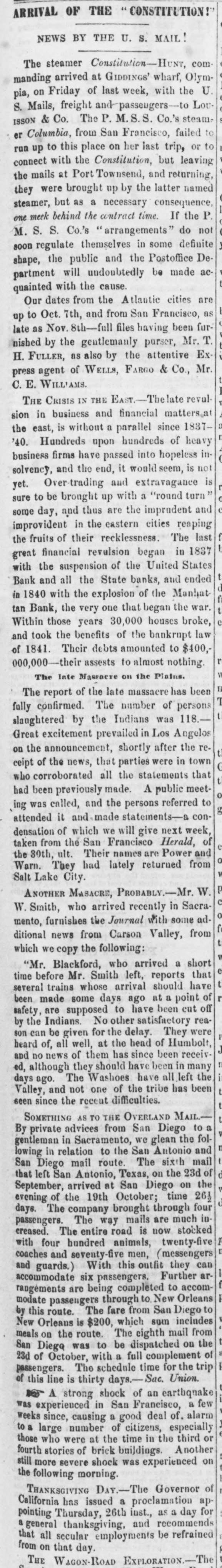 arrival OF THE CONSTITUTION!" NEWS BY THE U. S. MAIL! The steamer Constitution-Hunr, commanding arrived at GIDDINGS' wharf, Olympia, on Friday of last week, with the U. S. Mails, freight and-passeugers--to LouISSON & Co. The P. M.S.S. Co.'s steamer Columbia, from San Francisco, failed to run up to this place on her last trip, or to connect with the Constitution, but leaving the mails at Port Townsend, and returning, they were brought up by the latter named steamer, but as a necessary consequence, one meek behind the contract time. If the P. M. S. S. Co.'s "arrangements" do not soon regulate themselves in some definite shape, the public and the Postoffice Department will undoubtedly be made acquainted with the cause. Our dates from the Atlantic cities are up to Oct. 7th, and from San Francisco, as late as Nov. 8th-full files having been furnished by the gentlemanly purser, Mr. T. H. FULLER, as also by the attentive Express agent of WELLS, FARGO & Co., Mr. C. E. WILLIAMS. THE CRISIS IN THE EAST.-Thelate revulsion in business and financial matters_at the east, is without a parallel since 1837'40. Hundreds upon hundreds of heavy business firms have passed into hopeless insolvency, and the end, it would seem, is not yet. Over-trading and extravagance is sure to be brought up with a "round turn some day, and thus are the imprudent and improvident in the eastern cities reaping the fruits of their recklessness. The last great financial revulsion began in 1837 with the suspension of the United States Bank and all the State banks, and ended in 1840 with the explosion of the Manhat tan Bank, the very one that began the war. Within those years 30,000 houses broke, and took the benefits of the bankrupt law of 1841. Their debts amounted to $400,r 000,000-their assests to almost nothing. 2 The Inte Massacre on the Plains. = The report of the late massacre has been fully confirmed. The number of persons slaughtered by the Indians was 118.Great excitement prevailed in Los Angelos on the announcement, shortly after the re7 ceipt of the news, that parties were in town G who corroborated all the statements that had been previously made. A public meeto ing was called, and the persons referred to 09 attended it and-made statements-a condensation of which we will give next week, taken from the San Francisco Herald, of the 30th, ult. Their names are Power and 0 Warn. They had lately returned from W Salt Lake City. P ANOTHER MASACRE, PROBABLY.-Mr. W. W. Smith, who arrived recently in Sacra- e o mento, furnishes the Journal with some adfor ditional news from Carson Valley, from which copy the following: $ "Mr. Blackford, who arrived a short e time before Mr. Smith left, reports that t several trains whose arrival should have r been made some days ago at a point of safety, are supposed to have been cut off by the Indians. No other satisfactory reason can be given for the delay. They were heard of, all well, at the head of Humbolt, and no news of them has since been received, although they should have been in many days ago. The Washoes have all left the Valley, and not one of the tribe has been seen since the recent difficulties. SOMETHING AS TO THE OVERLAND MAIL.By private advices from San Diego to a < gentleman in Sacramento, we glean the foln lowing in relation to the San Antonio and San Diego mail route. The sixth mail that left San Antonio, Texas, on the 23d of September, arrived at San Diego on the evening of the 19th October; time 261 days. The company brought through four passengers. The way mails are much increased. The entire road is now stocked with four hundred animals, twenty-five coaches and seventy-five men, (messengers and guards.) With this outfit they can accommodate six passengers. Further arrangèments are being completed to accommodate passengers through to New Orleans by this route. The fare from San Diego to New Orleans is $200, which sum includes meals on the route. The eighth mail from San Diego was to be dispatched on the 23d of October, with a full complement of passengers. The schedule time for the trip of this line is thirty days.-Sac. Union. 10 A strong shock of an earthquake was experienced in San Francisco, a few weeks since, causing a good deal of. alarm to a large number of citizens, especially those who were at the time in the third or fourth stories of brick buildings. Another still more severe shock was experienced on the following morning. THANKSGIVING Day.-The Governor of California has issued a proclamation appointing Thursday, 26th inst., as a day for a general thanksgiving, and recommends from that all secular employments be refrained