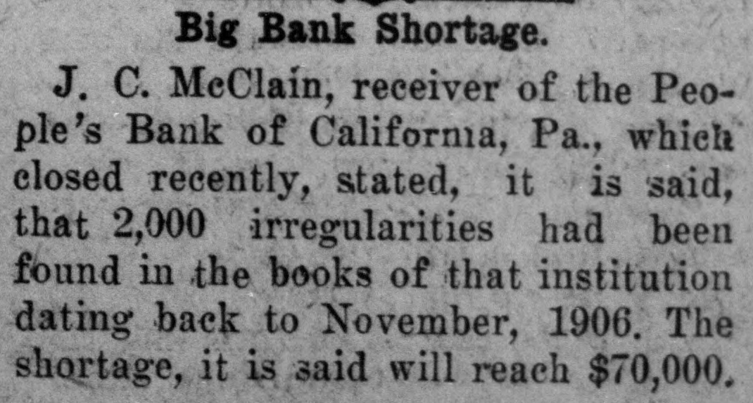They declared that the suggestions made from several western sources that they were not meeting legitimate demands for currency from the west were entirely unfounded and that they were, on the contrary, taking every practicable measure to aid the west and south. The first direct reports from the scene of the great earthquake at Karatagh, Russian Turkestan,say the victims number about 14,000; the city and many villages were destroyed. The Peoples bank of Portsmouth, Va., went into the hands of a receiver on petition of the directors, who gave out a statement that the bank has been made insolvent through defalcations of the cashier. Photographs and official data Ξepresenting a summer's work of the international boundary commission in Alaska were lost when a canoe capsized in the Bradfield river. It was proposed in the Michigan state constitutional convention to insert an article making voting obligatory, with a fine and prison sentence as penalties. State Senator Haines' bank of Forest Grove, Ore., did not open its doors for business because it could not obtain its balances from the Merchants National Bank of Portland, which suspended payment. The total equalized assessment of personal property, lands, and lots in Illinois for the year 1907 aggregates $1,138,622,398, according to reports by committees of the state board of equalization. Checks and currency to the amount of $22,000, intended to pay the wages of the Carbon Coal & Coke company's miners at Cokedale, Col., were lost or stolen while in transit in a stage. Former Gov. James E. Campbell, of Ohio, said that he is a receptive candidate for United States senator to succeed Senator J. B. Foraker. At Kansas City, Mo., the grand jury returned 149 additional indictments against persons charged with violating the state law which forbids labor Supury. uo A boiler at the ginhouse on the Trulock plantation, near Pine Bluff, Ark., exploded killing the owner, J. B. Trulock, and five negroes. The confession of Steve Adams, made in the office of the warden of the Idaho state penitentiary February 27, 1906, was introduced in evidence at the trial of Adams for the murder of Fred Tyler. It told of the murder of Tyler and Boule and involved Moyer, Haywood and Pettibone. The engine and tender of a Baltimore & Ohio train to which was attached a private car bearing Vice President Fairbanks and a party returning from the funeral of Judge McComas was derailed at Weverton Junction, Md. Immediately following the closing of the Peoples bank of California, Pa., by State Examiner Bynns, Oliver P. Piper, the cashier, and William L. Lenhart, a business man who lives in Brownsville, Pa., were arrested, charged with conspiracy to defraud the bank. A report reached Durango, Col., that a battle occurred at McElmo canyon, between Ute Indians and United States troops, in which six Indians were killed. No soldiers were killed "pepunom JO A boiler in the basement of the new Eastman dormitory at East Greenwich (R. I.) academy exploded and partly wrecked the structure. Three young women students were severely but not seriously injured. In the historic hall of St. George at Windsor Castle, King Edward and Queen Alexandra gave a state banquet in honor of the emperor and empress of Germany and their suite. A state convention of Democrats at Nashville, Tenn., started a movement for the nomination of a southern man as Democratic candidate for the presidency in 1908. Ray Bricker fell 115 feet down a mine near Boone, Ia., landed on his feet and was unhurt. Asserting that the cold weather has caused untold suffering on account of the scarcity of coal, the residents of Somerset, Neb., appealed to the state railway commission for relief. Charles Howard, 60 years old, a convict in the Joliet penitentiary, made his escape while working in the stone quarry. Six persons were injured when the 18-hour train from Chicago to New York on the Pennsylvania railroad ran into a stationary freight train in the yards at Larimer, near Greensburg, Pa. All work of all kinds on the Burlington railroad was stopped for five minutes while the body of its former president, C. E. Perkins, was being lowered into the grave. The peace proposition of General Manager Orr for the settlement of the railway strike in Havana, Cuba, was rejected at a meeting of the strikers. A terrific earthquake occurred at Unalaska and McCullough peak, which was created by an earthquake nearly a year ago, and extended over 3,400 feet above the sea, has dwindled to almost nothing as a result of submarine disturbances. As the result of a quarrel over an election bet, William Hopkins and