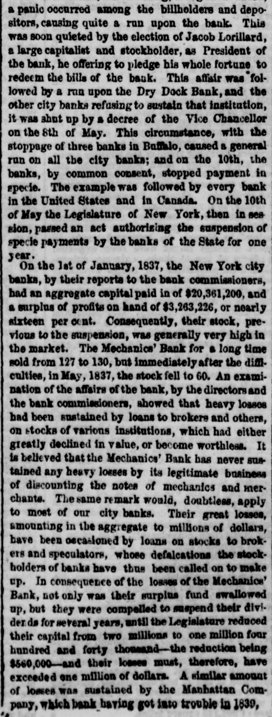 DE 14 NE / Richmond, Tuesday, Oct. 29. & BANKS. STOCKS. MONEY jejune MARKET, and unsatisfactory Banks of the Manifesto the with along We lay before of Philadelphia, for ments suspending of the veil over specie payments. This Document draws over the lebrated declaration the of ification Glute tory of the late of Mr. Biddle Specie Mr Circular John Q with Adams, that the the way for general the gross misina the enorof had difficult Bank draws of the United States, stocks mous in which State the Globe states cks be to to the the of three amount issuance amount Mississippy five millions, millions. and Illinois veil also of over mil lions to its heavy of Post advances notes for on the Cotton- purpose meet of its rising own the engage. wind that the exportation the of fact specie (says the the Girard Globe) Bank months ments Bank of the United States been and the principal shippers fur have, for Have not the lastsix the English papers. already had of this country or England by the Bank of the pounds glerling which cent sailed more than three week on Did not the Liverpool, carry to England account between of the after the suspension, hundred these dollars vast FUINS have been obliand Philadelphia four Banks: Yes, contempt of the prior of it prating sent the England, community in her? great about portion husband gations while away to England, of Penn hand, sylvania of the be resources for the purpose of deceiving the people Bank that general opinion, There We the the the Whig even from able address of the A Boston Bank Director in be to the York New American and and lligence, not person Banks, high largely character concerned in the in this manufac coun of the proposition all our difficulties believed. the tution, instit single arise from For has Bank that months many United States on London amounts large very their meet been drawing bills funds there stimulate d quale the to importation of left been their greatly only overtade to which has taken of shipment those importa ship Bank bills has due. ments failing has been of ex the course vated that Bank changes An drain. probably rapidly coming abundant the to turn months market-so the the In New men time, exchanges an for supply exchange York Banks have the necessary of detable ship which will the market probably with make any further onsi of the Banks Boston York ments This writer specie urgently stand calls their ground upon He one declares, course that to and "duty, New honor and morality, payments leave events. the That best pursue- specie equally quied by whole interest course, of fully our believe, city, of is the community ,ind the the uon country most interesting point New of view, York The Banks unde 10 pay specie horizon, The now the City The Merchanteare yet us cal reglutions, determine tremendous We relief give by extending their interior dis the Banks for notes the is counts. ing upon and also by receiving We give the the late inceedings said of Safety Fund Banks meetir of the merchants,which heldby the met on of that city chante of the We the journed been of the receiving largest ever the report/f their Comthe answers Banks. theee onlished o:them but ney differ ke find for York prints- with Almost the others) about re of the Safety Fund Notes As the Some Chairman of them POSI the of Banks tively reject the Banks proposition ready will adopt also the doit. measure Eig ht condition "fifteen that not the vet other prepa come consider into this arrange Others on minds made their Banks Some are of them wish for time the subject. and consider inexpedient We confine ourselves aid Bank of the Manhattan Company which (the Y Star institutions he Govern saye) of considered two the fiscal agents of ment 1839 24th NEW Oct., YORK. of the and Directors meeting of the specially President convened at this ue City day, Ho the hereupon resolutions Manhattan Compa meeting of the 23d merchants inst. were prisented and of of this Com the That Board Directors Resulted. all the give most the alleviate intense and unhappi exists this their city, dispo distress now the means to the that make use consistent with their duty their enthe faithful performance of stockholders gagement to the Public. M. GELSTON, President ROBT WHITE Cashier of the Board of Directors of of del the A a special America, meeting held this day for meeting the purpo of Merchants Bank of the proceedings of City Hotelthe betating Traders held the at the careful consideration of Board-it can that they and noeedings having Resolved received that this Board alleviate feeling the an of solicitude commercial all the within the power wants will Bank. extend consistent their with the the partmount duty of main it teining spe the "Resulted, specie That payments the opinion receive of this and Board pay out that the notes of the Safety is inexp present, Fund Banks of this State, as requested by the meeting Oct.24,1839. re Bank America. E. Post of Friday says, very Our much Banks reduced main The firm; the demand for pressure specie the money market We are is interest and the much intensity confined to the dry goods' course which as-ured very that the Banks will take their ability to continue 88 specie payments 89 12 hazard in the slightest Philadelphia degree drafts bid- offered 000 Treasur at offered notes bid, Balumore sold 99 12, $1,000 state 99. of and the more specie market Money to 9878 and Y Commercial this indicates of Wednesday on says. undoubted pa In extreme per cases, The day is worth per cent. month, cent is belie ed to hav of 'The been given. from Philadelphia of the 22d from says Mr. Jaudon ficers A letter of the S Bank that have had receiv made arran gementwi the deta h is and posititeinin Rothschild mation cover the bills on Hottinguer They feel there of S unless, persatisfied that their bills have been the accepted, rumor of their prember Rothschile being un accepted should the 21st have backed out express of his agree great the the by chance, ment Some of consummation the papers. 