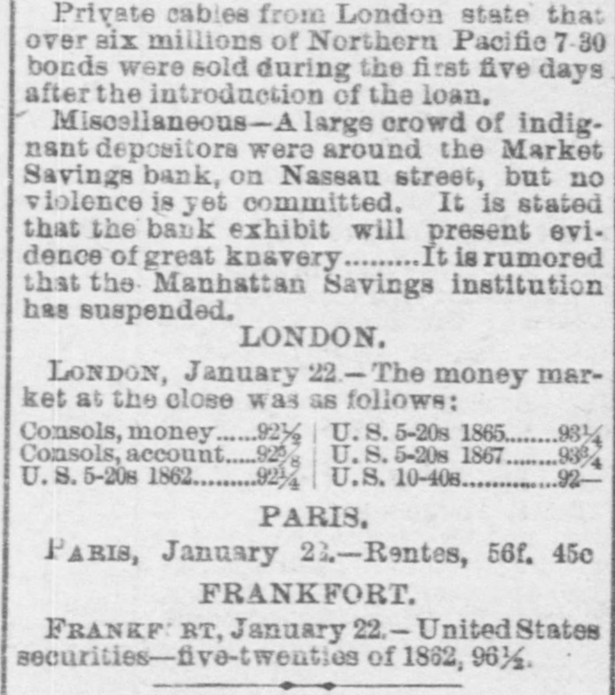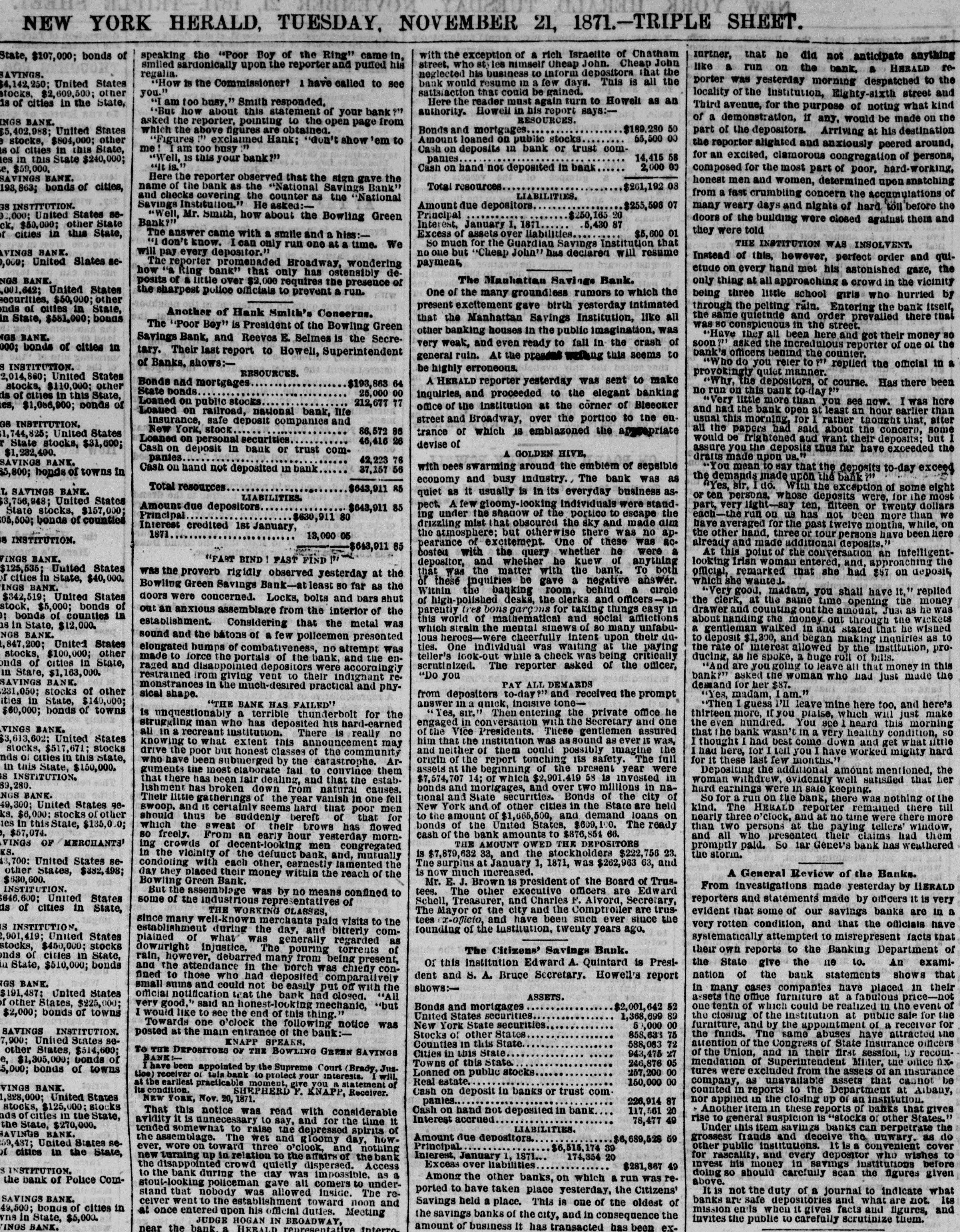 NEW YORK HERALD, TUESDAY, NOVEMBER 21, 1871.-TRIPLE SHEET. with the exception of a rich Israelite of Chatham speaking the "Poor Boy of the Ring" came in, State, $107,000; bonds of lurtner, that he dia not anticipate anything street, who les nimself Cheap John. Cheap John smiled sardonically upon the reporter and puffed his like a run on the bank. a HERALD reregalia. SAVINGS. neglected his business to inform depositors that the Dorter was yesterday morning despatched to the 'How is the Commissioner? 1 have called to see bank would resume in a few days. This is all the $4,142,250; United States satisiaction that could be gained. you.' stocks, $2,609,500; otner locality of the Institution, Eighty-sixth street and Here the reader must again turn to Howell as an I am too busy, Smith responded, 1s of cities in the State, Third avenue, for the purpose of noting what kind But how about this statement of your bank authority. Howell in his report says:of a demonstration, if any, would be made on the RESOURCES. INGS BANK. asked the reporter, pointing to the open page from $189,280 50 which the above figures are obtained. Bonds and mortgages $5,402,988; United States part of the depositors. Arriving at his destination 65,500 03 Amount loaned on public stocks "Figures exclaimed Hank; "don't show 'em to stocks, $804,000; other the reporter alighted and anxiously peered around, me am too busy Cash on deposits in bank or trust comis of cities in this State, for an excited, clamorous congregation of persons, 14,415 58 "Well, IS this your bank?" panies les in this State $240,000; "It is." 2,000 0 Cash on hand not deposited in bank e, $59,000. composed for the most part of poor. hard-working, SAVINGS BANK. Here the reporter observed that the sign gave the honest men and women, determined upon snatching Total resources $261,192.08 name of the bank as the "National Savings Bank" 193,863; bonds of cities, from a fast crumbling concern the accumulations of LIABILITIES. and checks covering the counter as the "National Savings Institution." He asked:$255,596 07 as INSTITUTION. Amount due depositors many weary days and nights of hard toll before the Principal 02,000; United States se$250,165 "Well, Mr. smith, how about the Bowling Green doors of the building were closed against them and Bank?' 5,430 Interest, January 1, 1871 ck, $50,000; other State they were told Excess of assets over liabilities $5,600 00 cities in this State, The answer came with a smile and a hiss:So much for the Guardian Savings Institution that THE INSTITUTION WAS INSOLVENT. don't know. I can only run one at a time. We VINGS BANK. will pay every depositor. one but "Cheap John" hus declared will resume Instead of this, however, perfect order and qui,000; United Slates sepayment, The reporter promenaded Broadway, wondering etude on every hand met his astonished gaze, the how "a Ring bank" that only has ostensibly deNGS BANK. The Manhattan Savings Bank. only thing at all approaching a crowd in the vicinity posits of a little over $2,000 requires the presence of .001,642; United States the sharpest police officials to prevent a run. One of the many groundless rumors to which the being three little school girls who hurried by securities, $50,000; other present excitement gave birth yesterday intimated through the pelting rain. Entering the bank itself, nds of cities in State, Another of Hank Smith's Concerns. the same guietude and order prevailed there thai that the Manhattan Savings Institution, like all in State, $581,000; bouas was so conspicuous in the street. The "Poor Boy" is President of the Bowling Green other banking houses in the public imagination. was "Have they all been here and got their money so GS BANK. Savings Bank, and Reeves E. Selmes is the Secrevery weak, and even ready to fall in the crash of soon? asked the incredulous reporter of one 01 the 000; bonds of cities in tary. Their last report to Howell, Superintendent bank's officers benind the counter. general ruin. At the present welling this seems to of Banks. shows:"Who do you reier to P" replied the official in a g INSTITUTION. be highly erroneous. provokingly quiet manner. RESOURCES. 2,014,860; United States A HERALD reporter yesterday was sent to make Why, the depositors, of course. Has there been Bonds and mortgages $193,863.64 stocks, $110,000; other State bonds no run on this bank to day 25,000 00 ds of cities in this State, inquiries, and proceeded to the elegant banking "Very little more than you see now. I was here Loaned on public stocks 212,677 77 les, $1,086,900; bonds of office of the institution at the corner of Bleecker and had the bank open at least an hour earlier than Loaued on railroad, national bank, life street and Broadway, over the portico to the enusual this morning, for I rather thought that, after insurance, safe deposit companies and G8 INSTITUTION. New York, stock all the papers had said about the concern, some 86,572 8 trance or which 18 emblazoned the appropriate $1,744,825; United States would be frightened and want their deposits; but Loaned on personal securities 46,416 2 devise of State stocks, $31,600; assure you the deposits thus far have exceeded the Cash on deposit in bank or trust com. $1,232,400. A GOLDEN HIVE. draits made upon us. pantes 42,223 7 SAVINGS BANK. with Dees swarming around the embiem of sensible "You mean to say that the deposits o-day exceed Cash on hand not deposited in bank 37,157.56 $5,800; honds of towns in the demands made upon the bank economy and busy industry. The bank was as Total resources Yes, sir, Ido. With the exception of some eight $643,911 8 L SAVINGS BANK. quiet as it usually is in its everyday business asor ten persons. whose deposits were, for the most LIABILITIES. $3,756,948; United States pect. Afew gloomy-looking individuals were standpart, very ten, fitteen or twenty dollars Amount due depositors $643,911 8 State stocks, $157,000; ing under the shadow of the portico to escape the Principal each-t