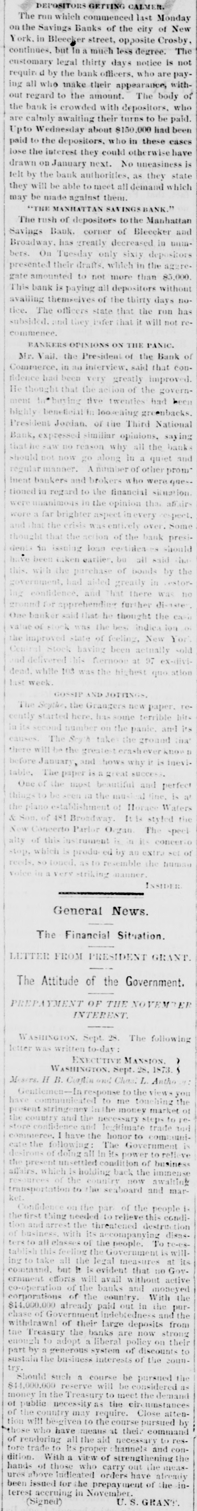 on the Savings Banks of the city of New York. in Bleecker street, opposite Crosby, continues. but In a much less degree. The customary legal thirty days notice is not require d by the bank officers, who are paying all who make their appearance, without regard to the amount. The body of the bank is crowded with depositors, who are calmly awaiting their turns to be paid. Upto Wednesday about 8150.000 had been paid to the depositors, who in these cases lose the interest they could otherwise have drawn on January next. No uneasiness is telt by the bank authorities, as they state they will be able to meet all demand which may be made against them. "THE MANHATTAN SAVINGSBANK." The rush of depositors to the Manhattan Savings Bank. corner of Bleecker and Broadway. has greatly decreased in mm bers. On Tuesday only sixty depositors presented their drafts. which in the stare. gate amounted to not more than 85,000. This bank is paying all depositors without availing themselves of the thirty days notice. The officers state that the run has subsided. and they infer that it will not recommence. BANKERS OPINIONS ON THE PANIC. Mr. Vall. the President of the Bank of Commerce, in an interview. said that confidence had been very greatly improved. He thought that the action of the government Mathing the twenties had been highly beneficial in loosening greenbacks. President Jordan. of the Third National Bank, expressed similiur opinions, saying that he saw no reason why all the bank should not now go along in a quiet and regular manner. number of other prom meat bankers and brokers who were quess tioned in regard to the financial situation unanimous in the opinion that affairs wore a far brighter aspect in every respect. and that the crisis vas entirely over. Some thought that the action of the bank president. in issuing loan certificate - should have been taken earlier. be all said the this. with the purchase of bonds by the government, had aided greatly in estorIng confidence. and that there was no ground for apprehending further di-rate One banker said that he thought the case value stock was the best indica ion the improved state of feelings New Yor Central Stock having been actually and delivered : his hernoon at 97 ex-dividead. while 103 was the highest quoi last week. GOSSIP AND JOI THINGS. The Scythes the Grangers new paper. cently started here. has some terrible in its second number on the panic. and causes The Soy'h take the ground that there will be the greatest erashever Know before January, and hows why in is inevitable. The paper is a great success One of the most beautiful and perfect things to be seen 18 the musi it line. is at the piano establishment of Horace Waters & Son. of 481 Broadway. It le styled the New Cancerto Parlor Organ The speel alty of this strument is 11 its concer stop. which is produ ed by an extra set reeds. o looed. as to resemble the human volce -triking manner. INSIDER General News. The Financial Sitration. LETTER FROM PRESIDENT GRANT. The Attitude of the Government. PREPAYMENT OF THE NOVEMBER INTEREST. WASHINGTON Sept. 28. The following letter written to-day : EXECUTIVE MANSION. , ASHINGTON. Sept. 28. 1873. Mears. II B. Cartin and Chas: L. Antho Gentlemen-In response to the views you have communicated to me touching the present stringency in the money market of the country and the necessary steps to store confidence and legitimate trade and commerce. I have the honor to communicate the following: The Government is desirons of doing all in its power to relieve the present unsettled condition of business affairs. which is holding back the immense resources of the country now awaiting transportation to the seaboard and market. Confidence on the par of the people the first thing needed to relieve this candition and arrest the threatened destruction of business with its accompanying disastersto all classes of the people. To re-establish this feeling the Government is willing to take all the legal measures at its command. but it is evident that no Government efforts will avail without active co-operation of the banks and moneyed corporations of the country With the $14,000,000 already paid out in the purchase of Government Indebtedness and the withdrawal of their large deposits from the Treasury the banks are now strong enough to adopt a liberal policy on their part by a generous system of discounts to sustain the business interests of the country. Should such a course be pursued the 844,000,000 reserve will be considered as money in the Treasury to meet the demand of public necessity as the circumstances of the country may require. Close attention will besgiven to the course pursued by those who have meaus at their command of rendering all the aid necessary to restore trade to its proper hannels and condition. With a view of strengthening the hands of those who carry out the measures above Indicated orders have already been issued for the prepayment of the interest accruing in November. (Signed) U.S. GRANT.