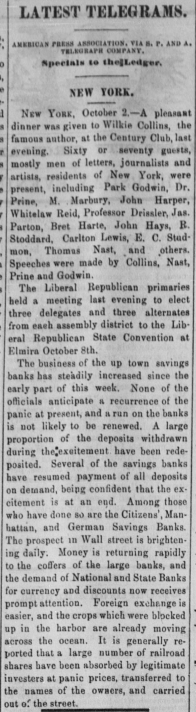LATEST TELEGRAMS. AMERICAN PRESS ASSOCIATION. VIA S. P. AND A. TELEGRAPH COMPANY. Specials to the]Ledger. NEW YORK. New YORK, October 2.-A pleasant dinner was given to Wilkie Collins, the famous author, at the Century Club, last evening. Sixty or seventy guests, mostly men of letters, journalists and artists, residents of New York, were present, including Park Godwin, Dr. Prine, M. Marbury, John Harper, Whitelaw Reid, Professor Drissler, Jas. Parton, Bret Harte, John Hays, R. Stoddard, Carlton Lewis, E. C. Studmon, Thomas Nast, and others. Speeches were made by Collins, Nast, Prine and Godwin. The Liberal Republican primaries held a meeting last evening to elect three delegates and three alternates from each assembly district to the Liberal Republican State Convention at Elmira October 8th. The business of the up town savings banks has steadily increased since the early part of this week. None of the officials anticipate & recurrence of the panic at present, and a run on the banks is not likely to be renewed. A large proportion of the deposits withdrawn during the,exeitement have been redeposited. Several of the savings banks have resumed payment of all deposits on demand, being confident that the excitement is at an end. Among those who have done so are the Citizens', Manhattan, and German Savings Banks. The prospect in Wall street is brightening daily. Money is returning rapidly to the coffers of the large banks, and the demand of National and State Banks for currency and discounts now receives prompt attention. Foreign exchange is easier, and the crops which were blocked up in the harbor are already moving across the ocean. It is generally reported that a large number of railroad shares have been absorbed by legitimate investers at panic prices, transferred to the names of the owners, and carried out of the street.