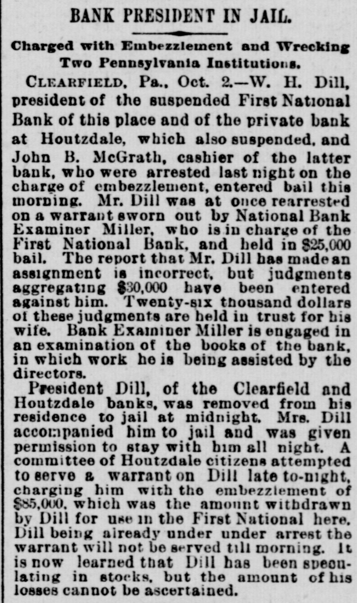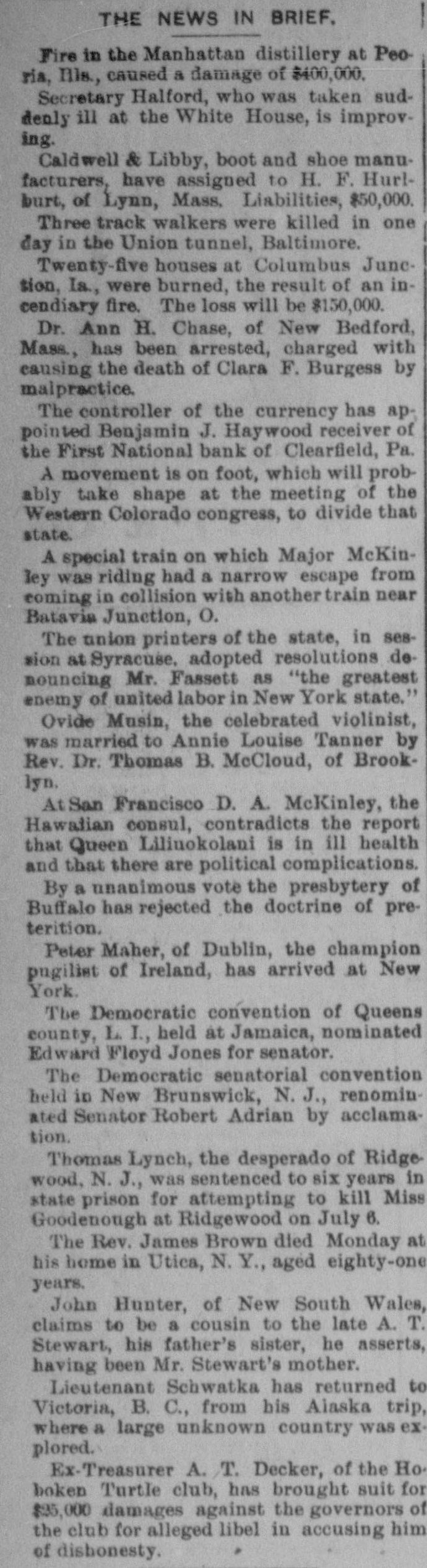 MEN AND THINGS. Geo. Wm. Curtis has been re-elected president of the civil service reform league. Philips & Cunninghan's oil warehouse, Philadelphia, burned Monday. Loss $500,000. The failures for the month of September number ,754, against 2, 196 for the same month last year. The boycott of the Anheuser-Busch brewing company has been declared off by the knights of labor. Henrietta Merrill, colored, was hanged Monday at Smithville, Va., for the murder of her 8 year-old child. Gov. Steel is at the head of a movement to have the territory of Oklahoma admitted to the union as a state. The navy department estimate for furwishing war vessels already under construction will be $16,000,000 this year. Yale seniors enjoyed their annual shirt rush last week. It was as silly and disgusting as any of its predecessors. James S. Sinclair, who owned a small farm in Lakota, N. D., has succeeded to the title and estate of the earl of Caithness. The exports from the United States during the 12 months ending Aug. 31 were valued at $909,264,438; imports, $839,039,241. S. V. White & Co. will resume business this week. Their assets, it is believed, will be nearly a half million above liabilities. Ralph Ray, of Durango, Col., who murdered his mother, has been arrested and pleads guilty. His father has become insane. Express Messenger Hottel, whose run was between Waco and Gatesville, Tex., has skipped with two packages containing $5,300. Andrew Anderson, Martin Nelson, and an unknown man were drowned by the capsizing of a rowboat at Ashland, Wis., Monday. The refunded 41/2 per cent bonds at 2 per cent amounts to $25,098,950, up to Monday night; the amount redeemed, $17,696,900. Maj. William McKee Dunn, of the Third artillery, U. S. A., died at Cushing's Island, Me., Wednesday. He entered the service at 18. Judge Paschal, of Texas, has refused to naturalize a socialist, R. V. Sauer, because his principles are opposed to those of the United States. The refunding of the 4Β½ per cent bonds at 2 per cent closed Wednesday. The amount continued is $25,364,500; redeemed, $18,009,600. The First national bank of Clearfield, Pa., closed its doors Wednesday, being unable to stand a run which had been made since last Saturday. T. v. Powderly says the knights of labor and farmers' alliance will hold a convention in Washington February 1st and nominate a candidate for president. The receipts of the government since September 1 amount to $28,385,000, an excess of $4,287,000 over ordinary expenditures during the same time. The United States treasury has $42,000,000 on hand. Which is about $100,000,000 more than it had when President Buchanan vacated the white house. There have been shipped from Duluth, Minn., during the past six weeks 6,500,000 bushels of wheat, of which, it is estimated, 4,000,000 bushels were for direct export. The auditor general of Pennsylvania testified before the legislative committee yesterday that for more than 30 years the state treasurers had bean in arrears during their terms. The sorghum sugar output in Kansas this year will be $,000,000 pounds, of beet sugar it is estimated that Nebraska, Utah and California will produce 24,000,000 pounds. Miners have been parading the streets in Houtsdale, Pa., vewing vengeance on the officials of the Dill bank at Clearfield, which have closed and in which they had all their savings. Ignatius Donnelly has sent a circular to farmers, urging them to hold their wheat for 30 days S longer. He says that farmers are now being robbed of one-third the value of their product. A merchant in Chicago turned over to United States secret service officers several thousand spurious 25c 50c and 10c pieces, a which had been passed in bis store for several years past.
