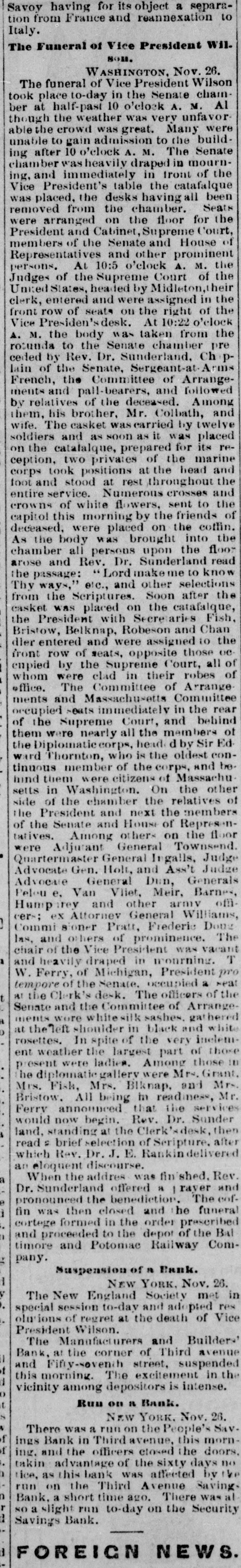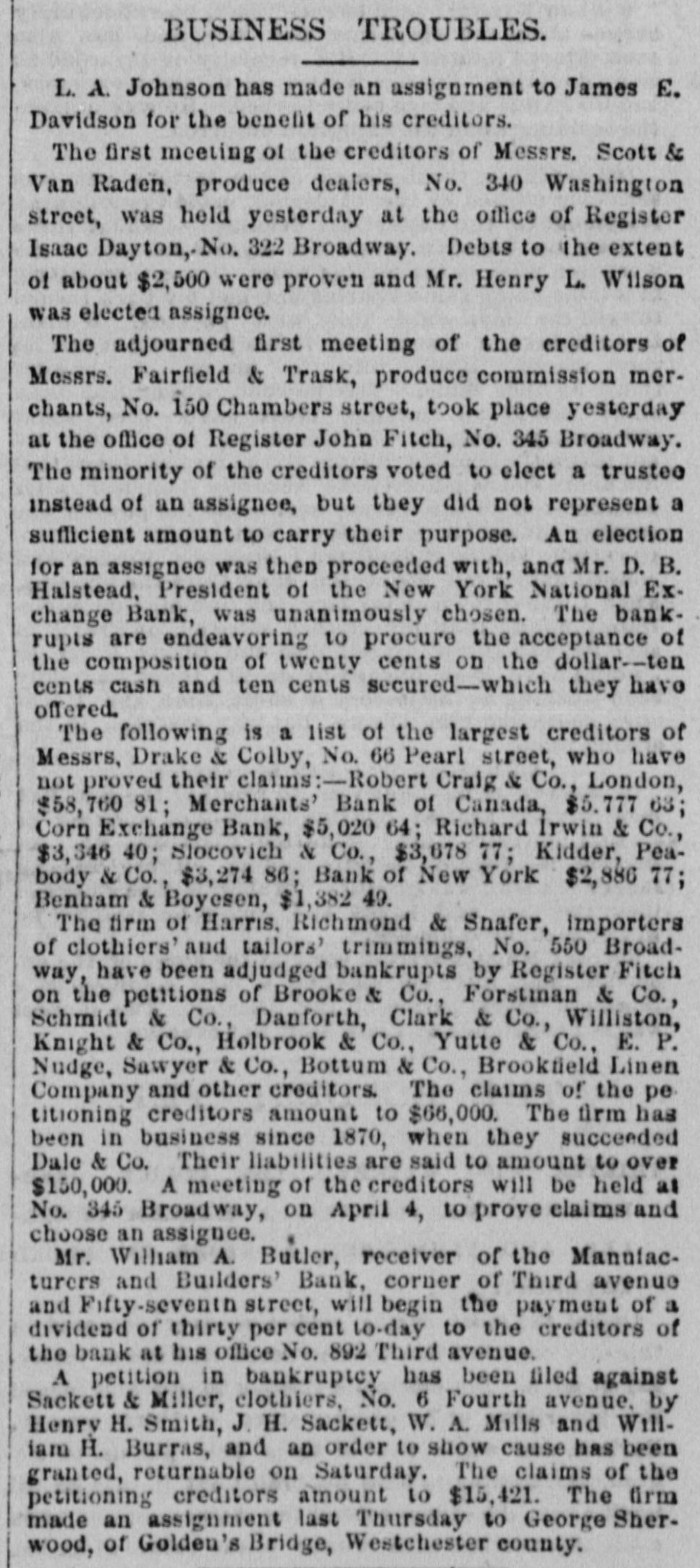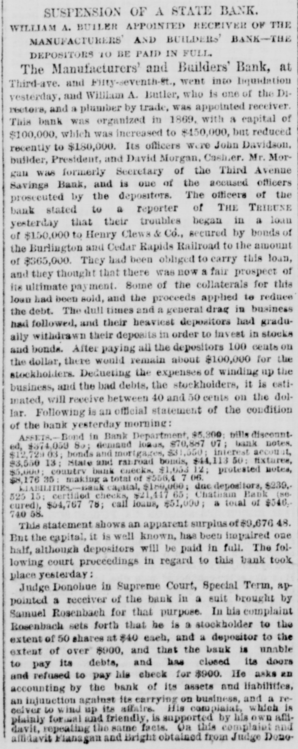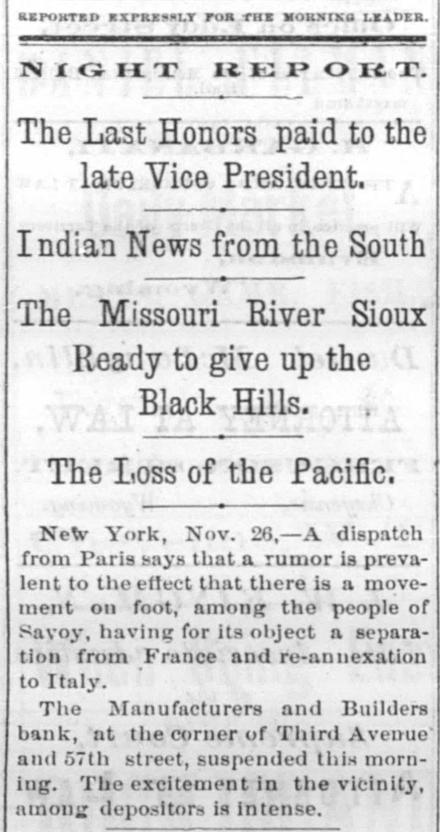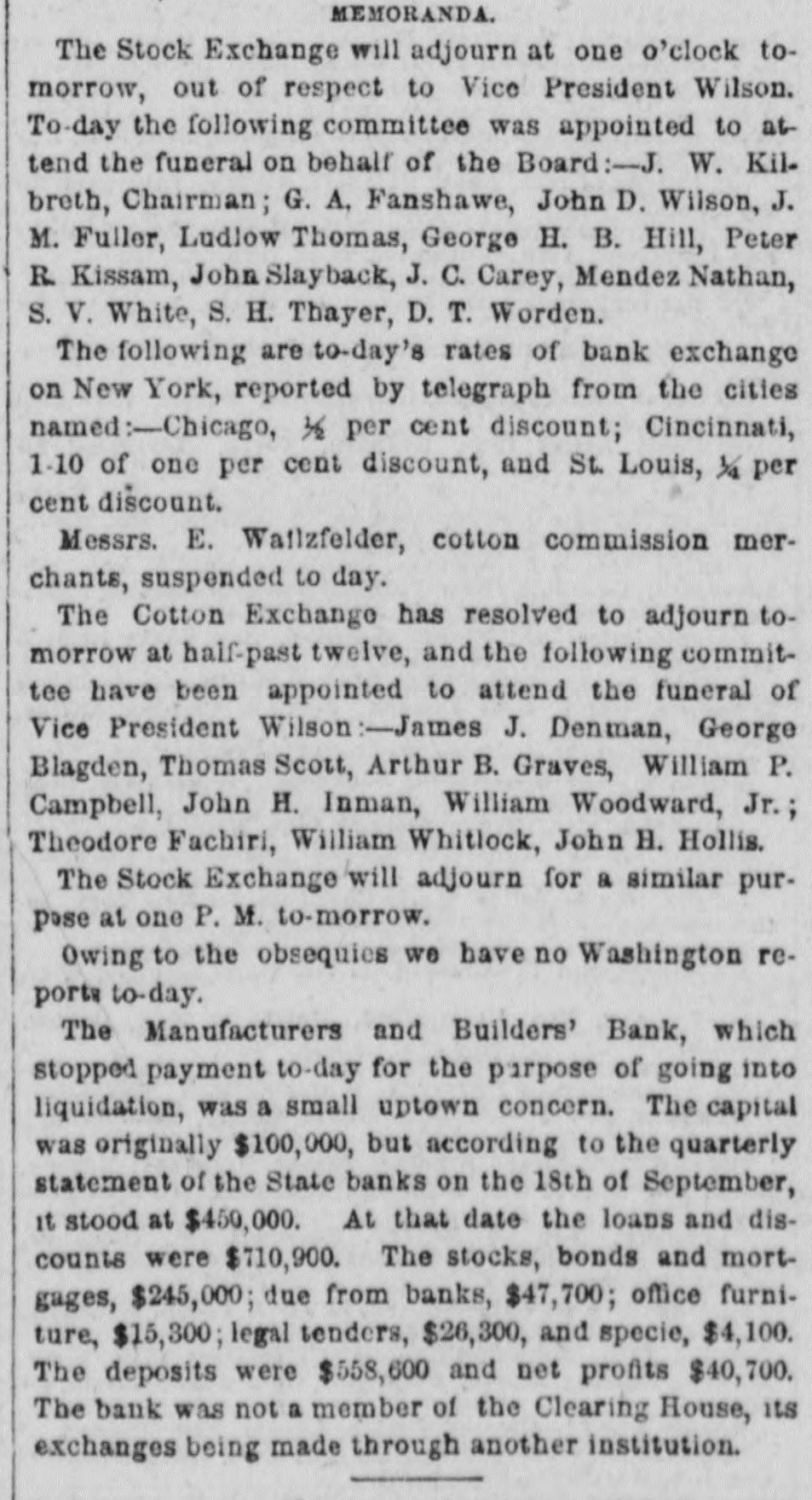 MONEY MARKETS. BY TELEGRAPH. PARIS, November 26.-Rentes, 66f. 17½/2c. NEW ORLEANS, November 26.-Gold, 1151/4; 549. sight, discount; sterling, commercial, 518@ LONDON, November 26.--The rate of discount in the open market for three months bills is 21/4@2% or 3/40% per cent. below the Bank of England rates. The amount of bull on withdrawn from the Bank of England on ba!ance to-day is £10,000. Consols for money and account, 91%; 5-20s of '65, 103½; do. 1867, 1091/4; 10-40s, 1051/4; new 5s, 104; New York Central, 95; Erie, 14%; Erie preferred, 30. NEW YORK, November 26.-Money, 31/2@5 per cent. Prime mercantile paper, 51/2@8 per cent. The customhouse and sub-treasury were closed. Clearings, $30,000,000. Gold was steady at 114½ Rates for carrying, 1@2 per cent.; loans were also made flat. Government bonds were firm with a moderate business; coupons of 1881, 1231/4; do. 1865, 116½; 1865, new, 1203/4; do. 1867, 1225/8; do. 1868, 1221/2; new 5's, 1163/4; 10-40s, regular, 1164/4; coupons. 1171/4; currency 6s, 1251/8. State securities dull; Tennessee 6s, old, 46%; Tennessee 6s, new, 41/4; Virginia 6s, old, 36; Virginia 6s, new, 30½; Missouri 6s, 1027/8 Railroad bonds were strong. The largest transactions were in Milwaukee and St. Paul, Northwestern and Chesapeake and Ohio firsts. Stocks opened strong and higher, the advance ranging from ½ to ⁷/₈ per cent. in the entire list, with increased business in the leading shares. During the last hour of business the market was quiet, and prices reacted 1/4 to 4/4 per cent. from the highest point of the day. Lake Shore fell off to 62½, Western Union to 76, Erie to 16, Northwestern to 395/8, Union Pacitic to 73, St. Paul to 363/8, St. Paul preferred to €5%, Ohios to 183/4, and Pacific Mail to 403/4. Missouri Pacific declined from 138/8 to 12%. *Adams Express advanced to 102. Messrs. Ewallsidefer, cotton and commission merchants, suspended to-day. Transactions at the stock exchange amounted to 70,000 shares, of which 6000 were Pacific Mail, 10,000 Westem Union, 2000 Northwestern common, 3000 Nortuwestern preferred, 2500 Rock Island, 8500 St. Paul tammon, 3700 St. Paul preferred, 3500 Erie, 24,000 Lake Shore, 6000 Ohios, and 2000 Union Pasific. The Manufactu ers and Builders bank, which suspended payment to-day low the purpose of going into liquidation, was a smail up-town concern. The capital was originally $100,000, but according to the quarterly statement of the state of banks on the eighteenth of Here tember, 1t stood at $450,000, but was afterware reduced to $180,000. At that date the loansand accounts were $710,900; stocks, bonds and mortgages, $245,000; due from banks, $47,700; office furniture, $15,300; legal tenders, $26,300; specie, $4100: deposits, $558,600; net profits, $40 700. The bank was not a member of the clearing-house, its exchanges being made through another institution. Quotations: Western Union Telegraph, 75%; Pacific Mail, 40½; Adams Express company, 1013/4; Wells & Fargo's Express company, 831/4; American HXpress company, 603/4; United States Express company, 51; New York Central, 106; Erie, 16; Erie preferred, 25; Harlem 1331/8; Harlem preferred, 130; Michigan Central, 011/2, Union Pacific stock, 72½; Lake Shore, 62; Illinois Central, 95; Cleveland and Pittsburg, 89%; Northwestern, 391/2; Northwestern pref'd, 54; Cleveland, Columbus, Cincinnati and Indianapolis, 56½; New Jersey Central, 1053/4; Rock Island,105%; St. Paul, 36%; St. Paul preferred, 66½; Wabash, 5½; Wabash preferred, 7: Fort Wayne, 97%; Terre Haute, 5: Terre Haute preferred, 20; Chicago and Alton, 971/4; Chicago and Alton preferred. 105; Ohio and Mississippi, 188/4; Indiana Central, 45/8, Chicago, Burlington and Quincy, 113; Hannibal ana St. Joseph, 231/4; Delaware and Lackawanna, 119%; Atlantic and Pacific Telegraph, 181/4; Central Pacific bonds, 1061/4; Union Pacific bonds, 1083/2.