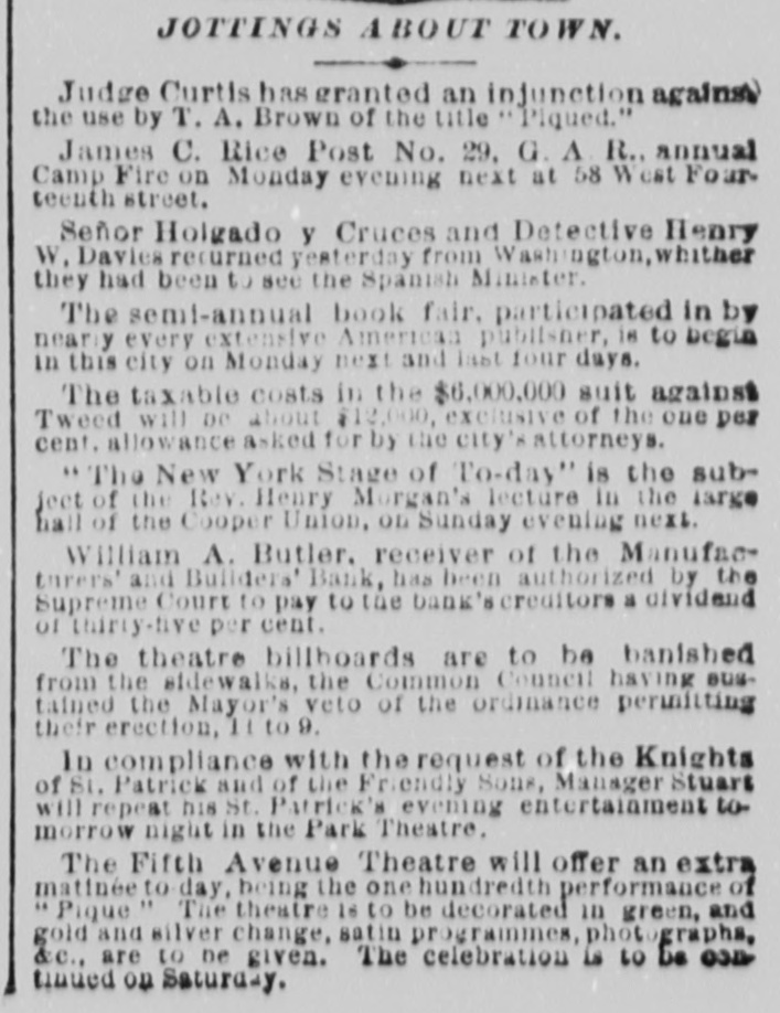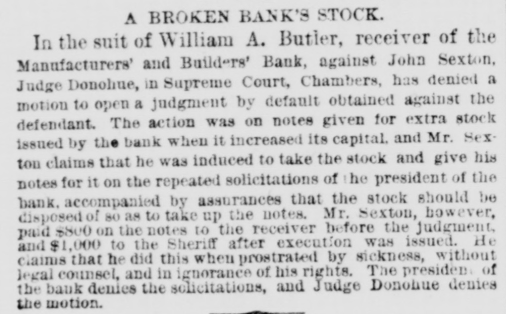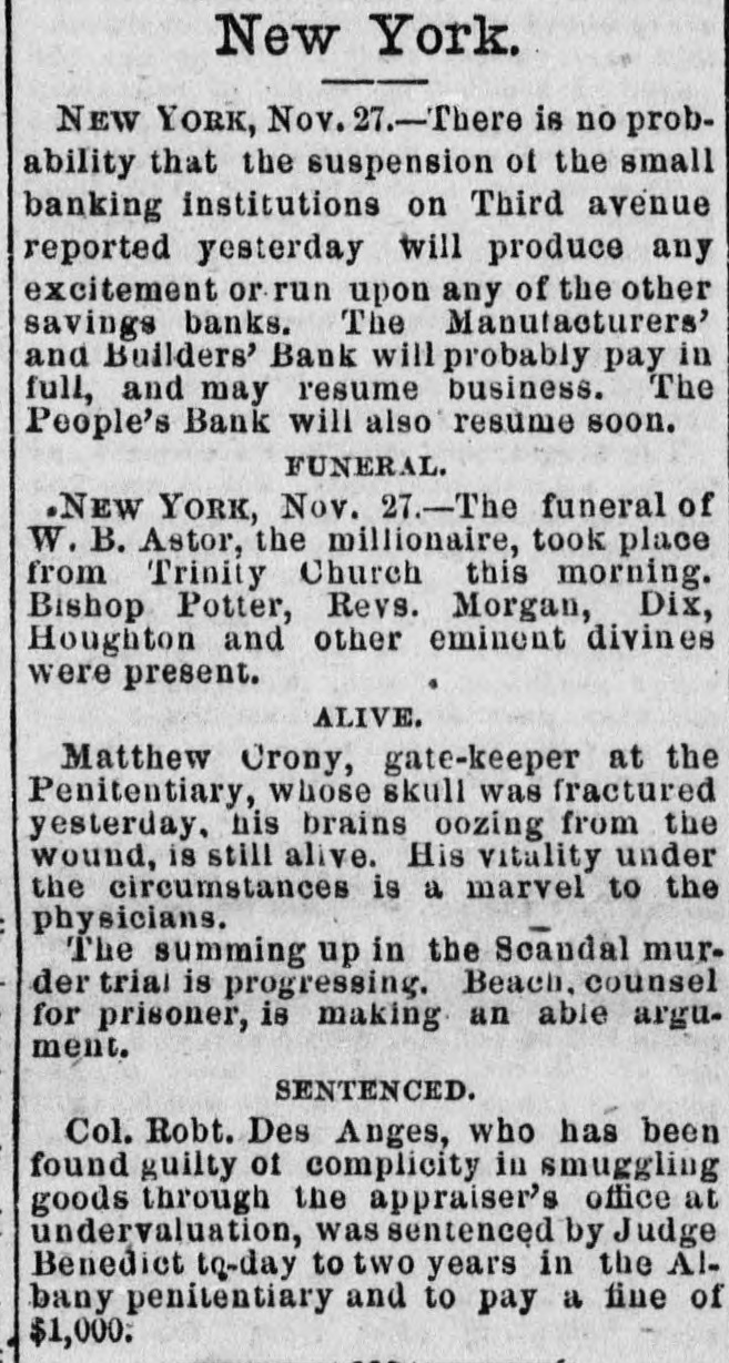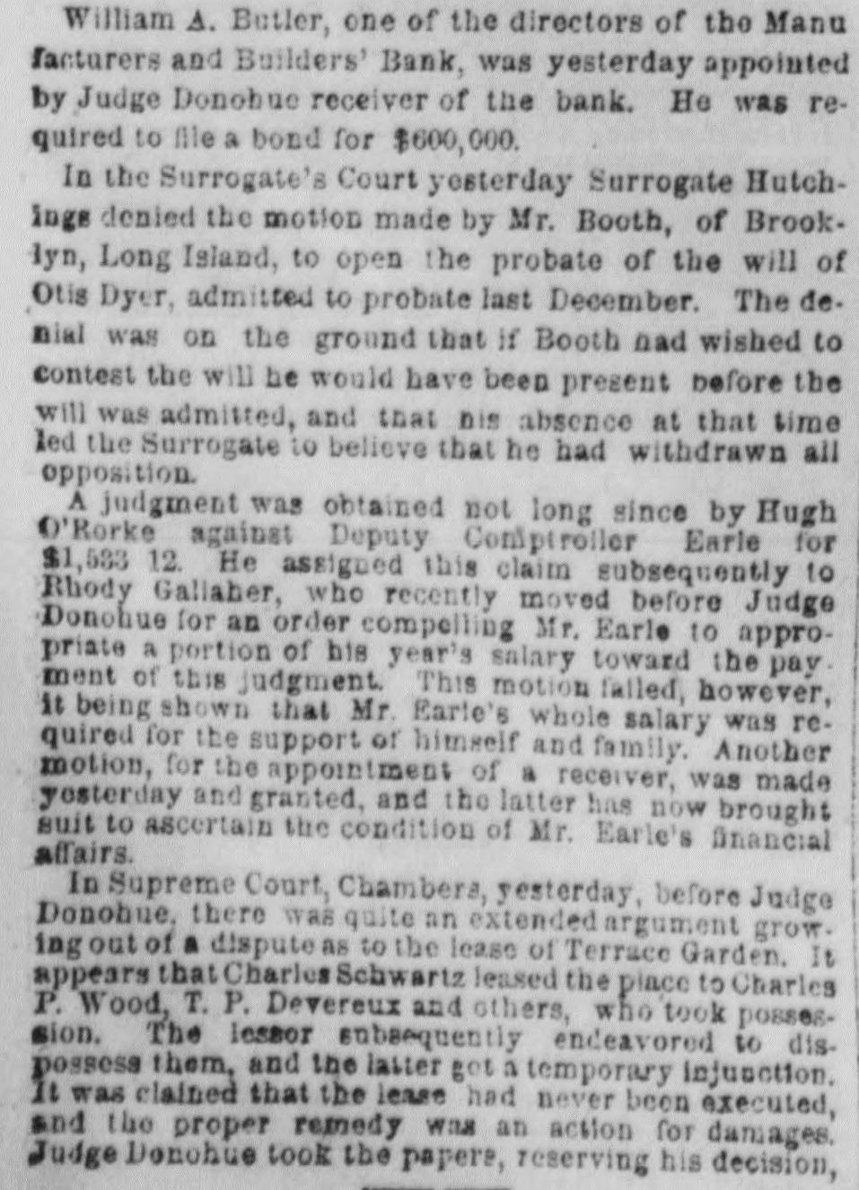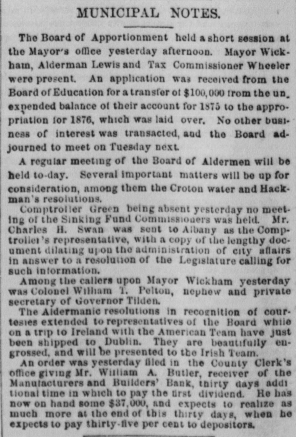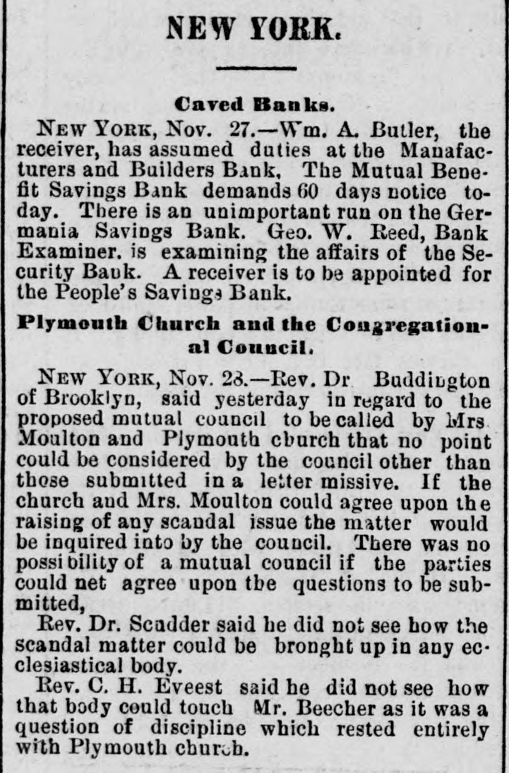 MONEY MARKETS. BY TELEGRAPH. PARIS, November 26.-Rentes, 66f. 17½/2c. NEW ORLEANS, November 26.-Gold, 1151/4; 549. sight, discount; sterling, commercial, 518@ LONDON, November 26.--The rate of discount in the open market for three months bills is 21/4@2% or 3/40% per cent. below the Bank of England rates. The amount of bull on withdrawn from the Bank of England on ba!ance to-day is £10,000. Consols for money and account, 91%; 5-20s of '65, 103½; do. 1867, 1091/4; 10-40s, 1051/4; new 5s, 104; New York Central, 95; Erie, 14%; Erie preferred, 30. NEW YORK, November 26.-Money, 31/2@5 per cent. Prime mercantile paper, 51/2@8 per cent. The customhouse and sub-treasury were closed. Clearings, $30,000,000. Gold was steady at 114½ Rates for carrying, 1@2 per cent.; loans were also made flat. Government bonds were firm with a moderate business; coupons of 1881, 1231/4; do. 1865, 116½; 1865, new, 1203/4; do. 1867, 1225/8; do. 1868, 1221/2; new 5's, 1163/4; 10-40s, regular, 1164/4; coupons. 1171/4; currency 6s, 1251/8. State securities dull; Tennessee 6s, old, 46%; Tennessee 6s, new, 41/4; Virginia 6s, old, 36; Virginia 6s, new, 30½; Missouri 6s, 1027/8 Railroad bonds were strong. The largest transactions were in Milwaukee and St. Paul, Northwestern and Chesapeake and Ohio firsts. Stocks opened strong and higher, the advance ranging from ½ to ⁷/₈ per cent. in the entire list, with increased business in the leading shares. During the last hour of business the market was quiet, and prices reacted 1/4 to 4/4 per cent. from the highest point of the day. Lake Shore fell off to 62½, Western Union to 76, Erie to 16, Northwestern to 395/8, Union Pacitic to 73, St. Paul to 363/8, St. Paul preferred to €5%, Ohios to 183/4, and Pacific Mail to 403/4. Missouri Pacific declined from 138/8 to 12%. *Adams Express advanced to 102. Messrs. Ewallsidefer, cotton and commission merchants, suspended to-day. Transactions at the stock exchange amounted to 70,000 shares, of which 6000 were Pacific Mail, 10,000 Westem Union, 2000 Northwestern common, 3000 Nortuwestern preferred, 2500 Rock Island, 8500 St. Paul tammon, 3700 St. Paul preferred, 3500 Erie, 24,000 Lake Shore, 6000 Ohios, and 2000 Union Pasific. The Manufactu ers and Builders bank, which suspended payment to-day low the purpose of going into liquidation, was a smail up-town concern. The capital was originally $100,000, but according to the quarterly statement of the state of banks on the eighteenth of Here tember, 1t stood at $450,000, but was afterware reduced to $180,000. At that date the loansand accounts were $710,900; stocks, bonds and mortgages, $245,000; due from banks, $47,700; office furniture, $15,300; legal tenders, $26,300; specie, $4100: deposits, $558,600; net profits, $40 700. The bank was not a member of the clearing-house, its exchanges being made through another institution. Quotations: Western Union Telegraph, 75%; Pacific Mail, 40½; Adams Express company, 1013/4; Wells & Fargo's Express company, 831/4; American HXpress company, 603/4; United States Express company, 51; New York Central, 106; Erie, 16; Erie preferred, 25; Harlem 1331/8; Harlem preferred, 130; Michigan Central, 011/2, Union Pacific stock, 72½; Lake Shore, 62; Illinois Central, 95; Cleveland and Pittsburg, 89%; Northwestern, 391/2; Northwestern pref'd, 54; Cleveland, Columbus, Cincinnati and Indianapolis, 56½; New Jersey Central, 1053/4; Rock Island,105%; St. Paul, 36%; St. Paul preferred, 66½; Wabash, 5½; Wabash preferred, 7: Fort Wayne, 97%; Terre Haute, 5: Terre Haute preferred, 20; Chicago and Alton, 971/4; Chicago and Alton preferred. 105; Ohio and Mississippi, 188/4; Indiana Central, 45/8, Chicago, Burlington and Quincy, 113; Hannibal ana St. Joseph, 231/4; Delaware and Lackawanna, 119%; Atlantic and Pacific Telegraph, 181/4; Central Pacific bonds, 1061/4; Union Pacific bonds, 1083/2.