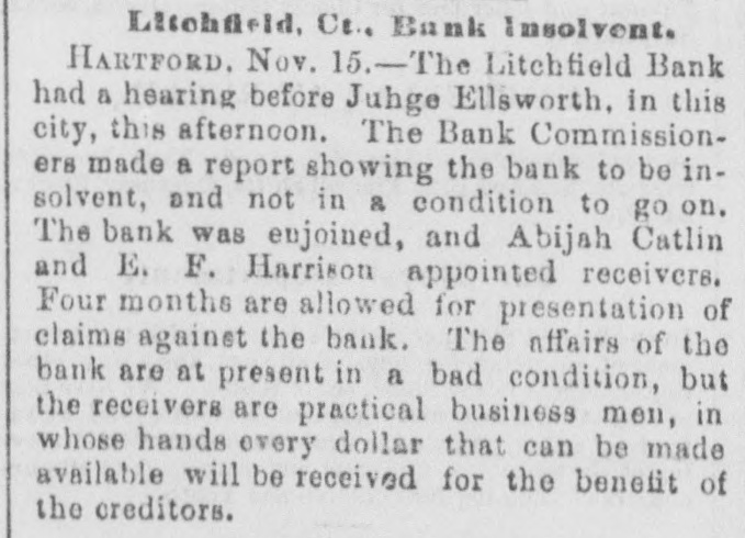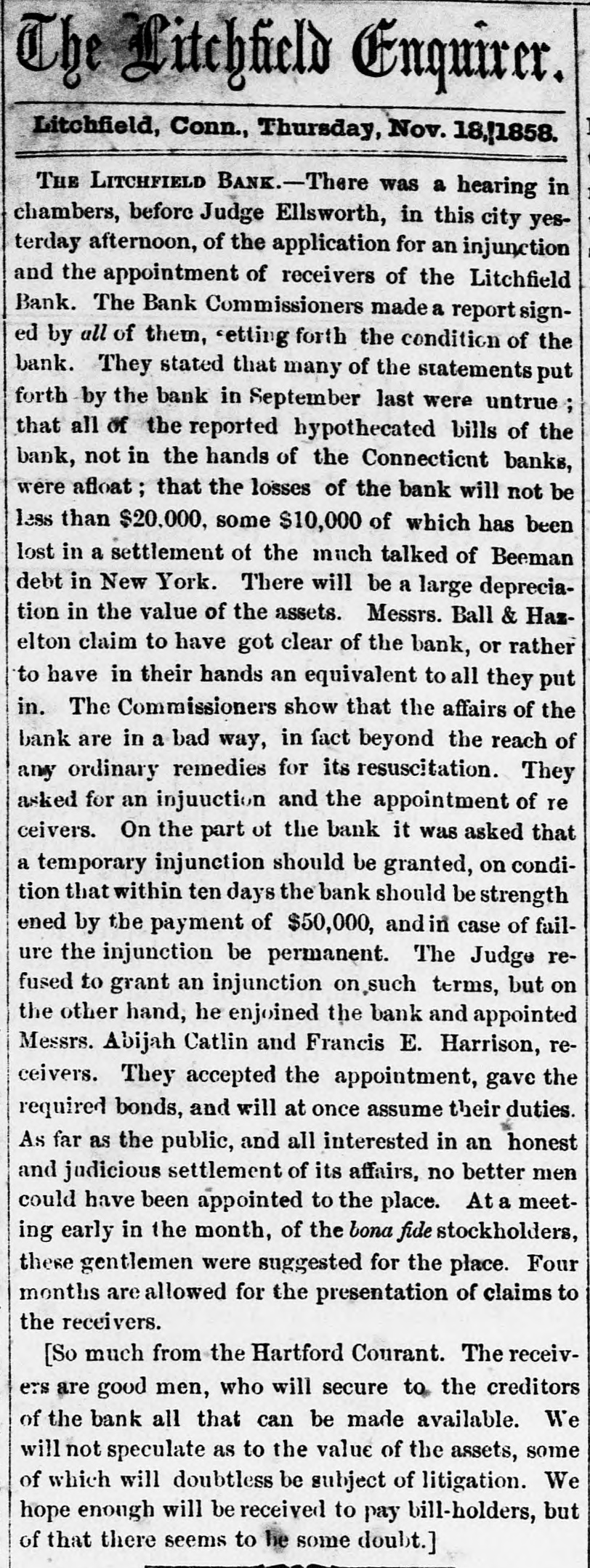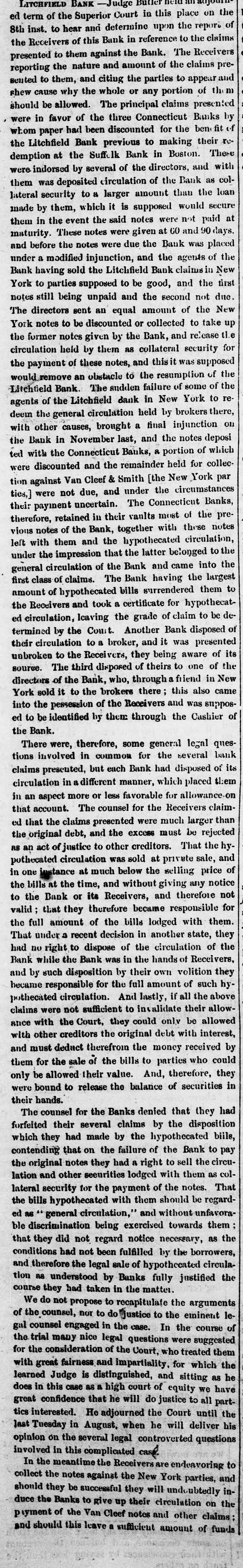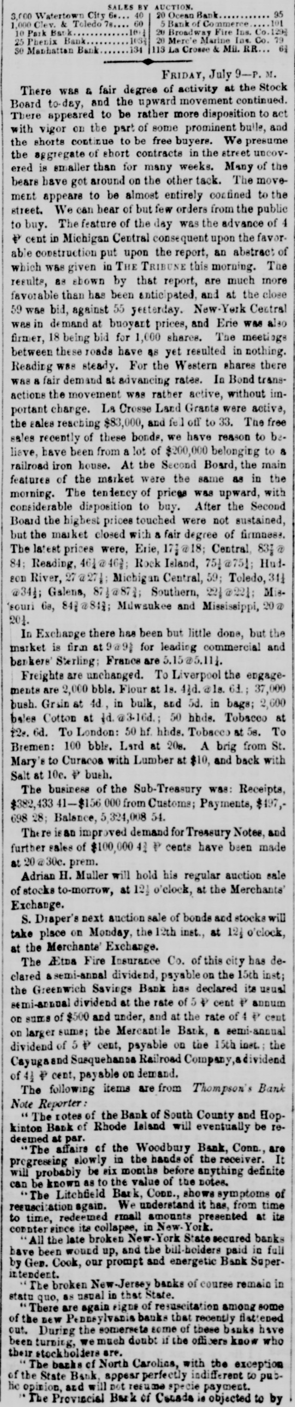 FROM OPENING OF NAVIGATION TO MAY 17, 62,012 1356. Flour, bbls 883,199 Wheat. bush Com bush FROM OPENING OF NAVIDATION TO JULY 29,150 1, 1857. Flour, bble.. 217 250 Wheat, bush 433 Corn, bush This shows a large increase in Flour and Wheat, and an equally large fallir g off in Corn. The reason is not yet sufficiently advance to justify the prediction that the comparative increase thus far will continue through the season. It is sife, however, to ealculate 88 long 88 Flour remains at its present low figure, and the money market is such 88 to secure 60 and 90 day credits, that the great bulk of the Flour and Wheat at the West will continue to seek tidewater through the Canals. The annexed abstract of the Connecticut Bank Commissioners' Report gives a very unfavorable report of the management and condition of some of the banks of that State: From The New Haven Journal and Courier. The Commissioners refer in the first place to the financial panic, at the commencement of which our banks bad an out tanding circulation of $10,000,000; the sudden withdrawal of pub is confidence caused & sudden contraction of currency, which proved 8 84 urce of great temporary embarrassment. On the 1st day of July, the circulation of the banks of this State was $10,411,000; on the let of January it W&S reduced to $4,130,265, 8 contraction of over $6 000 000, and most of which took place between the 1st of August and the 1st of November. The ability of the banks to sustain the mselves, without break ng down their custom under a contraction 80 un precedented, exhibited a degree of soundness and stability which must place them bigh in the confidence of the iblie of this and other States. Prior to the general suspension, several banks be. came embarrassed. The Hartford County Bank, &S early ES September, was unable to provi te for an outstanding circulation of $440,000, and an examination showed great mismanagement and duplicity on the part of the directors. Large claims, amounting in one instance to over $80,000, had been entirely concealed by being placed in the na nes of responsible parties, under an agreement that they should be held harm ess. In other instances, large amoun's of debts, the character of which the Commissioners could know nothing about without investigations out of the bank, were represented by the directors to be good and available, when in fact it was evident to them that they were either wortbless or nearly 80. Notwitzstanding this the Directors declared 8 dividen last July, ereupon the Com missioners obtained an injunction and bad receivers appointed. By g bod management, the Bank has been relieved, with the loss of half its capital and has been allowed to 10sume its business with $300,000 capital stock. It is a question of some importance to determine who shall pay the $6,000 or $7,000 in notes of this Bank, stolen by W. S. Carter, a Clerk in the Treasury Department. The Bank of North America, at Seymour, which had been the subject of remark in the previous re. port of the Commissioners, was found, in September last, to have loaned large sums out of the State. on unavailable security, leaving the Bank without the means to redeem its circulation. Its general management was bad, auspended debtir creased. and capital stock impaired. Its immediate liabilities were over $70,000 and they had on hand only $1,072 in specie. An injurction was issued. On the 10th of April the case was aled and it was found the eivers hid reduced the liabilities of the Bank for circulation, posits and balances, down to $48,541. The assets of the Bank now amount to $169,000. The Commissioners say that the Exchange Bank of Hartf had carried A heavy amount of protested paper of a doubtful charae er form series of years. It is their opinion that the bank should have ceased to make dividends more than two years ago A civide nd was passed in January, 1857. but in July of that year a dividend of 4 P cent was declared and paid As this dividend impaired the capital, the Commissioners consider it to have been injudicious and illegal. A further examination developed a defalcation of about $25 000 in the accounts of the Cashier. This developme nt indicated great on the part of the offiand direct rs of the Bank, for the defalcati n had extended through several years, and might have been exposed had the monthly statem ente been examined and tested with their own books. At the time the Bank wasenjoined, its liabilities amounted to 250 000, and their specie funds were reduced down to $ 12 939. ben the Bank resumed specie payment, its liabilities were redue to $141,811, and their available funds amounted to $57,000. It was largely secured against ultimate loss by collate rals. It has from the beginning indulged in the illegal and dangerous practice of buying New York, and in -bruary last it declared a dividend, though it bad on hand over $ 200 000 of pr The Mercantile Bank, at first embarraseed by the failure of its correspondent in New-York, will not sustain losses sufficient to seriously impair itscapital As to the Colchester Bank, the Commissioners, after the char gealn itsadmir istration, by direction of the last Legislature, were still unatisfied with its condition. In September It ceased itsredemptions in Boston and was discredited in York. Its general circulation at that time. by its books was $14,000, of which $6,000 had been redeemed by New York banks but this was evidently not the real condition of affairs. On the 31 of De ember an xamination was again made, and it was found that Cashier S. F. Jopes had caused to be printed fr you the original Plates, by a firm of lithographers in Hartford bills amounting to $101 102 fact which the President Cashier and Directors must have been fully aware. The Commissioners looked upon this transaction as fraudulent. applied for an injenction, and had Jones arrested in New-York; but he was released before the préper papers could be procured from the Governor J. H. Baell, the former President,