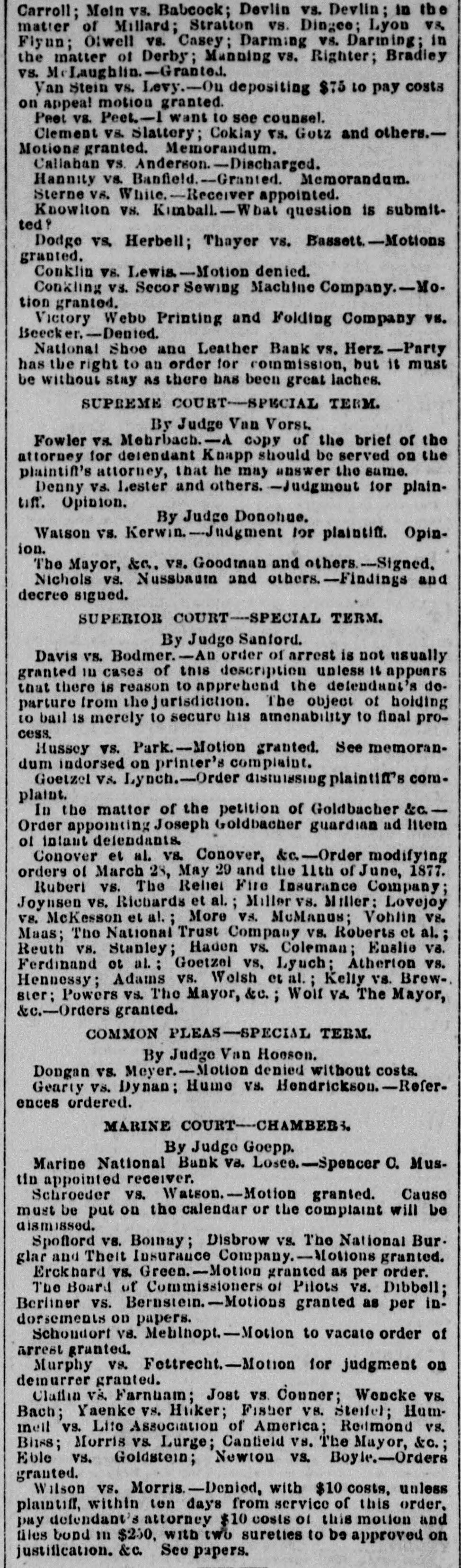 Carroll; Mein vs. Babcock; Devlin vs. Devlin; in the matter of Millard; Stratton vs. Dingeo; Lyon vs. Fiyun; O:well vs. Casey; Darming vs. Darming; in the matter of Derby; Manning vs. Righter; Bradley vs. McLaughlin.-Grante.L. Van Stein vs. Levy. depositing $75 to pay costs on appeal motion granted. Peel vs. Peet.- want to see counsel. Clement vs. Slattery; Coklay vs. Gotz and others.Motions granted. Memorandum. Callahan vs. Anderson.-Discharged. Hannity vs. Banfield.--Granted. Memorandum. Sterne VS. White.-Receiver appointed. Knowlton VS. Kimball.-What question is submitted? Dodge vs. Herbell; Thayer vs. Bassett.-Motions granted. Conklin VS. Lewis-Motion denied. Conkling vs. Secor Sewing Machine Company.-Mo. tion granted. Victory Webb Printing and Folding Company vs. Beecker.-Dented. National Shoe and Leather Bank vs. Herz-Party has the right to an order for commission, but it must be without stay as there has been great laches. SUPREME COURT-SPECIAL TERM. By Judge Van Vorsi. Fowler vs. Mehrbach. -A copy of the brief of the attorney for defendant Knapp should be served on the plaintin's attorney, that he may answer the same. Denny VS. Lester and others. -Judgmout for plaintiff. Opinion. By Judge Donohue. Watson vs. Kerwin.-Judgment for plaintiff. Opinion. The Mayor, &a. vs. Goodman and others.-Signed. Nichols vs. Nussbaum and others.-Findings and decree signed. SUPERIOR COURT-SPECIAL TERM. By Judge Sanford. Davis vs. Bodmer.-A order of arrest is not usually 111 cases of this description unless 16 appears is reason to apprehend the that granted there defendant's ot holding departure from thejurisdiction. The object to bail is merely to secure his amenability to final process. Hussey vs. Park.-Motion granted. See memorandum indorsed on printer's complaint. Goetzel vs. Lynch.-Order disturesing plaintiffs complaint. In the matter of the petition of Goldbacher &c.Order appointing Joseph Goldbacher guardian ad Item of intant defendants. Conover et al. vs. Conover, &c.-Order modifying orders of March 28, May 29 and the 11th of June, 1877. Rubert vs. The Reliei Fire Insurance Company; Joyusen vs. Richards et al.; Miller vs. Miller: Lovejoy vs. McKesson et al.; More vs. McManus; Vohlin vs. Maas; The National Trust Company vs. Roberts et al.; Reuth vs. Stanley; Haden vs. Coleman; Euslie V8. Ferdinand et al.: Goetzel vs. Lyuch; Atherion vs. Hennessy; Adains vs. Welsh et al. ; Kelly vs. Brew-. ster; Powers vs. The Mayor, &c.; Wolf VA. The Mayor, &c.-Orders granted. COMMON PLEAS-SPECIAL TERM. By Judge Van Hoesen. Dongan vs. Meyer.-Mot denied without costs Gearty vs. Dynan; Hume vs. Hondrickson.-References ordered. MARINE COURT CHAMBEB3. By Judge Goepp. Marine National Bank V8. Losee.-Spencer C. Mustin appointed receiver. Schroeder vs. Watson.-Motion granted. Cause must be put on the calendar or the complaint will be dismissed. Spoflord vs. Boinay; Disbrow vs. The National Bur. glar and Theit Insurance Company.-Motions granted. Erckhard vs. Green.-Motion granted as per order. The Board of Commissioners of Pilots vs. Dibbell; Berliner vs. Bernstein.-Motions granted as per indorsements on papers. Schoudorf VS. Mebihopt.--M to vacate order of arrest granted. Murphy vs. Fettrecht.-Motton for judgment on demurrer granted. Clailin VA. Farnuam; Jost vs. Couner; Wencke vs. Bach; Yaenke vs. Hiker; Fisher vs. Steilel; Humvs. Life Association of America; Reimond vs. Morris vs. Lurge; vs. vs. vs. granted. Eble mell Bliss; Goldstein; Newton Cantield The Boyle.-Orders Mayor, &c.; Wilson vs. Morris.-Denied with $10 costs, unless plaintiff, within ton days from service of this order. pay defendant's attorney $10 costs 01 this motion and files bond 111 $230, with two sureties to be approved on justification. &c. See papers.