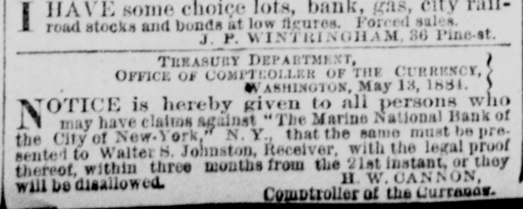 HAVE some choice lots, bank, gas, city ranI road stocks and bonds at low figures. Forced sales. J. P. WINTRINGHAM, 36 Pine-st. TREASURY DEPARTMENT, OFFICE OF COMPTEOLLER OF THE CURRENCY, VASHINGTON, May 18, 1881. against "The Marine National Bank of NOTICE is hereby NOTICE is her given to all persons who the City of New.York,' N.Y., that the same must be presented to Walter S. Johnston, Receiver, with the legal proof thereof, within three months from the 21st instant, or they H. W. CANNON, will be disallowed. Comptroller of the Curranos.