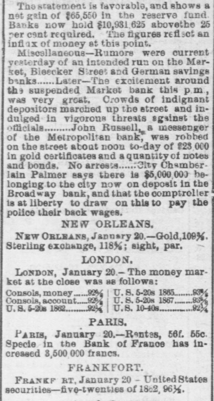 The statement is favorable, and shows a net gain of $65,550 in the reserve fund. Banks now hold $10,931,625 abovethe 25 per cent required. The figures reflect an influx of money at this point. Miscellaneous—Rumors were current yesterday of an intended run on the Market, Bleecker Street and German savings banks...... Later—The excitement around the suspended Market bank this p.m., was very great. Crowds of indignant depositors marched up the street and indulged in vigorous threats against the officials........ John Russell, a messenger of the Metropolitan bank, was robbed on the street about noon to-day of $23,000 in gold certificates and a quantity of notes and bonds. No arrests...... City Chamberlain Palmer says there is $5,000,000 belonging to the city now on deposit in the Broadway bank, and that the comptroller is at liberty to draw on this to pay the police their back wages. NEW ORLEANS. NEW ORLEANS, January 20.—Gold, 109%. Sterling exchange, 118%; sight, par. LONDON. LONDON, January 20.— The money market at the close was as follows: Consols, money 92% | U. S. 5-20s 1865.......93% Consols, account..... 92% U. S. 5-20s 1867.......93% U. S. 5-20s 1862.......92% U. S. 10-40s 92% PARIS. PARIS, January 20.—Rentes, 56f. 55c. Specie in the Bank of France has increased 3,500,000 francs. FRANKFORT. FRANKF RT, January 20 - United States securities-five-twenties of 1862, 96%.