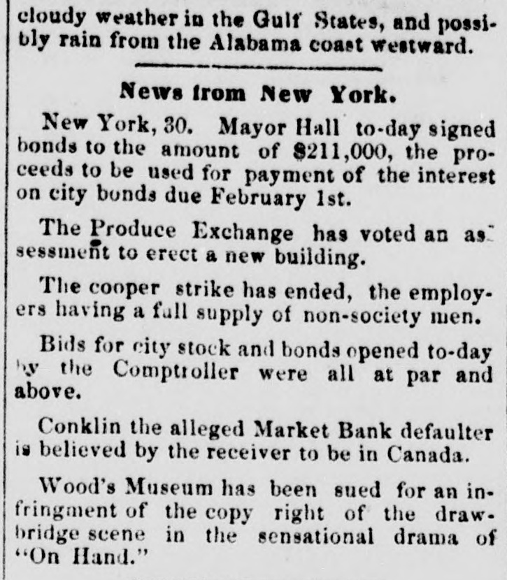 cloudy weather in the Gulf States, and possibly rain from the Alabama coast westward. News from New York. New York, 30. Mayor Hall to-day signed bonds to the amount of $211,000, the proceeds to be used for payment of the interest on city bonds due February 1st. The Produce Exchange has voted an as." sessment to erect a new building. The cooper strike has ended, the employers having a full supply of non-society men. Bids for city stock and bonds opened to-day by the Comptroller were all at par and above. Conklin the alleged Market Bank defaulter is believed by the receiver to be in Canada. Wood's Museum has been sued for an infringment of the copy right of the draw. bridge scene in the sensational drama of "On Hand."