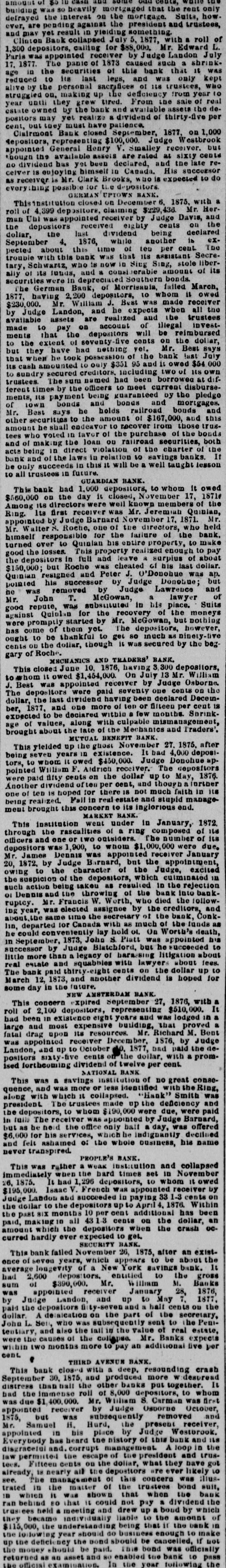 amount of $0 building was so heavily mortgaged that the rent only defrayed the interest on the mortgage. Suits, how. ever, are pending against the president and trustees, and may yet result in yielding something. Clinton Baok collapsed July 5, 1877, with a roll of 1,300 depositors, calling for $88,000. Mr. Edward L. Paris was appointed receiver by Judge Landon July 17. 1877. The panie of 1873 caused such a shrinkage in the securities of this bank that It was reduced to 118 last legs, and was only kept alive by the personal sacrifices of 118 trustees, Who struggled on, making up the deficiency from year 10 year until they grew tired. From the sale of real estate owned by the bank and available assets the depositors may yet realize a dividend of thirty-five per cent, out toey must have patience. Clairmont Bank closed September, 1877, on 1,000 Repositors, representi $100,000. Judge Westbrook appointed General Henry V. Smalley receiver. but though the available assets are rated at sixty cents no dividend bus yet been declared, and the late recelver is enjoying himself in Canada. His successor as receiver is Mr. Clark Brooks, no is expected to do thing possible for the depositors GERMAN UPTOWN BANK. This institution closed on December 6, 1875, with a roll of 4,399 depositors, claiming $229,436. Mr. Herman Uni was appointed receiver by Judge Davis, and the depositors received eighty cents on the dollar, the last dividend being declared September 4, 1876, while another is expected about this time of teu per cent. The trouble with this bank was that its assistant Secretary, Schwartz, who is now in Sing Sing, stole liberally of its lunds, and a consi erable amount of its securities were in depreciat Southern bonds. The German Bank, of Morrisauia, failed March, 1877, having 2,200 depositors, 10 whom 11 owed $230,000. Mr. William J. Best was made receiver by Judge Landon, and he expects when all the available assets are realized and the trustees made to pay on account of illegal investments that the depositors will be reimbursed to the extent of seventy five cents on the dollar, but they have had nething yet. Mr. Best says that when he took possession of the bank last July its cash amounted to only $351 95 and it owed $54 000 to sundry secured creditors. including two of its own trustees The sum named had been borrowed at different times by the officers LO meet current disbursements, its payment being guaranteed by the pledge of 10wn bonds and bonds and mortgages. Mr. Best says he holds railroad bonds and other securities to the amount of $167,000, and this amount he shall endeavor to recover from those trustees who voted in favor of the purchase of the bonds and of making the loan on railroad securities, both acts being in direct violation of the charter of the bank and of the laws in relation to savings banks. If he only succeeds in this it will be a well taught lesson to all trustees in future. GUARDIAN BANK. This bank had 1,000 depositors, to whom it owed $560,000 on the day it closed, November 17, 1871# Among its directors were well known members of the Ring. Its first receiver was Mr. Jeremiah Quinlan, appointed by Judge Barnard November 17, 1871. Mr. Mr. Walter S. Roche, one of the directors, who held himself responsible for the failure of the bank. turned over to Quinlan his entire property, to make good the losses. This property realized enough to pay the depositors in full and leave a surplus of about $150,000; but Roche WMS cheated of his last dollar. Quintan resigned and Peter J. O'Donohue was ap. pointed his successor by Judge Donohue; but no Was removed by Judge Lawrence and Mr. John T. McGowan, a lawyer of good repute, WILL substituted in his place. Suits against Quiolan for the recovery of the moneys were promptly started by Mr. McGowan, but nothing has come of them yet. The depositors, however, ought to be thankful to get so much as ninety live cents OD the dollar, though it Was secured by the beggary of Roche. MECHANICS AND TRADERS' BANK. This closed June 10, 1876, having 3, 300 depositors, to whom it owed $1,454,000. On July 13 Mr. William J. Best was appointed receiver by Judge Osborne. The depositors were paid seventy one cents on the dollar, the last dividend having been declared December, 1877, and one more of ten or filteen per cent 18 expected to be declared within a few months. Snrinkage of values, along with culpable mismanagement, brought about the tate of the Mechanics and Traders'. MUTUAL BENEFIT BANK. This yielded up the ghost November 27. 1875, after being seven years in existence. It bad 4,000 depositors, to whom It owed $450,000. Judge Donohue appointed William F. Addried receiver. The depositors were paid fifty cents on the dollar up to May, 1876. Another dividend of ten per cent, and though a (orther one of ten 18 hoped for there 18 not much faith in its being realized. Fall in real estate and stupid management brought this concern to its inglorious end. MARKET BANK. This institution went under in January, 1872. through the rasculities of ring composed of its officers and one or two outsiders. The number of its depositors was 1,900, to whom $1,000,000 were due. Mr. James Dennis was appointed receiver January 20, 1872, by Judge Barnard, but the appointment, owing to the character of the Judge, excited the suspicion of the depositors, which culminated 12A such action being taken as resulted in the rejection 01 Dennis and the throwing of the bank into bankruptcy. Mr. Francis W. Worth, who died the following year, was elected assignee by the creditors, and about the same time the secretary of the bank, Conklin, departed for Canada with as much of the funds as he could conveniently lay hold OI. On Worth's death, in September, 1873, John S. Platt was appointed his successor by Judge Blatchford, but he succeeded to little more than a legacy of barassing litigation about real estate and squabbles with lawyers about fees. The bank paid thirty-eight cents on the dollar up 