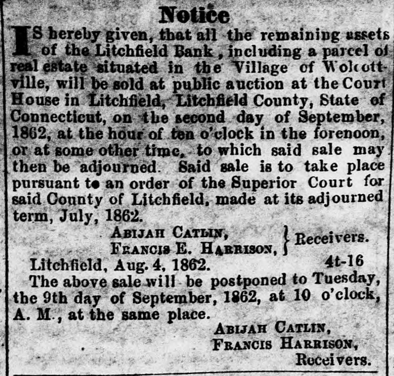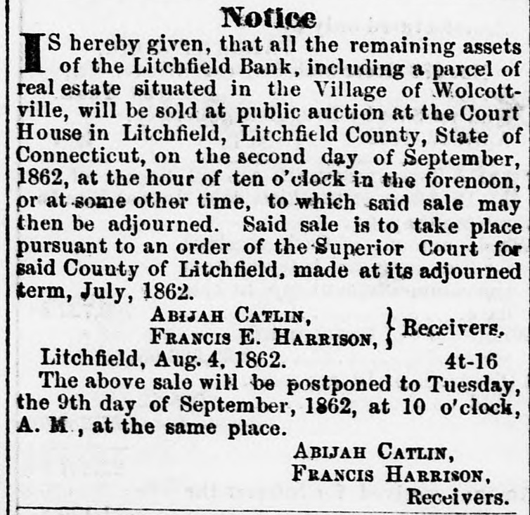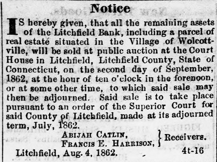 Notice S hereby given, that all the remaining assets I of the Litchfield Bank, including a parcel of real estate situated in the Village of Wolcottville, will be sold at public auction at the Court House in Litchfield, Litchfield County, State of Connecticut, on the second day of September, 1862, at the hour of ten o'clock in the forenoon, or at some other time, to which said sale may then be adjourned. Said sale is to take place pursuant to an order of the Superior Court for said County of Litchfield, made at its adjourned term, July, 1862. ABIJAH CATLIN, Receivers. FRANCIS E. HARRISON, 4t-16 Litchfield, Aug. 4, 1862.