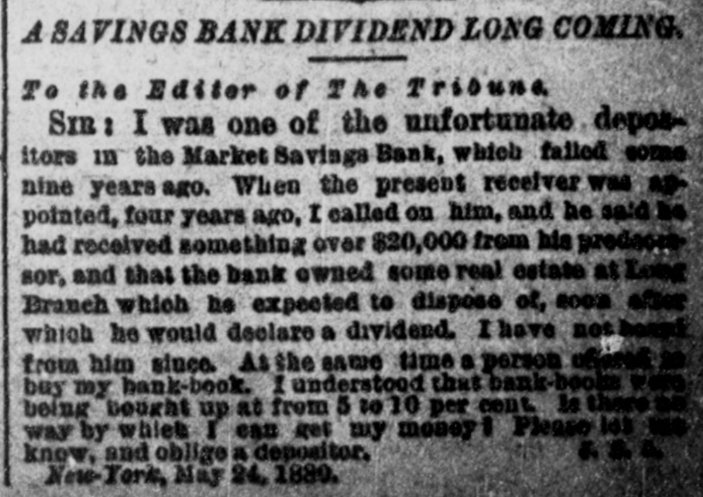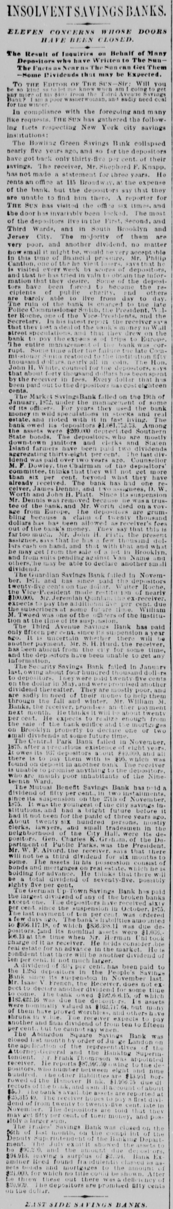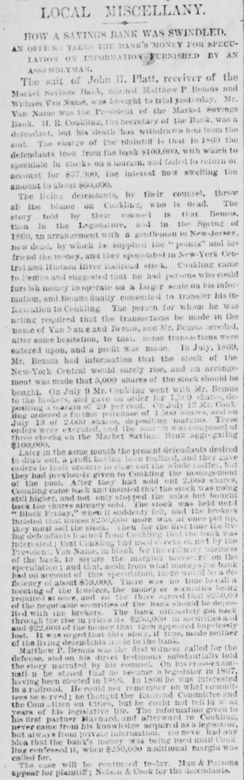 LOCAL MISCELLANY. HOW A SAVINGS BANK WAS SWINDLED. AN OFFICER TAKES THE BANK'S MONEY FOR SPECULATION ON INFORMATION FURNISHED BY AN ASSEMBLYMAN. The sait of John 11. Platt. receiver of the Market Savious Bank, against Matthew P Benus and William Van Name, was brought to trial yesterday. Mr. Van Name was the President of the Market Savings Bank. H. R. Couklinz, the Secretary of the Bank, was a defendant. but his death has withdrawn him from the suit. The charge of the plaintiff is that in 1869 the defendants touk from the bank $100,000. with which to speculate in stocks ou a margin. and failed to return 01 account for $37,000. the interest now swelling the amount to about $60,000. The living defendants, by their coursel. throw all the blaine on Coakbing, who is dead. The story told by their counsel is that Bemns, then in the Legislature, and in the Spring of 1869, an arranzement with a gentleman in New-Jersey, now dead. by which he supplied the points" and his friend the money, and they specialed in New-York Centraland Hudson River Railroad stock. Coakhing came to Bemus and suggested that he had persons who could furnish money to operate on a larger scale ou his information, and Beinus tinally consented to transfer his information to Conkling The person for whom he was acting required that the transactions be made in the name of Van Name and Bemos, and Mr. Benus acceded, after some hesitation, to that. Some transactions were entered upon, and a profit was made In July, 1869, Mr. Bemus had information that the stock of the New-York Central would surely rise, and an arrangement was made that 5,000 shares of the stock should be bought. On July 9 Mr. Conkling went with Mr. Bemus to the brokers, and gave all order for 1,500 shares, depositing it margin of 20 per cent. On July 13 Mr. Coak lung ordered it further purchase of 1,500 shares, and on July 13 of 2,000 shares, depositing margins These orders were executed. and the mar was composed of three checks on the Market Savings Bank aggregating $100,000. Later in the same month the present defendants desired having been realized, and they gave orokers to close out to orders draw to out. their a profit the whole matter, but they had previously given to Conkling the management of the pool. After they had sold out 2,000 shares, came back and insisted that the stock was going and not stopped still Conkling higher, only the stock sales but held bought until back the shares already sold. The was Black Friday," when it suddenly fell, and the brokers insisted that unless $250,000 more was at once put up, sall the stock. Then learned from was ing they defendants must Conkling for the that first the time bank the livinterested that Conkling had used weeks ned by the President. Van Name, 111 blank for the ordinary business the necess and aside of speculation: the bank, to secure that, from margins what moneystue TV on bank the had on account of this speculation, there would be a deficiency of about $59,000. There was no time to call a of the the money or being and 80 the required meeting al once, trustees, three bank agreed should securities that be $250,00 deposof the negotiable securities of the ited with the brokers. The bank nitimately got back in its $250,000 111 that then and through $22,000 the rise of the money prices appeared securities hopelessly and lost. It was urged this story. if true. made neither of the living defendants unite to the bank. Matthew P. Benus was the first witness called for the defense. and on his direct testimony substantialiv told the story narrated by his comsel. On his cross-examnati 11 he stated that the became a legislator in 1867. in 1866. In was net remember on having in a railroad. been elected He could 1866 be what interested committees be served; be thought the Railroad Committee and the Com Littee on Cities, but he could not tell in W at years of his legislative life. The information given to his first partner Maynard. and afterward to Coukling, never came from his knowledge acquired as a legislator, but always from private information. He neve had any idea that the bank's money was being used until Could ling confessed 11, when $250,000 auditional margin was called for. The case will be continued to-day. Man & Parsons appear for plaintiff; Nelson & Cook for the defendants.