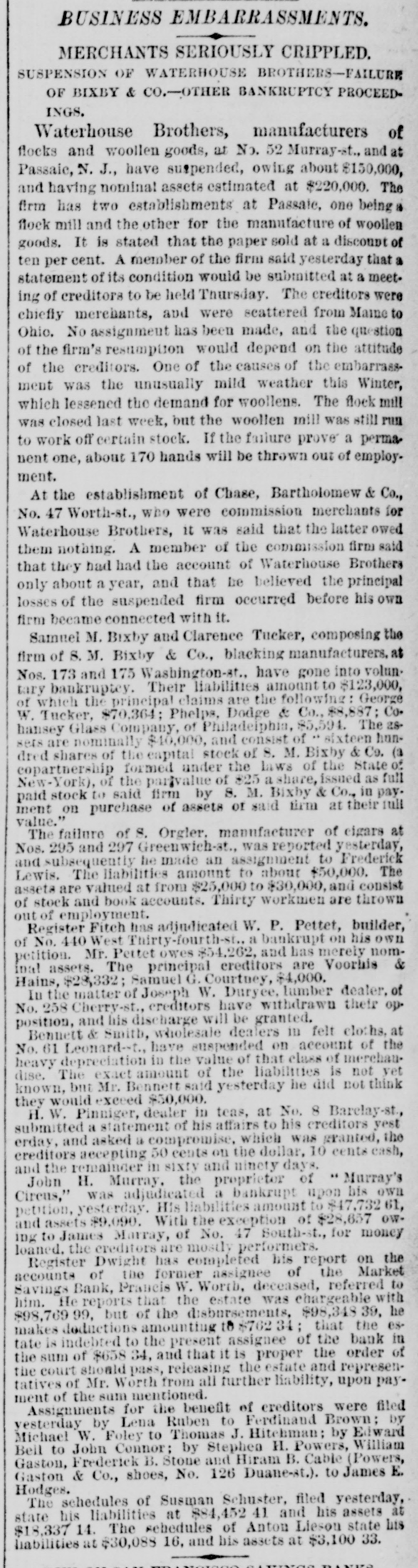 BUSINESS EMBARRASSMENTS. MERCHANTS SERIOUSLY CRIPPLED. SUSPENSION OF WATERHOUSE BROTHERS-FAILURE OF BIXBY & CO.-OTHER BANKRUPTCYPROCEED INGS. Waterhouse Brothers, manufacturers of flocks and woollen goods, at No. 52 Murray-st., and at Passaic, N. J., have suspended, owing about $150,000, and having nominal assets estimated at $220,000. The firm has two establishments at Passate, one being flock mill and the other for the manufacture of woollen goods. It is stated that the paper sold at a discount of ten per cent. A member of the firm said yesterday that a statement of its condition would be submitted at a meet. ing of creditors to be held Thursday. The creditors were chiefly merchants, and were scattered from Maine to Ohio. No assignment has been made, and the question of the firm's resumption would depend on the attitude of the creditors. One of the causes of the embarrassment was the unusually mild weather this Winter, which lessened the demand for woollens. The flock mill was closed last week, but the woollen mill was still PUB to work off certain stock. If the failure prove a permanent one, about 170 hands will be thrown out of employ. ment. At the establishment of Chase, Bartholomew & Co., No. 47 Worth-st., who were commission merchants for Waterhouse Brothers, it was said that the latter owed them nothing. A member of the commission firm said that they had had the account of Waterhouse Brothers only about a year, and that be believed the principal losses of the suspended firm occurred before his own firm became connected with it. Samuel M. Bixby and Clarence Tucker, composing the firm of S. M. Bixby & Co., blacking manufacturers. at Nos. 173 and 175 Washington-st., have gone into voluntary bankruptcy. Their liabilities amount to $123,000, of which the principal claims are the following: George W. Tucker, 870,364 Phelps, Dodge & Co., 88.887; Co. hansey Glass Company, of Philadeiphis, 85,594. The assets are nominally $40,000, and consist of sixteen hundred shares of the capital stock of 8. M. Bixby & Co. (a copartnership formed under the laws of the State of New-York), of the partvalue of 825 a share, issued as full paid stock to said firm by 8. M. Bixby & Co., in payment on purchase of assets of said firm at their full value." The failure of S. Orgler, manufacturer of cigars at Nos. 295 and 297 Greenwich-at., was reported yesterday, and subsequently he made an assignment to Frederick Lewis. The liabilities amount to about $50,000. The assets are valued at from $25,000 to $30,000, and consist of stock and book accounts. Thirty workmen are thrown out of employment. Register Fitch has adjudicated W. P. Pettet, builder, of No. 440 West Thirty-fourth-st., a bankrupt on his own petition. Mr. Pettet owes $54,262. and has merely nomfinal assets. The principal creditors are Voorhis & Hains, $28,332; Samuel G. Courtney, $4,000. In the matter of Joseph W. Duryee, lumber dealer, of No. 258 Cherry-st., creditors have withdrawn their opposition, and his discharge will be granted. Bennett & Smith, wholesale dealers in felt cloths. at No. 61 Leonard-t. have suspended on account of the heavy depreciation in the value of that class of merchandise. The exact amount of the liabilities is not yet known, but Mr. Bennett said yesterday he did not think they would exceed $30,000. H. W. Pinniger, dealer in teas, at No. 8 Barelay-st., submitted a statement of his affairs to his creditors yest erday, and asked a compromise, which was granted, the creditors accepting 50 cents on the dollar, 10 cents cash, and the remainder in sixty and ninety days. John H. Murray. the proprietor of Murray's Circus," was adjudicated a bankrupt upon bis own petition, yesterday. His liabilities amount to $47,732.61, and assets $9,090. With the exception of $28,657 owing to James Marray, of No. 47 South-st., for money loaned. the creditors are mostly performers. Register Dwight has completed his report on the accounts of the former assignee of the Market Savings Bank, Prancis W. Wortb, deceased, referred to him. He reports that the estate was chargeable with $98,769.99, but of the disbursements, $98,348.39, he makes deductions amounting to $762 34; that the estate is indebted to the present assignee of the bank in the sum of $658 34, and that it is proper the order of the court should pass, releasing the estate and representatives of Mr. Worth from all further liability, upon payment of the sum mentioned. Assignments for the benefit of creditors were filed yesterday by Lena Ruben to Ferdinand Brown: by Michael W. Foley to Thomas J. Hitchman: by Edward Beil to John Connor: by Stephen H. Powers, William Gaston, Frederick B. Stone and Hiram B. Cable (Powers, Gaston & Co., shoes, No. 126 Duane-st.). to James E. Hodges. The schedules of Susman Schuster, filed yesterday, state his liabilities at 884,452 41 and his assets at $18,337 14. The schedules of Antou Lieson state his liabilities at $30,088 16, and his assets at $3,100 33.