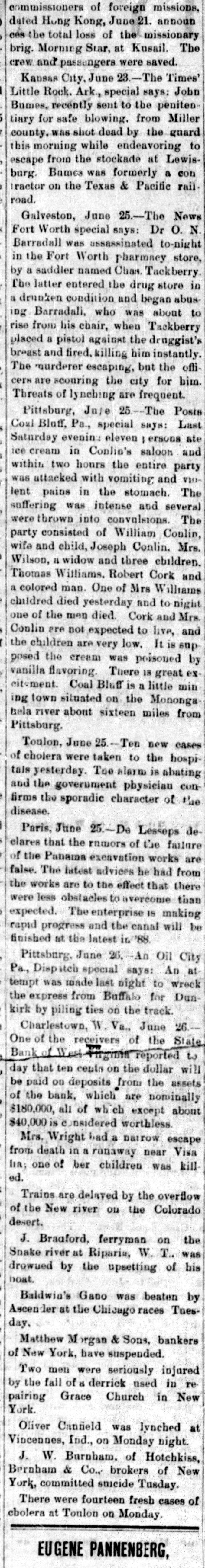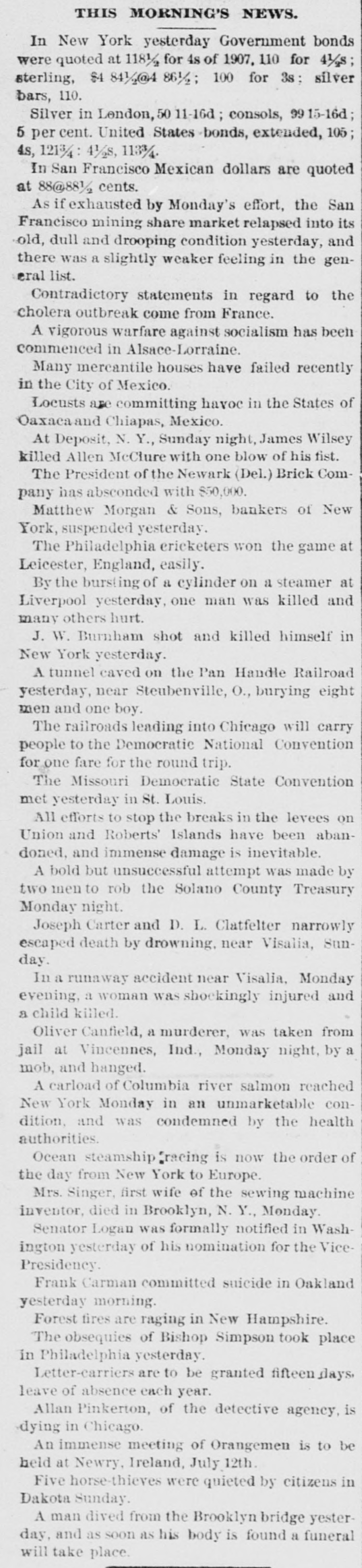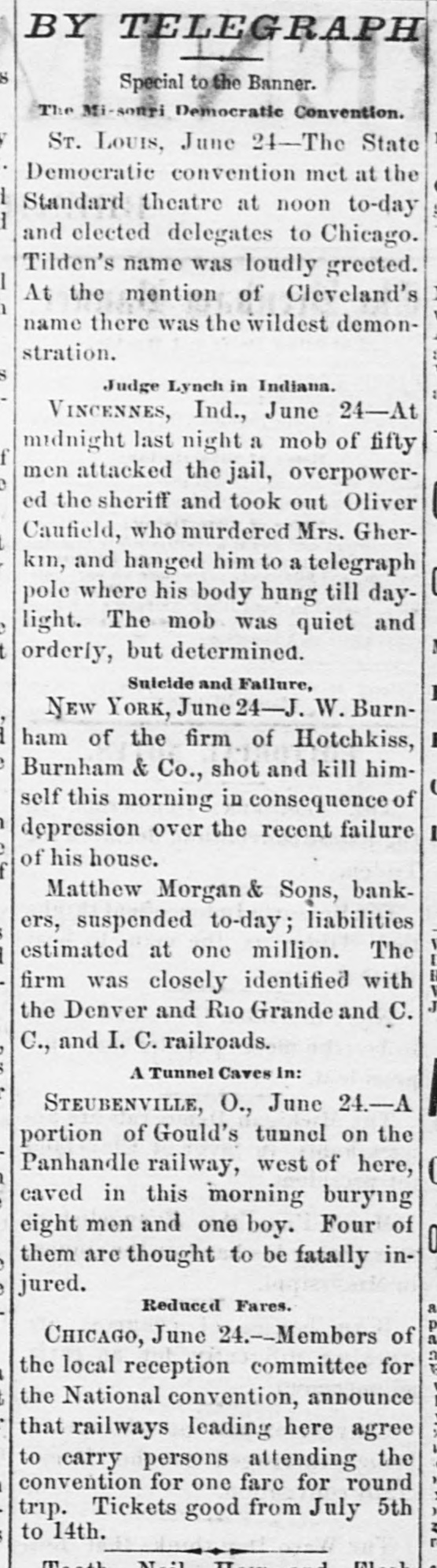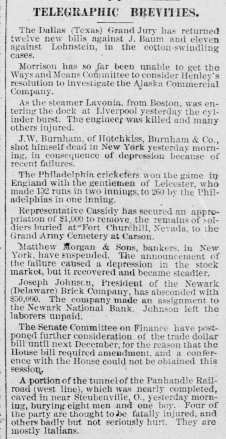 TELEGRAPHIC BREVITIES. The Dallas (Texas) Grand Jury has returned twelve new bills against J. Baum and eleven against Lohnstein, in the cotton-swindling cases. Morrison has so far been unable to get the Ways and Means Committee to consider Henley's resolution to investigate the Alaska Commercial Company. As the steamer Lavonia. from Boston, was entering the dock at Liverpool yesterday the cylinder burst. The engineer was killed and many others injured. J.W. Burnham, of Hotchkiss, Burnham & Co., shot himself dead in New York yesterday morning, in consequence of depression because of recent failures. The Philadelphin cricketers won the game in England with the gentlemen of Leicester, who made 132 runs in two innings, to 260 by the Philadelphias in one inning. Representative Cassidy has secured an appropriation of $1,000 to remove the remains of soldiers buried at Fort Churchill, Nevada, to the Grand Army Cemetery at Carson. Matthew Morgan & Sons, bankers, in New York, have suspended. The announcement of the failure caused a depression in the stock market, but it recovered and became steadier. Joseph Johnson, President of the Newark (Delaware) Brick Company, has absconded with $50,000. The company made an assignment to the Newark National Bank. Johnson left the laborers unpaid. The Senate Committee on Finance have postponed further consideration of the trade dollar bill until next December, for the reason that the House bill required amendment, and a conference with the House could not be obtained this session. A portion of the tunnel of the Panhandle Railroad (west line), which was nearly completed, caved in near Steubenville, O., yesterday morning, burying eight men and one boy. Four of the party are thought to be fatally injured, and others badly but not seriously hurt. They are mostly Italians.
