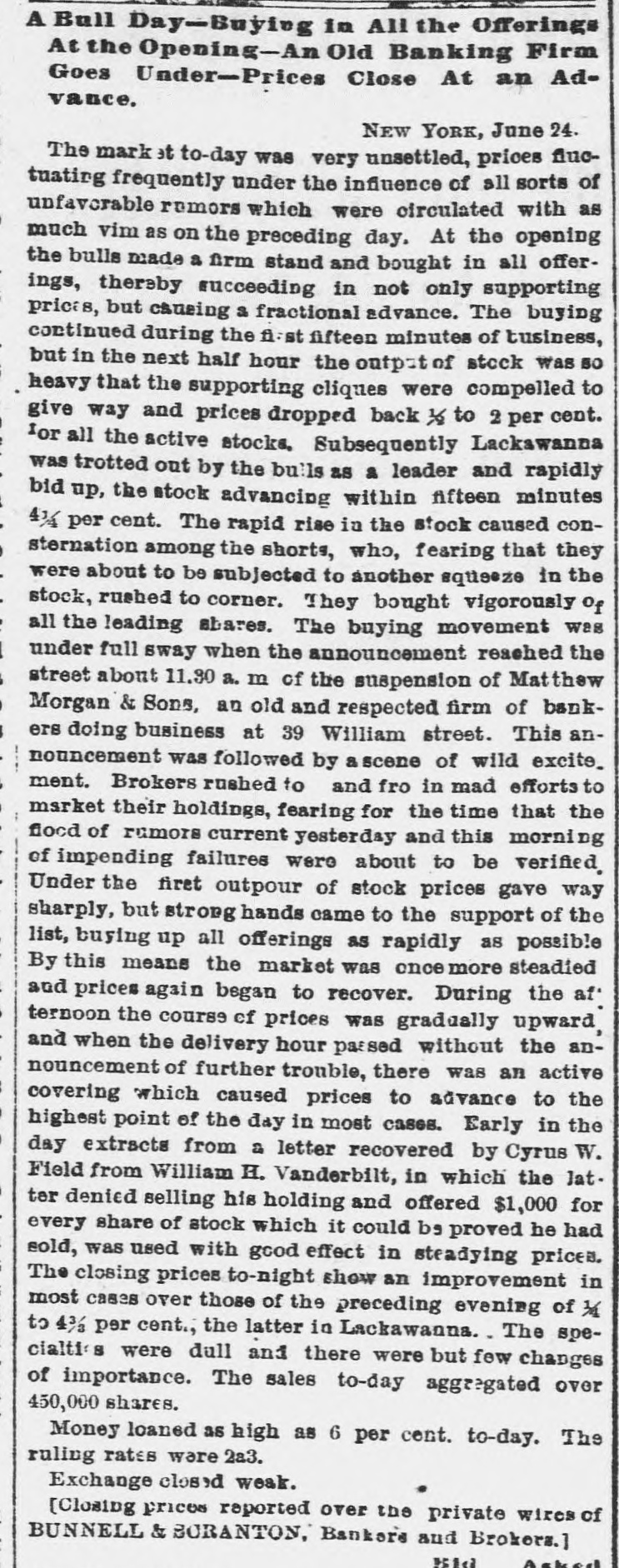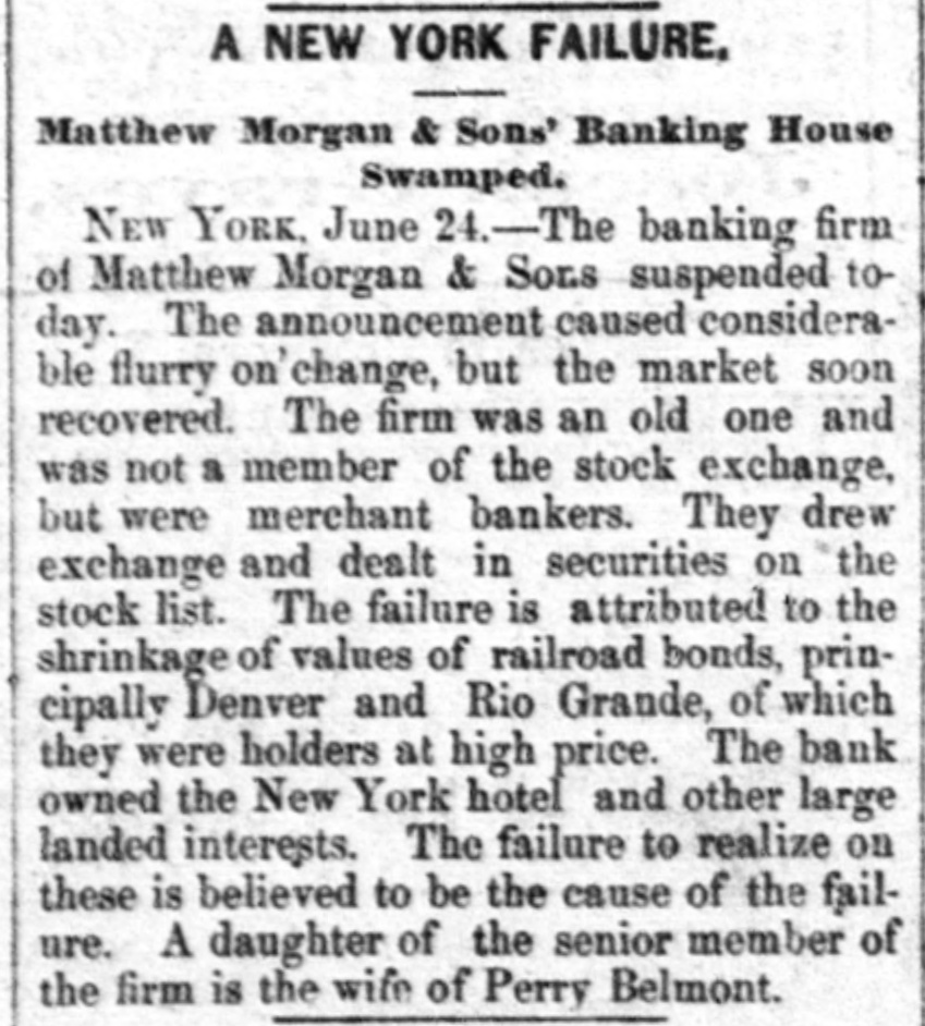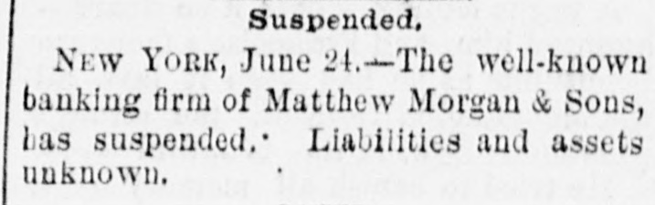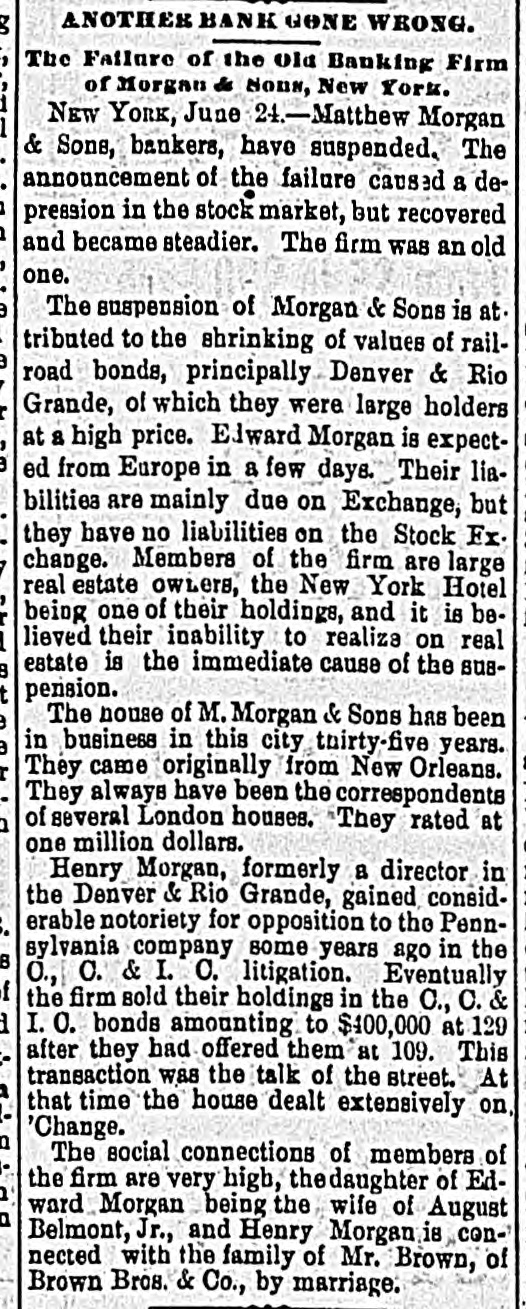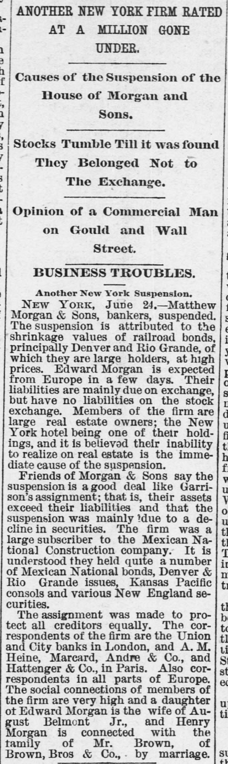 TELEGRAPHIC BREVITIES. The Dallas (Texas) Grand Jury has returned twelve new bills against J. Baum and eleven against Lohnstein, in the cotton-swindling cases. Morrison has so far been unable to get the Ways and Means Committee to consider Henley's resolution to investigate the Alaska Commercial Company. As the steamer Lavonia. from Boston, was entering the dock at Liverpool yesterday the cylinder burst. The engineer was killed and many others injured. J.W. Burnham, of Hotchkiss, Burnham & Co., shot himself dead in New York yesterday morning, in consequence of depression because of recent failures. The Philadelphin cricketers won the game in England with the gentlemen of Leicester, who made 132 runs in two innings, to 260 by the Philadelphias in one inning. Representative Cassidy has secured an appropriation of $1,000 to remove the remains of soldiers buried at Fort Churchill, Nevada, to the Grand Army Cemetery at Carson. Matthew Morgan & Sons, bankers, in New York, have suspended. The announcement of the failure caused a depression in the stock market, but it recovered and became steadier. Joseph Johnson, President of the Newark (Delaware) Brick Company, has absconded with $50,000. The company made an assignment to the Newark National Bank. Johnson left the laborers unpaid. The Senate Committee on Finance have postponed further consideration of the trade dollar bill until next December, for the reason that the House bill required amendment, and a conference with the House could not be obtained this session. A portion of the tunnel of the Panhandle Railroad (west line), which was nearly completed, caved in near Steubenville, O., yesterday morning, burying eight men and one boy. Four of the party are thought to be fatally injured, and others badly but not seriously hurt. They are mostly Italians.
