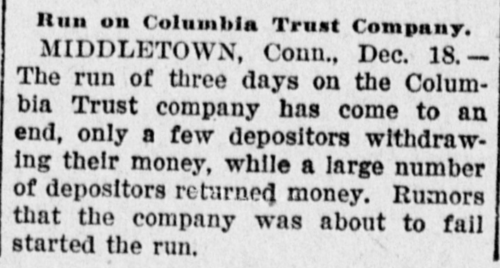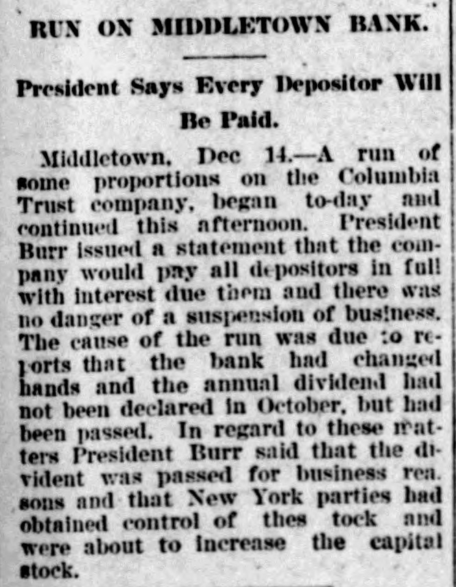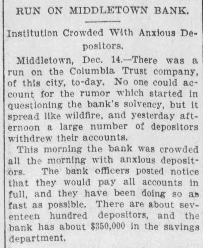 RUN ON MIDDLETOWN BANK. Institution Crowded With Anxious Depositors. Middletown, Dec. 14.-There was a run on the Columbia Trust company, of this city, to-day. No one could account for the rumor which started in questioning the bank's solvency, but it spread like wildfire, and yesterday afternoon a large number of depositors withdrew their accounts. This morning the bank was crowded all the morning with anxious depositors. The bank officers posted notice that they would pay all accounts in full, and they have been doing so as fast as possible. There are about seventeen hundred depositors, and the bank has about $350,000 in the savings department.