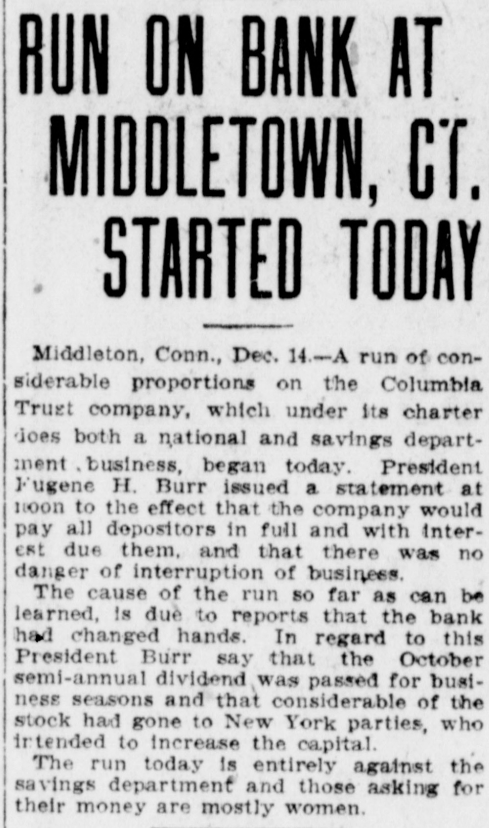 RUN ON BANK AT MIDDLETOWN, CT STARTED TODAY Middleton, Conn., Dec. 14.-A run of considerable proportions on the Columbia Trust company, which under its charter does both a national and savings department business, began today. President Fugene H. Burr issued a statement at noon to the effect that the company would pay all depositors in full and with interest due them. and that there was no danger of interruption of business. The cause of the run so far as can be learned, is due to reports that the bank had changed hands. In regard to this President Burr say that the October semi-annual dividend was passed for business seasons and that considerable of the stock had gone to New York parties, who intended to increase the capital. The run today is entirely against the savings department and those asking for their money are mostly women.