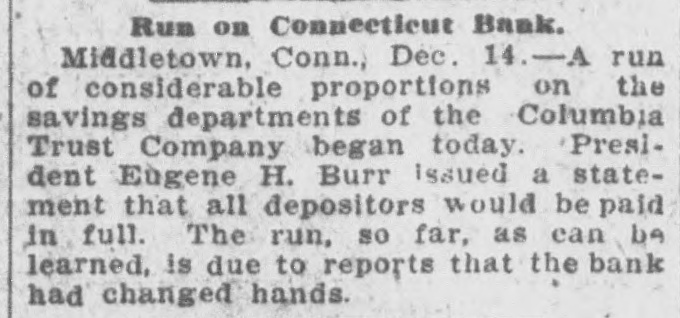 Run on Connecticut Bank. Middletown, Conn., Dec. 14.-A run of considerable proportions on the savings departments of the Columbia Trust Company began today. President Eugene H. Burr issued a statement that all depositors would be paid in full. The run, so far, as can be learned, is due to reports that the bank had changed hands.