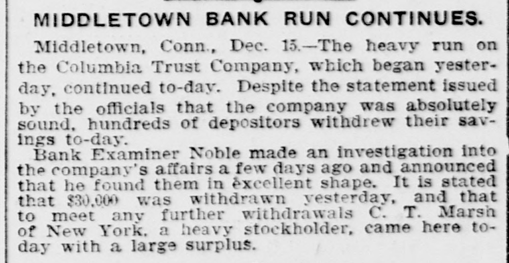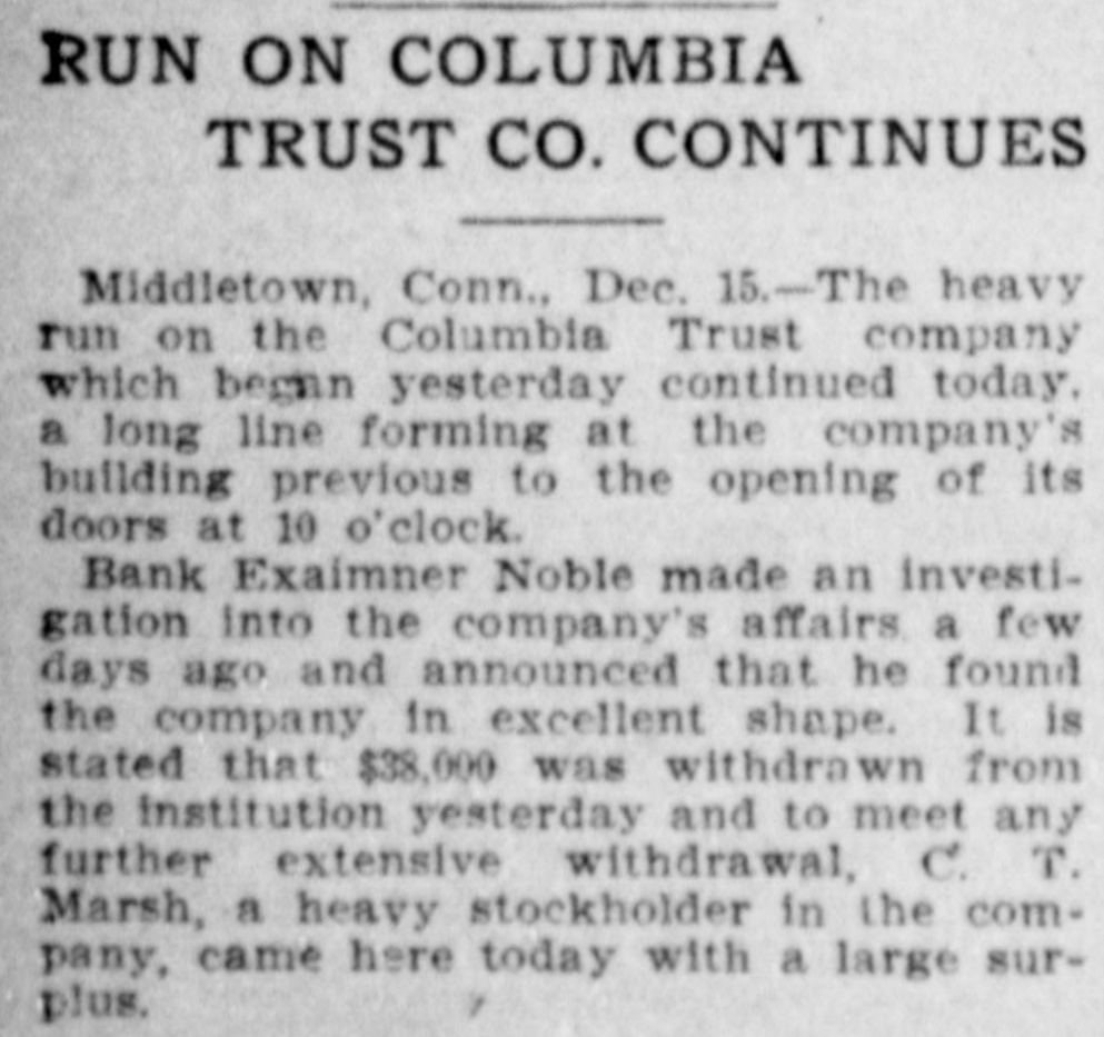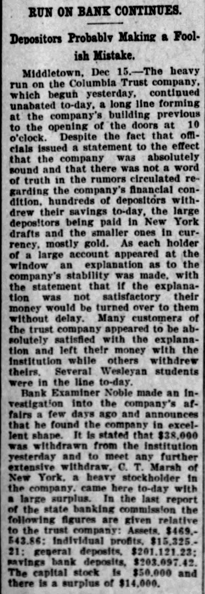 RUN ON BANK CONTINUES. Depositors Probably Making a Foolish Mistake. Middletown, Dec 15.-The heavy run on the Columbia Trust company, which begun yesterday, continued unabated to-day, a long line forming at the company's building previous to the opening of the doors at 10 o'clock. Despite the fact that officials issued a statement to the effect that the company was absolutely sound and that there was not a word of truth in the rumors circulated regarding the company's financial condition. hundreds of depositors withdrew their savings to-day, the large depositors being paid in New York drafts and the smaller ones in currency, mostly gold. As each holder of a large account appeared at the window an explanation as to the company's stability was made, with the statement that If the explanation was not satisfactory their money would be turned over to them without delay. Many customers of the trust company appeared to be absolutely satisfied with the explanation and left their money with the Institution while others withdrew theirs. Several Wesleyan students were in the line to-day. Bank Examiner Noble made an investigation into the company's affairs a few days ago and announces that he found the company in excellent shape. It is stated that $38,000 was withdrawn from the institution yesterday and to meet any further extensive withdraw. C. T. Marsh of New York. a heavy stockholder in the company. came here to-day with a large surplus. In the last report of the state banking commission the following figures are given relative to the trust company: Assets. $469.543.86: Individual profits, $15,325.21: general deposits, $201.121.23; savings bank deposits, $203,097.42. The capital stock is $50,000 and there is a surplus of $14,000.