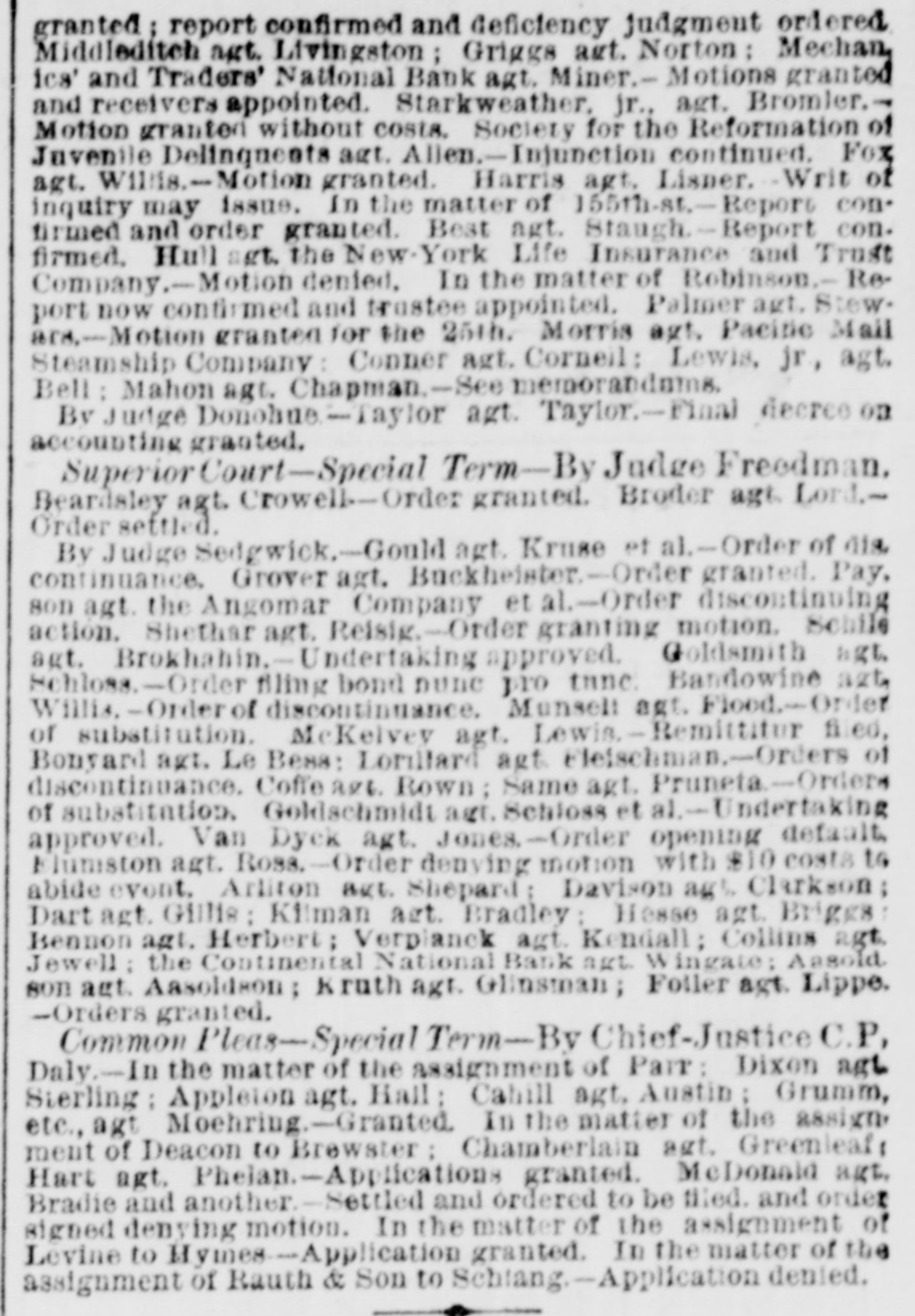 granted; report confirmed and deficiency judgment ordered Middleditch agt. Livingston ; Griggs agt. Norton : Mechan, ics' and Traders' National Bank agt. Miner.- Motions granted and receivers appointed. Starkweather. jr., agt. Bromler.Motion granted without costs. Society for the Reformation of Juvenile Delinquents agt. Allen.-Injunction continued. Fox agt. Willis.-Motion granted. Harris agt, Lisner. Writ of inquiry may issue. In the matter of 155th-st.-Report con. firmed and order granted. Best agt. Staugh.-Report confirmed. Hull agt. the New-York Life Insurance and Trust Company.-Motion denied, In the matter of Robinson.- Report now confirmed and trustee appointed. Palmer agt. Stewars.-Motion granted for the 25th. Morris agt. Pacitic Mail Steamship Company: Conner agt. Corneil: Lewis, jr, agt. Bell : Mahon agt. Chapman.-See memorandams. By Judge Donohue.-Taylor agt. Taylor.-Final decree on accounting granted. Superior Court-Special Term-By Judge Freedman. Beardsley agt. Crowell-Order granted. Broder agt. Lord.Order settled. By Judge Sedgwick.-Gould agt. Kruse et al.-Order of dis. continuance, Grover agt. Buckheisber.-Order granted. Pay, son agt. the Angomar Company et al.-Order discontinuing action. Shethar agt. Reisig.-Order granting motion. Schile agt. Brokhahin.-Undertaking approved. Goldsmith agt. Schloss.-Order filing bond nune pro tune. Bandowine ast, Willis.-Orderof discontinuance. Munsell agt. Flood.-Order of substitution. McKelvey agt. Lewis.-Remittitur filed, Bonyard agt. Le Bess: Lordlard agt. Fleischman.-Orders of discontinuance. Coffe age. Rown; Same agt. Pruneta.-Orders of substitution. Goldschmidt agt. Schloss et al.-Undertaking approved. Van Dyck agt. Jones.-Order opening default. Elumston agt. Ross.-Order denying motion with $10 costs to abide event. Arliton act. Shepard; Davison age, Clarkson Dart agt. Gillis : Kilman art. Bradley: Hesse agt. Briggs: Bennon agt. Herbert; Verplanek agt. Kendall; Collins agt, Jewell: the Continental National Bank ngt. ingate: Assold son agt. Aasoldson; Kruth age. Glinsman; Foiler agt. Lippe. -Orders granted. Common Pleas-Special Term-By Chief-Justice C.P, Daly.-In the matter of the assignment of Parr: Dixon age Sterling: Appleton agt, Hall: Cahill agt, Austin ; Grumm, etc., agt Moehring.-Granted. In the matter of the assign, ment of Deacon to Brewster ; Chamberlain agt. Greenleaf Hart agt. Phelan.-Applications granted. McDonald agt, Bradie and another.-Settled and ordered to be filed. and order signed denying motion. In the matter of the assignment of Levine to Hymes--Application granted. In the matter of the assignment of Rauth & Son to Schiang.-Application denied.