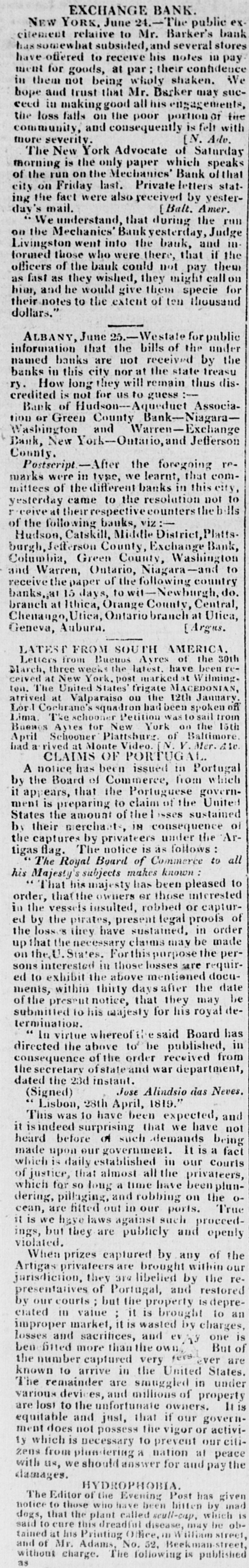 EXCHANGE BANK. YORK. June public NEW relative to Mr. Barker's stores bank citement ussomewhat subsided, and several in pay have offered to receive his notes confidence for goods, at par; their We ment them not being wholy shaken. in hope and trust that Mr. Barker may succeed in making good all his engagements, or the loss falls on the poor portion with community, the and consequently [N. is felt Adv. more severity. New York Advocate of Saturday The is the only paper which speaks of that morning run on the Mechanics' Bank of the on Friday last. Private letters yester- stat[Balt. day's mail. city ing the fact were also received by Amer. We understand, that during the run Mechanics' Bank yesterday, Judge iiion went into the the those who were there, theur Livingston formed the bauk, that and if of the bauk could not pay callon officers fast as they wished, they might for as and he would give their specie thousand hiar, their notes to the extent of ten dollars. June 25.-Westale the for public under ALBANY, that the bills of the information banks are not received by treasu named in this city nor at the state thus disbanks How long they will remain :ry. is not for us to guess credited of Hudson--queduct AssociaBank Green County Bank-Niagaration or and Warren-Exclange Jefferson Bank, Washington New York-Ontario, and County. Postscript--After the foregoing com- rein type, we learnt, that this city, marks were of the different banks in not to mittees came to the resolution counters the yesterday receive at their respective co the following banks, viz:of Catskill, Middle District, Platts. Bank, Hudson, Jefferson County, Exchange Washington Columbia, burgh, Green County, Niagara-and to Warren, Ontario, following country and the paper of the Newburgh, do. receive 15 days, to Central, banks,,& Ithica, Orange County, Utica, branch Chenango at Utica, Ontario branch Argus. at Geneva, Auburn. LATEST FROM SOUTH Ayres AMERICA. of the 30th Letters from Bueuos the latest. have been reBlarch, three New weeks York. post marked MACEDONIAN, at Wilmingcelved at United States frigate 12th January ten. The Valparaiso on the been spoken off atrived Lord Cochrane's at squadron Petition had was to sail troin 15th Lima. The schooner for New York on Baltimore. the Baemos Schooner Ayles Plattsburg N. of V. Mer. Are had April rived at Monte Video. a CLAIMS OF PORTUGAL has been issued 111 Portugal which A the notice Board of Commerce, from governby that the Portuguese the it to claim of sustained ment is of the isses of States appears, the preparing amount consequence United by their merchants, IN under the Arall the captures The by privateers notice is as follows to : tigas flag: The Royal Board of Commerce known his Majesty's That his subjects majesty makes has been pleased interested to order, that the insulted, owners er robbed those or captur- of in ed the by vessels the pirates, present sustained, legal proofs in order the loss 's they have claims may be made upthat U. the States. necessary Forthispurpose the requir- peron the interested in those losses mentioned are docusons exhibit the above the date ed to within thirty daysafter may be ments, notice, that they royal of submitted the present 10 his majesty for his termination. whereof the said Board has in directed In virtue the above order to be received published, from the consequence secretary of of state the and war department, dated the 23d instant. JOSE Alindsio das Neves. (Signed) This Lisbon, was to 28th have April, been that 1819." expected, we have and not isindeed surprising demands being it fact made upon our in our couris which heard is before daily established of government. such the It privateers, is a which of justice, for pillaging, so that long almost and a time robbing all have on been plun- the True odering, fitted out in our ports. proceedcean, are haye laws against such openly ings, it is we but they are publicly and violated. prizes captured by any within of the When privateers are brought the our rejurisdiction, Artigas they 319 libelied and by restored presentatives of but Portugal, the property is depre- an by our courts value ; : it is brought charges, to ciated III market, it is wasted ev by as one is improper losses and sacrifices, and But of ever are ben filled more than the very own fers the number arrive captured in the United States. under known to are smuggled in The remainder and millions of property Inis various devices, unfortunate owners. are lost to the that if our governequitable and possess just, the vigor or activi- citiment does which is not necessary to nation prevent at our peace damages. zens ty with us, from we plandering should answer a for and pay the The Editor of the have been bitten which by to those scull-cap. notice the plant who called Evening has be given mad ob- is dogs, that this dreadful disease, William may street, charge. said tained and of to at cure Mr. his Adams, Printing The No. Office, following 52, III Beek is published street,