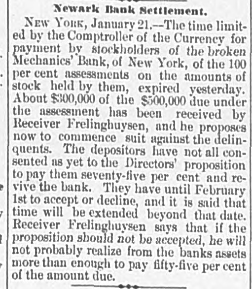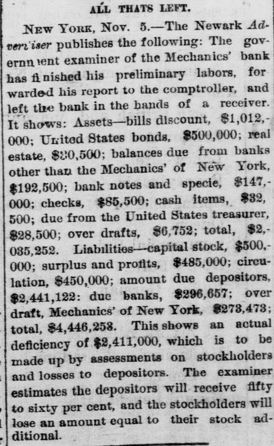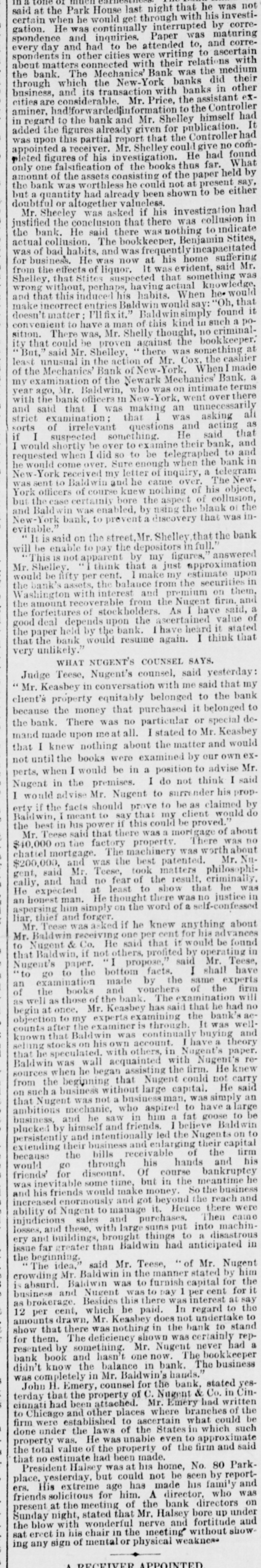 not was Park House last through with night that he his investisaid at the he would get interrupted by maturing correcertain when He was continually Paper was and correspondence gation. and inquiries. to be attended to, to ascertain every day and other had cities were writing their relati with spondents in connected with was the medium their about matters Mechanics Bank banks did the bank. which The the New-York with banks in other through business, considerable. and its ansaction Mr. Price, the to the assistant ex- Controller had aminer, cities are had forwardedfing bank and formation Mr. Shelley publication. himself It in regard to figures the already given that for the Controller com- had a receiver. appointed vestigation. added upon the this partial report Mr. Shelley could He give had no found What the bank only one pleted figures falsification of his consisting of the books of the thus paper present far. held say, by had already amount of was the worthless assets he could been shown not at to be either but quantity or altogether valueless. investigation had doubtful Sheeley was asked if his was collusion in Mr. the conclusion that was there nothing to to indicate Stites, the instified bank. collusion. He said The there bookkeeper, Benjamin Ivincapacitated He was for business. It was evident, actual was of bad habits, and now was frequently at his home suffering said Mr. from the effects of liquor. suspected that something was knowledge Shelley, without, that Stites perhaps, having habits. actual When he would "Oh, that wrong and that this induced entries his Baldwinsimply found it make incorrect matter I'll fix it." kind in such a podoesn't have man of this thought, 110 criminalconvenient There to was, Mr. Shelly against the bookkeeper. at sition. that could be proven there was something cashier But," said Mr. Shelley, the action of Mr. Cox When the made least unusual Mechanics in Bank of New- York, Mechanics' Bank, a of the examination of the Newark who was on intimate terms over there year ago, bank Mr. Baldwin, officers in New York, an went unnecessarily ali as and with said the that I was that making was asking acting strict examination irrelevant questions He and said that sorts I of suspected something. their bank, and and if would shortly be over to to be telegraphed bank to in requested I when I did Sure so enough when the telegram he would come over. my letter of inquiry, a The NewNew sent York to received Baldwin and he came nothing over. of his object, York was officers certainly of course bore knew the aspect the of blank collusion, of the inand but the ease Baldwin bank, was to enabled, prevent by a discovery using that was evitable. New-York on the street Mr. Shelley in that full. answered the bank It is said pay the depositors figures. will This 18 be enable not apparent by my just approximation Mr Shelley think that make my estimate upon in would be fifty per the cent balance from the securi on them, Washington the bank's assets, with interest and the premium Nugent firm. and the amount recoverable of stock holders. from scertained As have value said, of a good the forfeitures deal depends upon bank. the I have heard think it stated that that the paper the bank held by would the resume again. I very unlikely. NUGENT'S COUNSEL SAYS. Teese, WHAT Nugent's counsel, said said yesterday: that my Judge in conversation with me to the bank Mr. Keasbey property equitably belonged it belonged to client's the money that purchased special debecause There was no particular to or Mr. Keasbey the bank. made upon meat all. I stated matter and would mand I knew nothing about the by our own exthat the books were examined advise Mr. not until would be in a position to I said perts, when the premises. I do not render think his propNugent would in Avise Mr. Nugent to be as claimed by I if the facts should prove that my to client would do Baldwin, erty I meant his power to say if this could mortgage be proved." of about the best in that there was a There was no Mr. Teese said property. worth about $40,000 on the factor, The machinery was Mr. Nu chattel mortgage. and was the best matters patented. philosophi$200,000, gent, said Mr Teese, fear took of the result, criminally. he was cally, and had no least to show that justice in He expected at He thought there was self-confessed no an honest him man. simply on the word of a about liar, aspersing thief and forger. asked if he knew anything dvances Mr. Baldwin Teese was receiving one per that it for would his be found to Mr Nugent & Co. if not He others, said profited said by operating Mr. Teese, in that Baldwin, paper. I propose," I shall have Nugent's go to the bottom by facts. the same experts an to examination made and vouchers examination of the firm will of the books of the bank. The said that he had no begin at once. well as those Mr. experts Keasbey examining has the It bank's was well- acobjection to my the examiner is continually through buying and counts known that Baldwin was account. I have a paper. theory selling stocks on his own with others, in Nagent's Nugent's rethat he speculated. acquainted with He knew Baldwin was wall began assisting the firm. not carry sources rhen he that Nugent could He said from the business beginning ithout large capital. was simply an on Nugent a was not a business aspired man. to have large ambitious that mechanic, who in him a fat goose to be and he saw friends. I believe Baldwin to plucked business, by himsel If and led the Nugent capital on persistently and business intentionally and enlarging their the firm extending their bills receivable of and his because the through his hands bankruptcy would go discount Of course meantime he friends' for some time, but in the So the business was inevitable friends would make money beyond the reach and and his enormously and got Hence there were increased ability of Nagent to and manage purchases. it. Then caine losses. injudicions and these, sales with lar