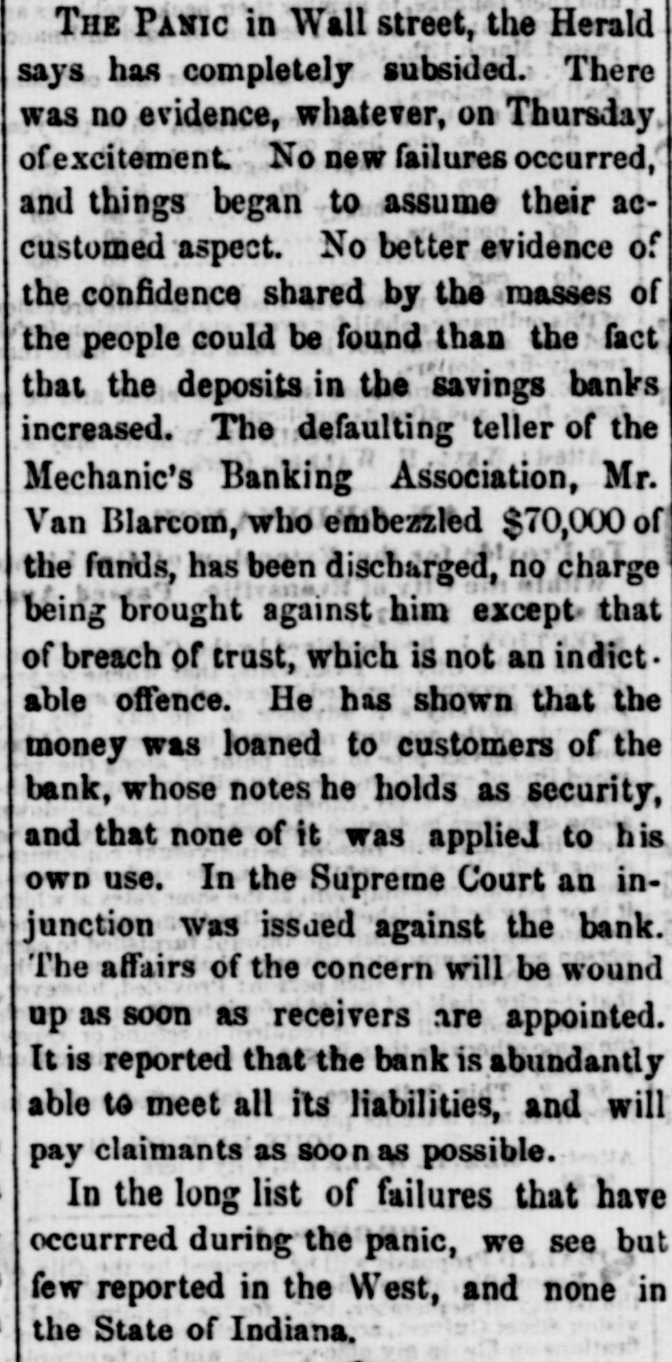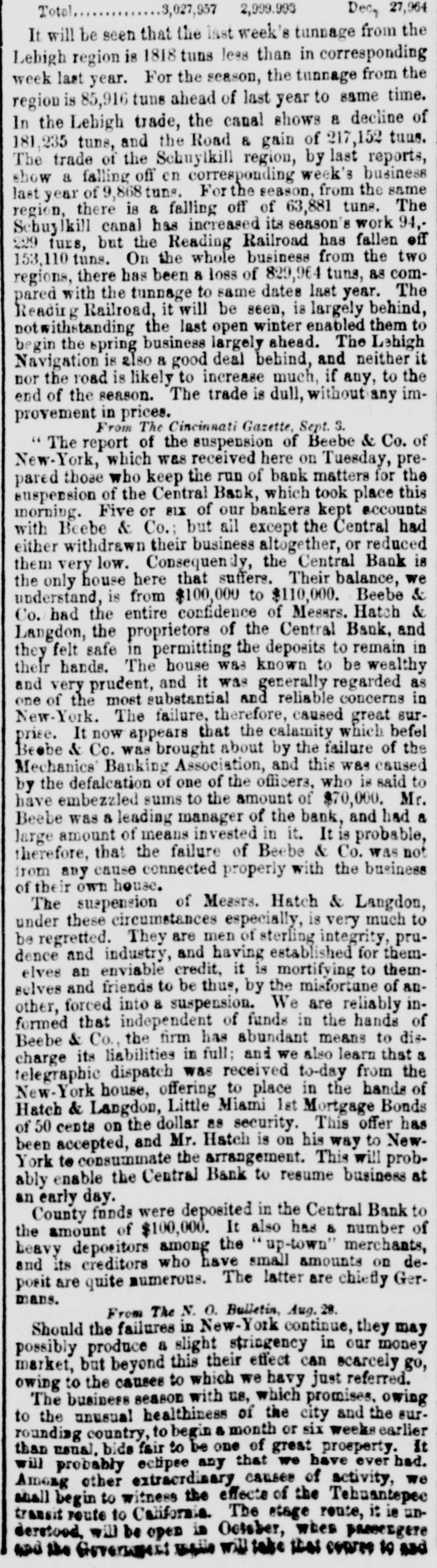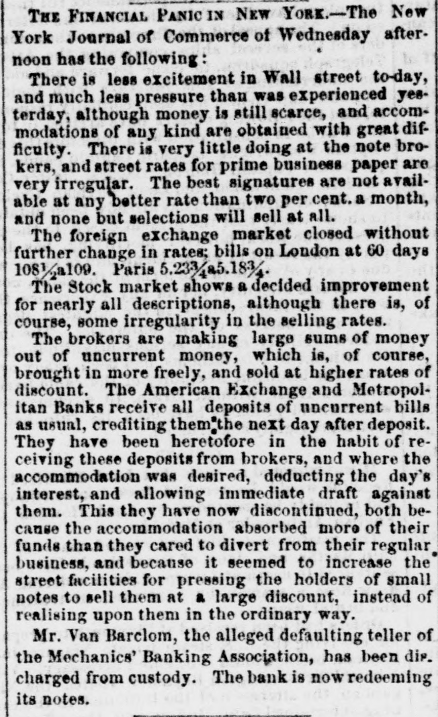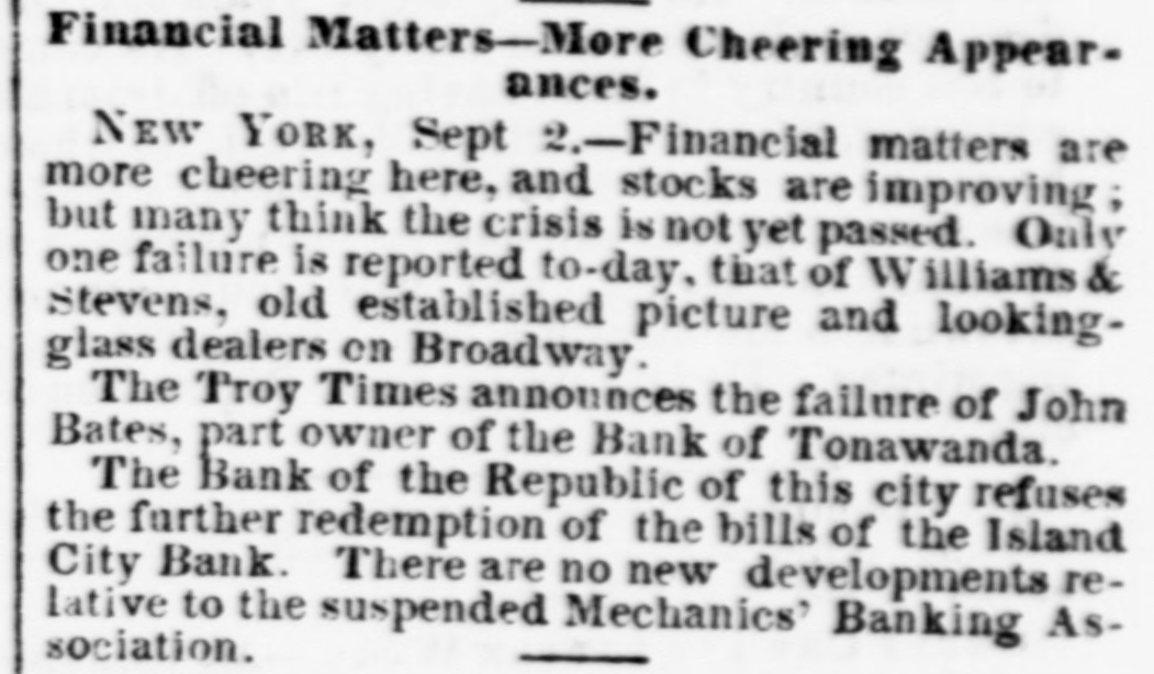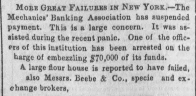 DISCREDITED BANKS. The following is a corrected list, to date, of recen SUSPENDED and DISCREDITED Banks: Arcade Bank, Providence, R I. America Bank, Trenton. N.J., Agricultural Bank, Tenn. Agricultural Bank, Herkimer, N. Y. Bergen County Bank N.J. Bank of Canandaigua, N. Y. do Naperville, III. do Believille, de do Nashville, Tennessee. do Springfield, Ohio. do Tecumsch, Michigan. do Orleans, N.Y. do New Jersey, New Brunswick, N.J. do Kent, R.I. do Hallowell, Me. do America, Tenn. do West Ternessee, Tenn. do Paris, Tenn. do Corning. N.Y. do the South County, R. I. do North America, Connecticut. do Kanawha. V Tirginia. do Eigin, III., S. S., small circulation. do the Capitol, Indianapolis, Ind., S. S. do Middleton, Penn. do Watertown, N.Y. do Chester, III. do Eigin, do do Pike County, III. Central Bank, Indianapolis, Ind., S.S. Chemting County Bank, Horse Heads, N.Y., S. S. Clinton bank, Columbus, Ohio. City Bank, N.J. Cumberland Savings Institute, Md. Commercial Bank, Columbia, S. C. Citizens' Bank, Tenn. Corn Exchange Bank, Ill. Charter Oak Bank, Hartford, Conn. Colchester Bank, Conn. Dan Bank, Vt. Dayton Bank. Ohio. Dairy Bank, Newport, N.Y. Ellsworth Bank. Maine. Exeter Bank. N. H. Exchange Bank, Pittsburgh, Pa Exchange Bank. Hartford, Conn. Farmers' Bank of Saratoga Co., N. Y.,s.s Farmers' and Manufacturer's Bank, Poughkeepsie. Farmers' Bank, Wickford, R.I. Farmers & Mechanics' Bank, Kent county, Md. Farmers and Merchants Bank, Md. Fairfield County Bank, Nor. alk, Ct. Farmers & Mechanics' Bank, Detroit, Mich. Honesitate Bank, Pennsylvania. Hollister Bar k, Buffalo, N. Y., S. Hancock Bank, Maine. Hugenot Bank, N.Y. Hopkinton Bank, Westerly. R T. Hamilton Exchange Bank, Hamilton, N.Y. Island City Bank, N. Y. city. Jefferson County Bank. N. Y. Lee Bank, Massa husetts. Mechanics' Banking Association, N. Y., S.S. Mount Vernon Bank, Providence, R. I. Maratine Bank, Maine. Monson River Bank, Me. Macomb County Bank, Michigan. Mechanics' Banking Association, N. Y.city. Morgan Bank, Ga. Miami Valley Bank, Ohio. Medina Bank, Medina, N.Y. Munson Bank, Mass. Merchants & Manufacturers' Bank, Pittsburgh, Pa. Mercar tile Bank, Hartford, Conn. N.Y. Security Bank, N.Y. Nebraska m ney has been thrown out by St. Louis brokers, excepting the Bank of Florence. Niagara River Bank, Tonawanda, N. Y., reported failed, S.S. Ontario Bank, Utica, N.Y. Ohio Life Trust Company, don't issue notes. Oliver Lee & co. Bank, N. Y.-reported failed, S. S. Ocoee Bank, Tenn. Ontario County Bank, Phelps, N.Y. People's Bank, N. V. city. reported failed, S. S. Pawcatuck Bank, Pawcatuck, Ct. Port Plain Bank. N. Y.,s.s Recipr city Bank, Buffalo, N. Y., new bank, S. S. Rhode Island Central Bank, R.I. Sanford Bank, Me. Sackett's Harbor Bank, N.Y. South Royalton Bank, Vt. Seneca County Bank, Ohio. Southern Bank, Georgia. Stock Security Bank, Illinois. Tippecanoe Bank, Logansport, Ind. Tiverton Bank, Fall River, R.I. Union Bank, Frenchtown, N.J. Unadilla Bank, N.Y. Warwick Bank, R. I. Wonster Bank, Danbury, Conn. Warren County Bank, Penn. Yates County Bank, Penn Yan, N.Y. NOTE.-"S. 8." means securet by state stock. Most of these Banks will pay their circulation in full, and holders of their bills should not submit to a large discount on them.