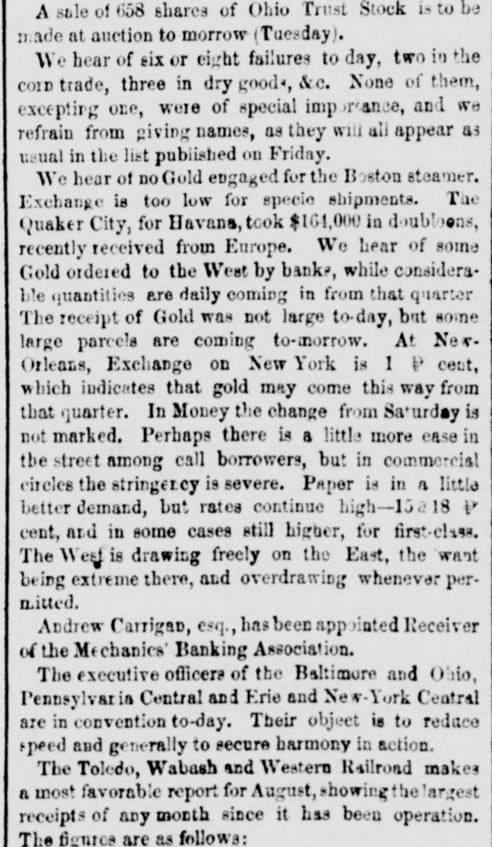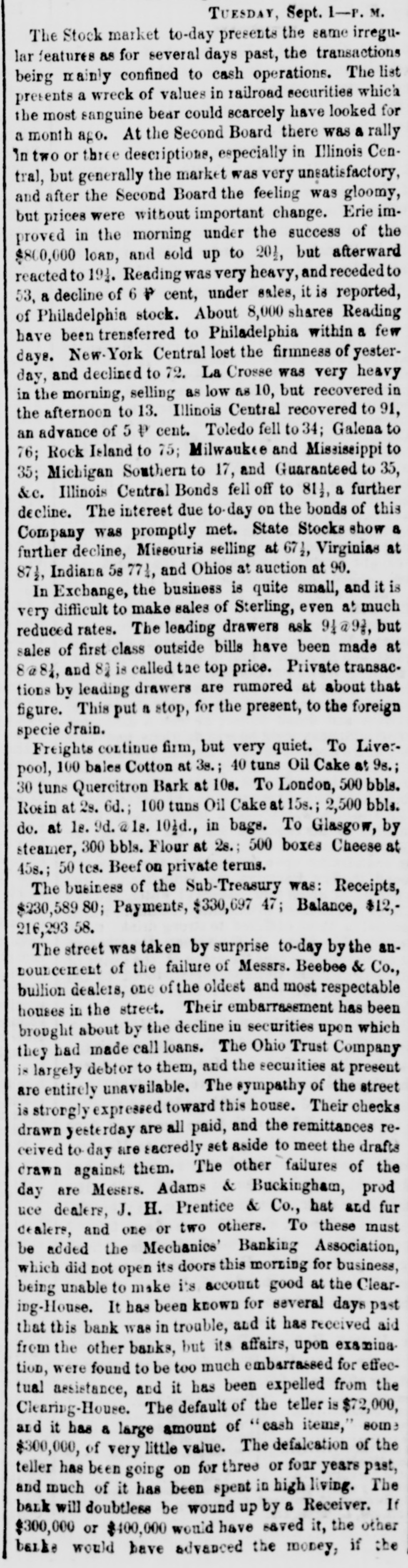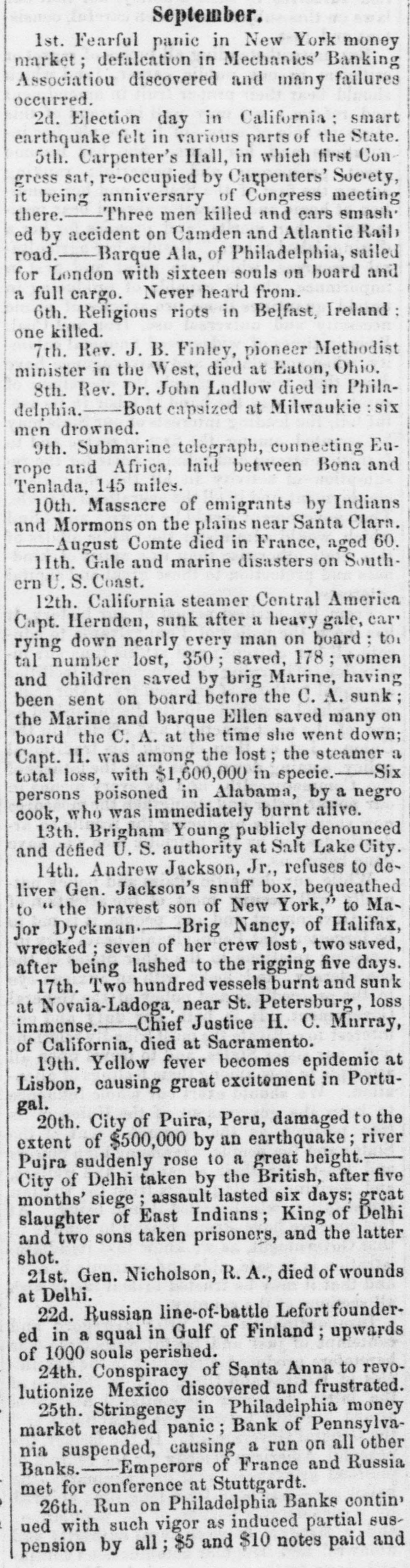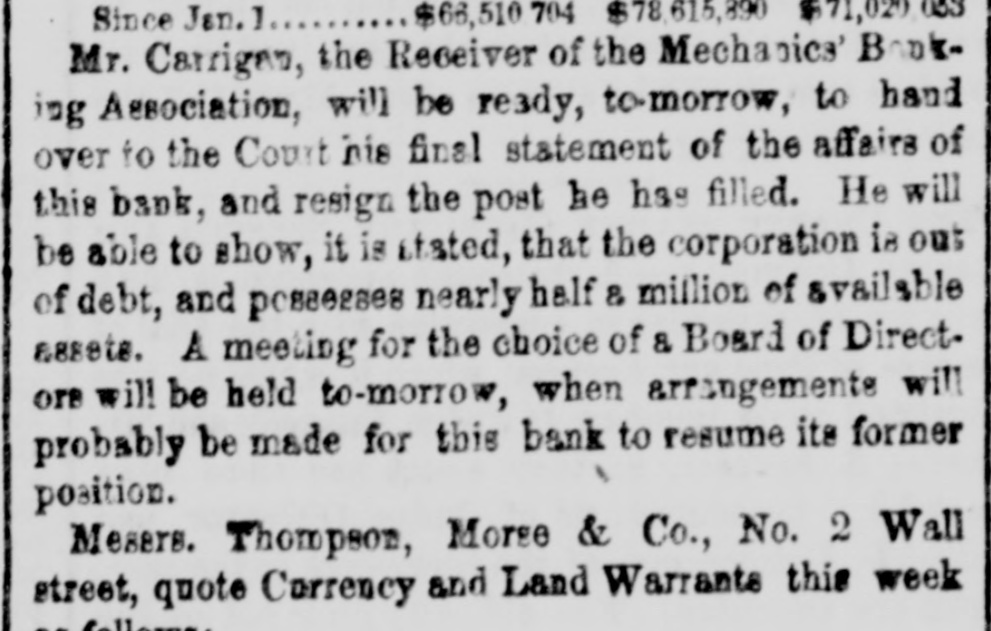 DISCREDITED BANKS. The following is a corrected list, to date, of recen SUSPENDED and DISCREDITED Banks: Arcade Bank, Providence, R I. America Bank, Trenton. N.J., Agricultural Bank, Tenn. Agricultural Bank, Herkimer, N. Y. Bergen County Bank N.J. Bank of Canandaigua, N. Y. do Naperville, III. do Believille, de do Nashville, Tennessee. do Springfield, Ohio. do Tecumsch, Michigan. do Orleans, N.Y. do New Jersey, New Brunswick, N.J. do Kent, R.I. do Hallowell, Me. do America, Tenn. do West Ternessee, Tenn. do Paris, Tenn. do Corning. N.Y. do the South County, R. I. do North America, Connecticut. do Kanawha. V Tirginia. do Eigin, III., S. S., small circulation. do the Capitol, Indianapolis, Ind., S. S. do Middleton, Penn. do Watertown, N.Y. do Chester, III. do Eigin, do do Pike County, III. Central Bank, Indianapolis, Ind., S.S. Chemting County Bank, Horse Heads, N.Y., S. S. Clinton bank, Columbus, Ohio. City Bank, N.J. Cumberland Savings Institute, Md. Commercial Bank, Columbia, S. C. Citizens' Bank, Tenn. Corn Exchange Bank, Ill. Charter Oak Bank, Hartford, Conn. Colchester Bank, Conn. Dan Bank, Vt. Dayton Bank. Ohio. Dairy Bank, Newport, N.Y. Ellsworth Bank. Maine. Exeter Bank. N. H. Exchange Bank, Pittsburgh, Pa Exchange Bank. Hartford, Conn. Farmers' Bank of Saratoga Co., N. Y.,s.s Farmers' and Manufacturer's Bank, Poughkeepsie. Farmers' Bank, Wickford, R.I. Farmers & Mechanics' Bank, Kent county, Md. Farmers and Merchants Bank, Md. Fairfield County Bank, Nor. alk, Ct. Farmers & Mechanics' Bank, Detroit, Mich. Honesitate Bank, Pennsylvania. Hollister Bar k, Buffalo, N. Y., S. Hancock Bank, Maine. Hugenot Bank, N.Y. Hopkinton Bank, Westerly. R T. Hamilton Exchange Bank, Hamilton, N.Y. Island City Bank, N. Y. city. Jefferson County Bank. N. Y. Lee Bank, Massa husetts. Mechanics' Banking Association, N. Y., S.S. Mount Vernon Bank, Providence, R. I. Maratine Bank, Maine. Monson River Bank, Me. Macomb County Bank, Michigan. Mechanics' Banking Association, N. Y.city. Morgan Bank, Ga. Miami Valley Bank, Ohio. Medina Bank, Medina, N.Y. Munson Bank, Mass. Merchants & Manufacturers' Bank, Pittsburgh, Pa. Mercar tile Bank, Hartford, Conn. N.Y. Security Bank, N.Y. Nebraska m ney has been thrown out by St. Louis brokers, excepting the Bank of Florence. Niagara River Bank, Tonawanda, N. Y., reported failed, S.S. Ontario Bank, Utica, N.Y. Ohio Life Trust Company, don't issue notes. Oliver Lee & co. Bank, N. Y.-reported failed, S. S. Ocoee Bank, Tenn. Ontario County Bank, Phelps, N.Y. People's Bank, N. V. city. reported failed, S. S. Pawcatuck Bank, Pawcatuck, Ct. Port Plain Bank. N. Y.,s.s Recipr city Bank, Buffalo, N. Y., new bank, S. S. Rhode Island Central Bank, R.I. Sanford Bank, Me. Sackett's Harbor Bank, N.Y. South Royalton Bank, Vt. Seneca County Bank, Ohio. Southern Bank, Georgia. Stock Security Bank, Illinois. Tippecanoe Bank, Logansport, Ind. Tiverton Bank, Fall River, R.I. Union Bank, Frenchtown, N.J. Unadilla Bank, N.Y. Warwick Bank, R. I. Wonster Bank, Danbury, Conn. Warren County Bank, Penn. Yates County Bank, Penn Yan, N.Y. NOTE.-"S. 8." means securet by state stock. Most of these Banks will pay their circulation in full, and holders of their bills should not submit to a large discount on them.
