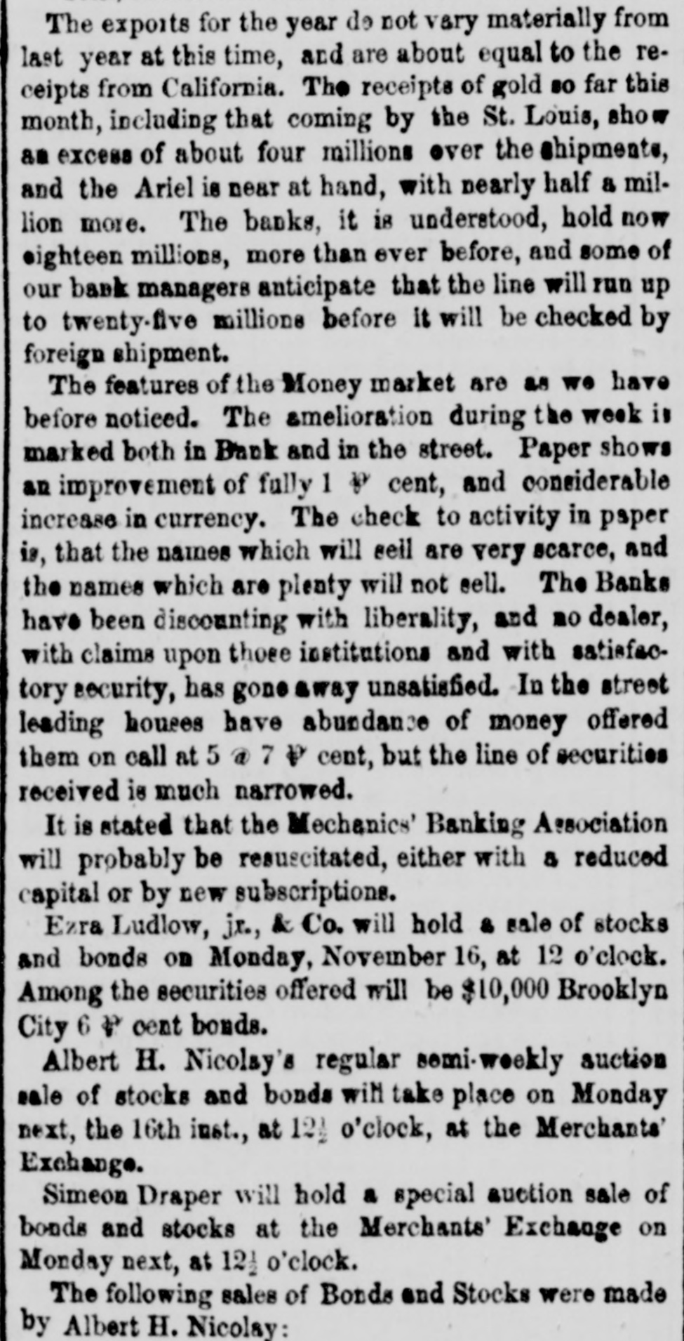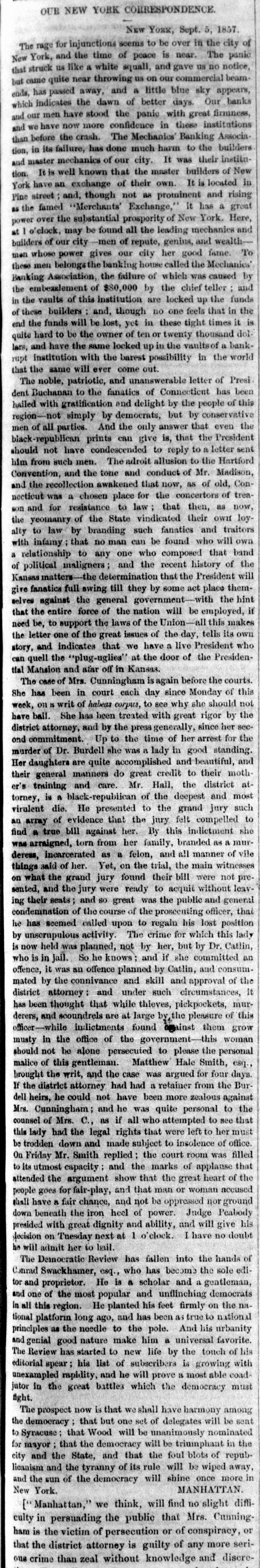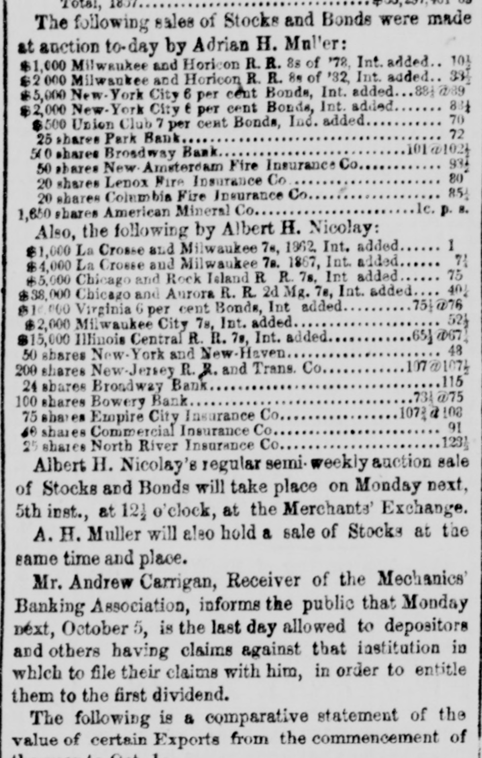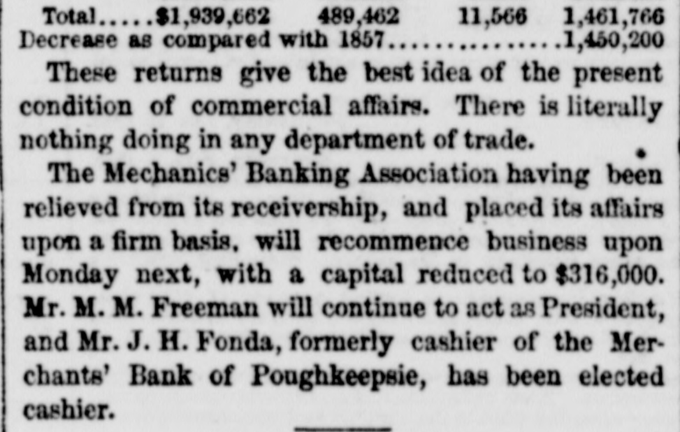 DISCREDITED BANKS. The following is a corrected list, to date, of recen SUSPENDED and DISCREDITED Banks: Arcade Bank, Providence, R I. America Bank, Trenton. N.J., Agricultural Bank, Tenn. Agricultural Bank, Herkimer, N. Y. Bergen County Bank N.J. Bank of Canandaigua, N. Y. do Naperville, III. do Believille, de do Nashville, Tennessee. do Springfield, Ohio. do Tecumsch, Michigan. do Orleans, N.Y. do New Jersey, New Brunswick, N.J. do Kent, R.I. do Hallowell, Me. do America, Tenn. do West Ternessee, Tenn. do Paris, Tenn. do Corning. N.Y. do the South County, R. I. do North America, Connecticut. do Kanawha. V Tirginia. do Eigin, III., S. S., small circulation. do the Capitol, Indianapolis, Ind., S. S. do Middleton, Penn. do Watertown, N.Y. do Chester, III. do Eigin, do do Pike County, III. Central Bank, Indianapolis, Ind., S.S. Chemting County Bank, Horse Heads, N.Y., S. S. Clinton bank, Columbus, Ohio. City Bank, N.J. Cumberland Savings Institute, Md. Commercial Bank, Columbia, S. C. Citizens' Bank, Tenn. Corn Exchange Bank, Ill. Charter Oak Bank, Hartford, Conn. Colchester Bank, Conn. Dan Bank, Vt. Dayton Bank. Ohio. Dairy Bank, Newport, N.Y. Ellsworth Bank. Maine. Exeter Bank. N. H. Exchange Bank, Pittsburgh, Pa Exchange Bank. Hartford, Conn. Farmers' Bank of Saratoga Co., N. Y.,s.s Farmers' and Manufacturer's Bank, Poughkeepsie. Farmers' Bank, Wickford, R.I. Farmers & Mechanics' Bank, Kent county, Md. Farmers and Merchants Bank, Md. Fairfield County Bank, Nor. alk, Ct. Farmers & Mechanics' Bank, Detroit, Mich. Honesitate Bank, Pennsylvania. Hollister Bar k, Buffalo, N. Y., S. Hancock Bank, Maine. Hugenot Bank, N.Y. Hopkinton Bank, Westerly. R T. Hamilton Exchange Bank, Hamilton, N.Y. Island City Bank, N. Y. city. Jefferson County Bank. N. Y. Lee Bank, Massa husetts. Mechanics' Banking Association, N. Y., S.S. Mount Vernon Bank, Providence, R. I. Maratine Bank, Maine. Monson River Bank, Me. Macomb County Bank, Michigan. Mechanics' Banking Association, N. Y.city. Morgan Bank, Ga. Miami Valley Bank, Ohio. Medina Bank, Medina, N.Y. Munson Bank, Mass. Merchants & Manufacturers' Bank, Pittsburgh, Pa. Mercar tile Bank, Hartford, Conn. N.Y. Security Bank, N.Y. Nebraska m ney has been thrown out by St. Louis brokers, excepting the Bank of Florence. Niagara River Bank, Tonawanda, N. Y., reported failed, S.S. Ontario Bank, Utica, N.Y. Ohio Life Trust Company, don't issue notes. Oliver Lee & co. Bank, N. Y.-reported failed, S. S. Ocoee Bank, Tenn. Ontario County Bank, Phelps, N.Y. People's Bank, N. V. city. reported failed, S. S. Pawcatuck Bank, Pawcatuck, Ct. Port Plain Bank. N. Y.,s.s Recipr city Bank, Buffalo, N. Y., new bank, S. S. Rhode Island Central Bank, R.I. Sanford Bank, Me. Sackett's Harbor Bank, N.Y. South Royalton Bank, Vt. Seneca County Bank, Ohio. Southern Bank, Georgia. Stock Security Bank, Illinois. Tippecanoe Bank, Logansport, Ind. Tiverton Bank, Fall River, R.I. Union Bank, Frenchtown, N.J. Unadilla Bank, N.Y. Warwick Bank, R. I. Wonster Bank, Danbury, Conn. Warren County Bank, Penn. Yates County Bank, Penn Yan, N.Y. NOTE.-"S. 8." means securet by state stock. Most of these Banks will pay their circulation in full, and holders of their bills should not submit to a large discount on them.