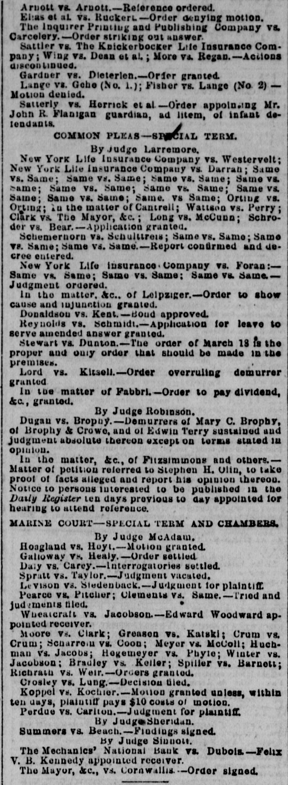 Arnott VS. Arbott.-Reference ordered. Ehas et at vs. Ruckert-Order denying motion. The Inquirer Printing and Publishing Company vs. Carcelery.-Order striking out answer. Sattler vs. The Knickerbocker Life Insurance Company; Wing vs. Dean et al; More V3. Regan.-Actions discontinued. Gardner vs. Dieterien.-Orfer granted. Lange vs. Gehe (No. 1.); Fisher vs. Lange (No. 2) Motion denied. Satterly vs. Herrick et al-Order appoin.ing Mr. John R. Flanigan guardian, ad litem, of infant defendants. COMMON PLEAS-SPICIAL TERM. By judge Larremore. New York Life Insurance Company vs. Westervelt; New York Life Insurance Company vs. Darrah; Same vs. Same; Same Vs. Same; Same vs. Same; Same vs. same; Same vs. Same; Same VS. Same; Same vs. Same; Same vs. Same; Same. vs Same; Orting vs. Orting; in the matter of Cantrell; Wattson vs. Perry; Clark V& The Mayor, &c.; Long VS. McCunn; Schroder V8. Bear.-Application granted. Schemernorn vs. Schulttreis; Same vs. Same; Same V8. Same; Same vs. Same.-Report confirmed and decree entered. New York Life insurance. Company vs. Foran:Same vs. Same; Same vs. Same: Same vs. SameJudgment ordered. in the matter. &c.. of Leipziger.-Order to show cause and injunction granted. Donaldson vs. Kent.-Boud approved. Reynolds vs. Sehmidi.-Applhication for leave to serve amended answer granted. Stewart vs. Dunton.-The order of March 18 is the proper and only order that should be made in the premises. Lord vs. Kitsell.-Order overruling demurrer granted In the matter of Fabbri.-Order to pay dividend, &c., granted. By Judge Robinson. Dugan vs. Bropny.-Demurrers of Mary C. Brophy, of Brophy & Crowe, and of Edwin Terry sustained and judgment absolute thereon except on terms stated in opinion. In the matter, &c., of Fitzsiminons and others.Matter of petition referred to Stephen H. Olin, to take proof of facts alleged and report his opinion thereon. Notice to persons interested to be published in the Darly Register ten days previous to day appointed for hearing to attend reference. MARINE COURT-SPECIAL TERM AND CHAMBERS. By Judge McAdam. Hoagland vs. Hoyt.-Motion granted. Galloway VS. Healy.-Order settled Daty vs. Carey.-Interrogatories settled. Spratt vs. Taylor.-Judgment vacated. Levison vs. Stedenback.-Judgment for plaintiff. Pearce vs. Pitcher; Clements Vs. Same.-Tried and judgments filed. Wheatcraft vs. Jacobson-Edward Woodward appointed receiver. Moore Vs. Clark; Greasen vs. Katski; Crum vs. Crum; Scharrom vs. Coon; Meyer vs. McColl; Huchman vs. Jacobs; Hegemeyer vs. Phyte; Winter vs. Jacobson; Bradley vs. Keller; Spiller vs. Barnett; Richrath Vs. Weir.-Orders granted. Crosley vs. Lung.-Decision tiled. Koppel Vs. Kochier.-Motion granted unless, within ten aays, plaintiff pays $10 costs of motion. Perdue vs. Cariton.-Judgment for plaintiff. By Judge Sheridan. Summers vs. Beach.-Findings signed. By Judge Sinnott. The Mechanics' National Bank vs. Dubois-Felix V. B. Kennedy appointed receiver. The Mayor, &c., Vs. Cornwallis.-Order signed.
