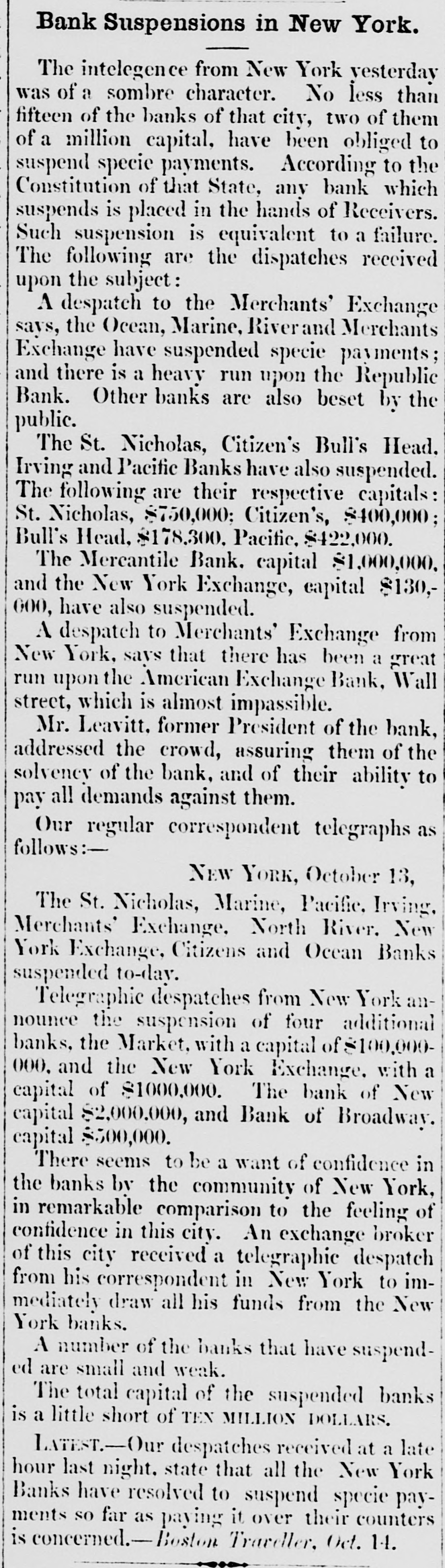 Bank Suspensions in New York. The intelegence from New York yesterday was of a sombre character. No less than fifteen of the banks of that city, two of them of a million capital, have been obliged to suspend specie payments. According to the Constitution of that State, any bank which suspends is placed in the hands of Receivers. Such suspension is equivalent to a failure. The following are the dispatches received upon the subject: A despatch to the Merchants' Exchange says, the Ocean, Marine, Riverand Merchants Exchange have suspended specie payments; and there is a heavy run upon the Republic Bank. Other banks are also beset by the public. The St. Nicholas, Citizen's Bull's Head. Irving and Pacific Banks have also suspended. The following are their respective capitals: St. Nicholas, $750,000; Citizen's, $400,000; Bull's Head, $178,300. Pacific, $422,000. The Mercantile Bank. capital $1,000,000. and the New York Exchange, capital $130,000, have also suspended. A despatch to Merchants' Exchange from New York, savs that there has been a great run upon the American Exchange Bank, Wall street, which is almost impassible. Mr. Leavitt. former President of the bank, addressed the crowd, assuring them of the solvenev of the bank, and of their ability to pay all demands against them. Our regular correspondent telegraphs as follows:NEW YORK, October 13, The St. Nicholas, Marine, Pacific, Irving, Merchants' Exchange, North River. New York Exchange, Citizens and Ocean Banks suspended to-day. Telegraphic despatches from New York announce the suspension of four additional banks, the Market, with a capital of $100,000000. and the New York Exchange, with a capital of $1000,000. The bank of New capital $2,000,000, and Bank of Broadway. capital $500,000. There seems to be a want of confidence in the banks by the community of New York, in remarkable comparison to the feeling of confidence in this city. An exchange broker of this city received a telegraphic despatch from his correspondent in New York to immediately draw all his funds from the New York banks. A number of the banks that have suspended are small and weak. The total capital of the suspended banks is a little short of TEN MILLION DOLLARS. LATEST.-Our despatches received at a late hour last night, state that all the New York Banks have resolved to suspend specie payments so far as paying it over their counters is concerned.-Boston Traveller, Oct. 14.