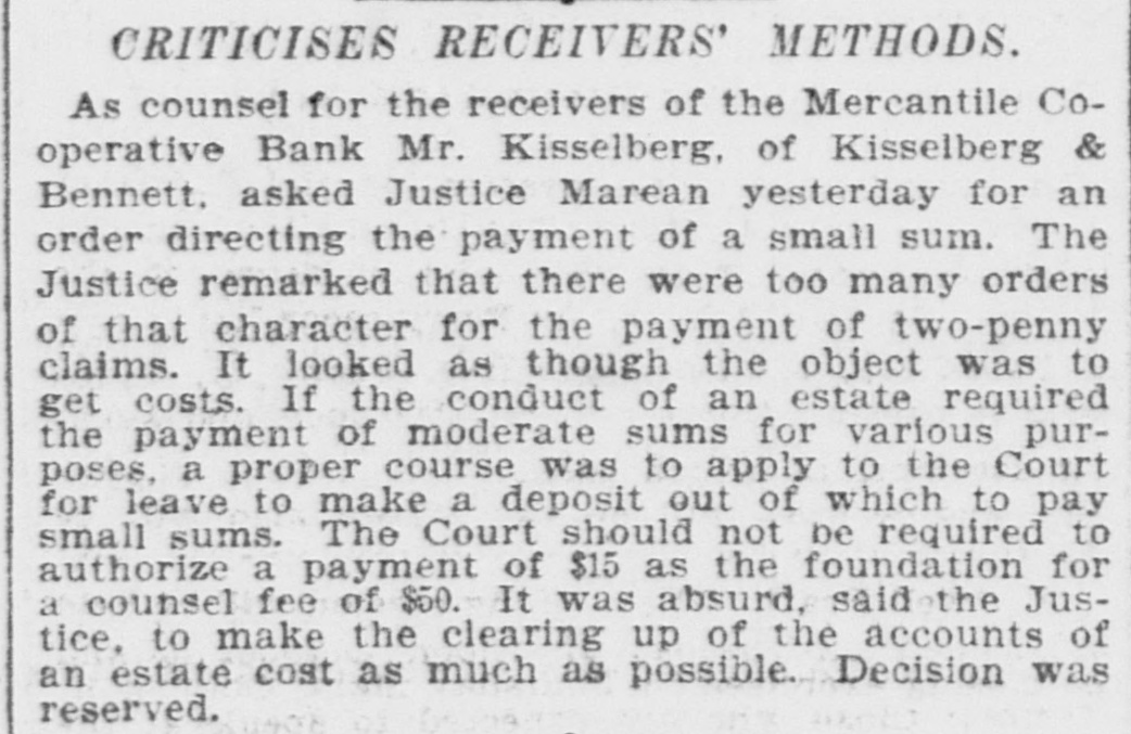 CRITICISES RECEIVERS' METHODS. As counsel for the receivers of the Mercantile Cooperative Bank Mr. Kisselberg, of Kisselberg & Bennett. asked Justice Marean yesterday for an order directing the payment of a small sum. The Justice remarked that there were too many orders of that character for the payment of two-penny claims. It looked as though the object was to get costs. If the conduct of an estate required the payment of moderate sums for various purposes, a proper course was to apply to the Court for leave to make a deposit out of which to pay small sums. The Court should not be required to authorize a payment of $15 as the foundation for a counsel fee of $50. It was absurd, said the Justice, to make the clearing up of the accounts of an estate cost as much as possible. Decision was reserved.