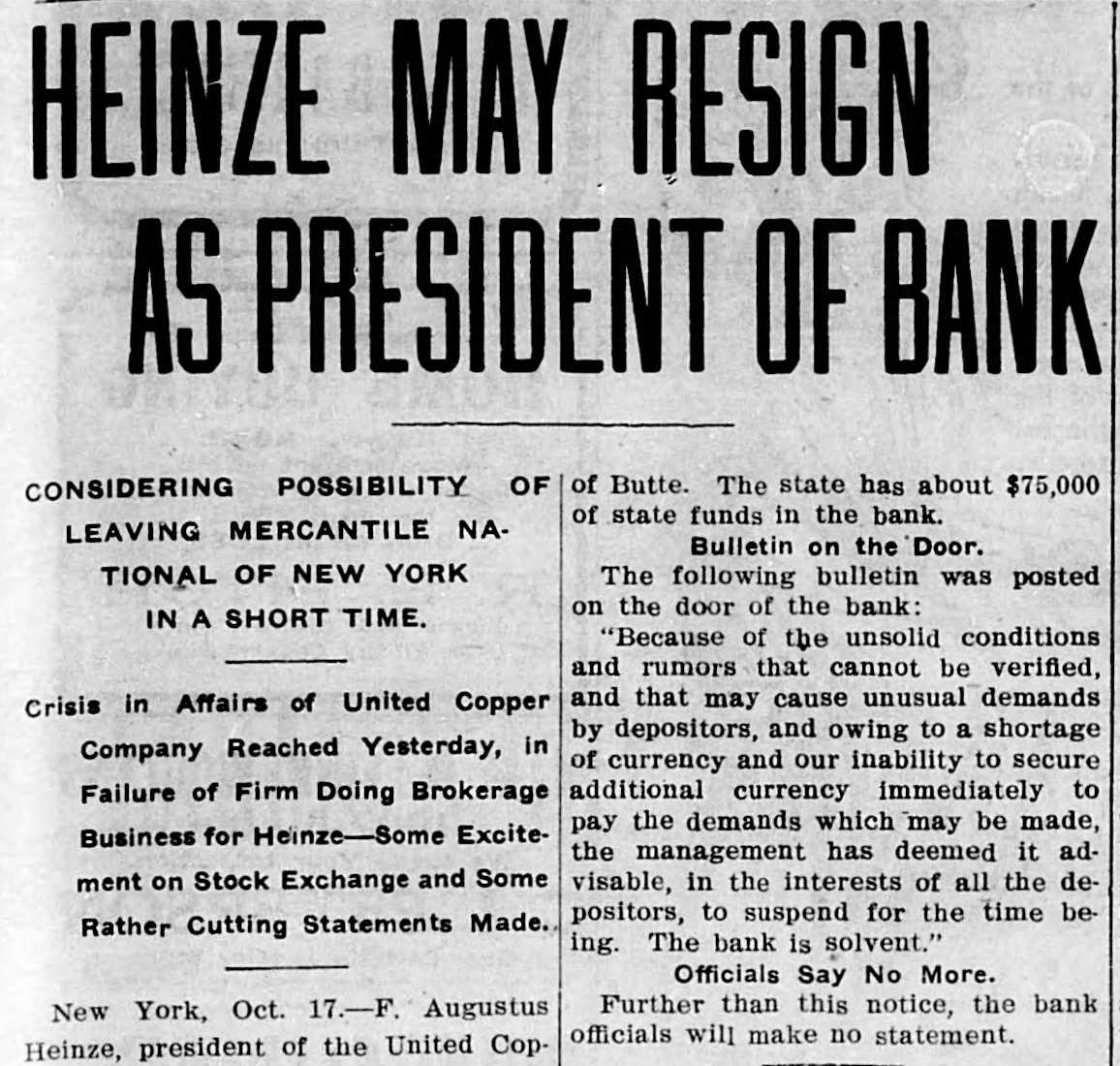 HEINZE MAY RESIGN AS PRESIDENT OF BANK of Butte. The state has about $75,000 CONSIDERING POSSIBILITY OF of state funds in the bank. LEAVING MERCANTILE NABulletin on the Door. TIONAL OF NEW YORK The following bulletin was posted on the door of the bank: IN A SHORT TIME. "Because of the unsolid conditions and rumors that cannot be verified, and that may cause unusual demands Crisis in Affairs of United Copper by depositors, and owing to a shortage Company Reached Yesterday, in of currency and our inability to secure additional currency immediately to Failure of Firm Doing Brokerage pay the demands which may be made, Business for Heinze-Some Excitethe management has deemed it adment on Stock Exchange and Some visable, in the interests of all the depositors, to suspend for the time beRather Cutting Statements Made. ing. The bank is solvent." Officials Say No More. Further than this notice, the bank New York, Oct. 17.-F. Augustus officials will make no statement. Heinze, president of the United Cop-