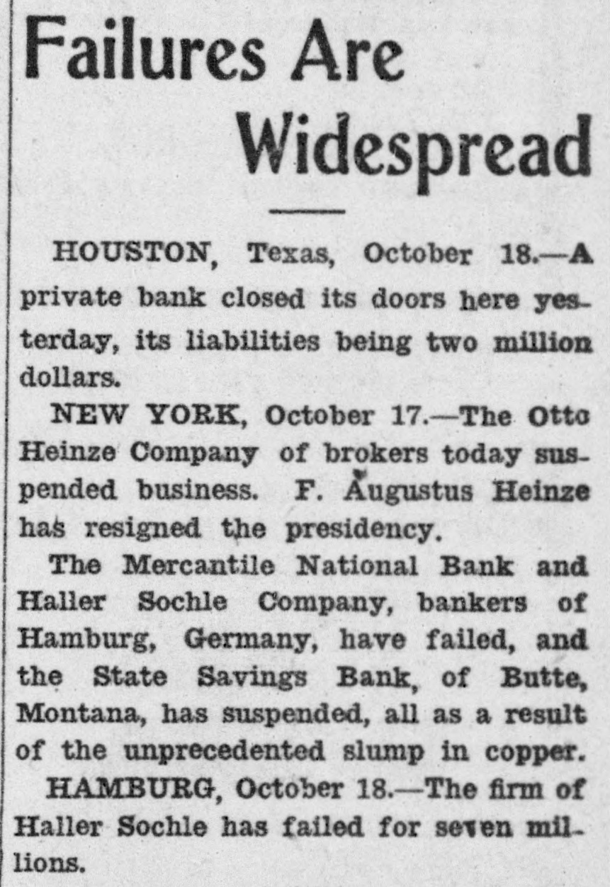Failures Are Widespread HOUSTON, Texas, October 18.-A private bank closed its doors here yesterday, its liabilities being two million dollars. NEW YORK, October 17.-The Otto Heinze Company of brokers today suspended business. F. Augustus Heinze has resigned the presidency. The Mercantile National Bank and Haller Sochle Company, bankers of Hamburg, Germany, have failed, and the State Savings Bank, of Butte, Montana, has suspended, all as a result of the unprecedented slump in copper. HAMBURG, October 18.-The firm of Haller Sochle has failed for seven millions.