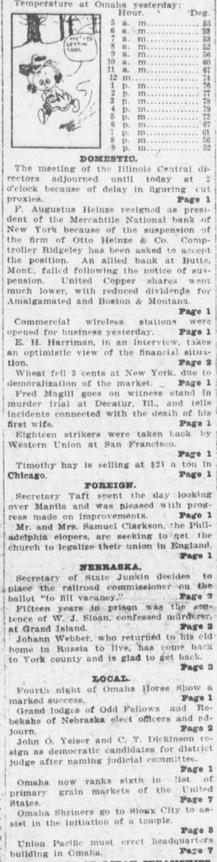Temperature at Omaha yesterday: Hour. Deg. 5 a. m 53 6 a. m 53 MY ITS 7 a. m 53 It GETTIN 8 a. m 52 COOL 9 a. m 56 10 a. m 60 11 a. m 67 12 m 74 ao 76 1 p. m 77 2 p. m 78 3 p. m 79 4 p. m 72 5 p. m 67 6 p. m 61 7 p. m 56 8 p. m 52 9 p. m DOMESTIC. The meeting of the Illinois Central di2 rectors adjourned until today at o'clock because of delay in figuring cut proxies. Page 1 F. Augustus Heinze resigned as president of the Mercantile National bank of New York because of the suspension of the firm of Otto Heinze & Co. Comptroller Ridgeley has been asked to accept the position. An allied bank at Butte, Mont., failed following the notice of suspension. United Copper shares went much lower. with reduced dividends for Amalgamated and Boston & Montana. Page 1 Commercial wireless stations were opened for business yesterday. Page 1 E. H. Harriman, in an Interview, takes an optimistic view of the financial situation. Page 2 Wheat fell 3 cents at New York, due to demoralization of the market. Page 1 Fred Magill goes on witness stand in murder trial at Decatur. 111., and tells incidents connected with the death of his Page 1 first wife. Eighteen strikers were taken back by Western Union at San Francisco. Page 1 Timothy hay is selling at $21 a ton in Page 1 Chicago. FOREIGN. Secretary Taft spent the day looking over Manila and was pleased with progPage 1 ress made on improvements. Mr. and Mrs. Samuel Clarkson, the Philadelphia elopers, are seeking to get the church to legalize their union in England, Page 1 NEBRASKA. Secretary of State Junkin decides to place the railroad commissioner on the Page 3 ballot "to fill vacaney. Fifteen years in prison was the sentence of W. J. Sloan, confessed murderer, Page 3 at Grand Island. Johann Webber. who returned to his old home in Russia to live, has come back to York county and is glad to get back. Page 3 LOCAL. Fourth night of Omaha Horse Show a Page 1 marked success. Grand lodges of Odd Fellows and Rebekahs of Nebraska elect officers and adPage 2 journ. John O. Yeiser and C. T. Dickinson resign as democratic candidates for district judge after naming judicial committee. Page 1 Omaha now ranks sixth in list of primary grain markets of the United Page 7 States. Omaha Shriners go to Sioux City to assist in the initiation of a temple. Page 5 Union Pacific must erect headquarters Page 7 building in Omaha.