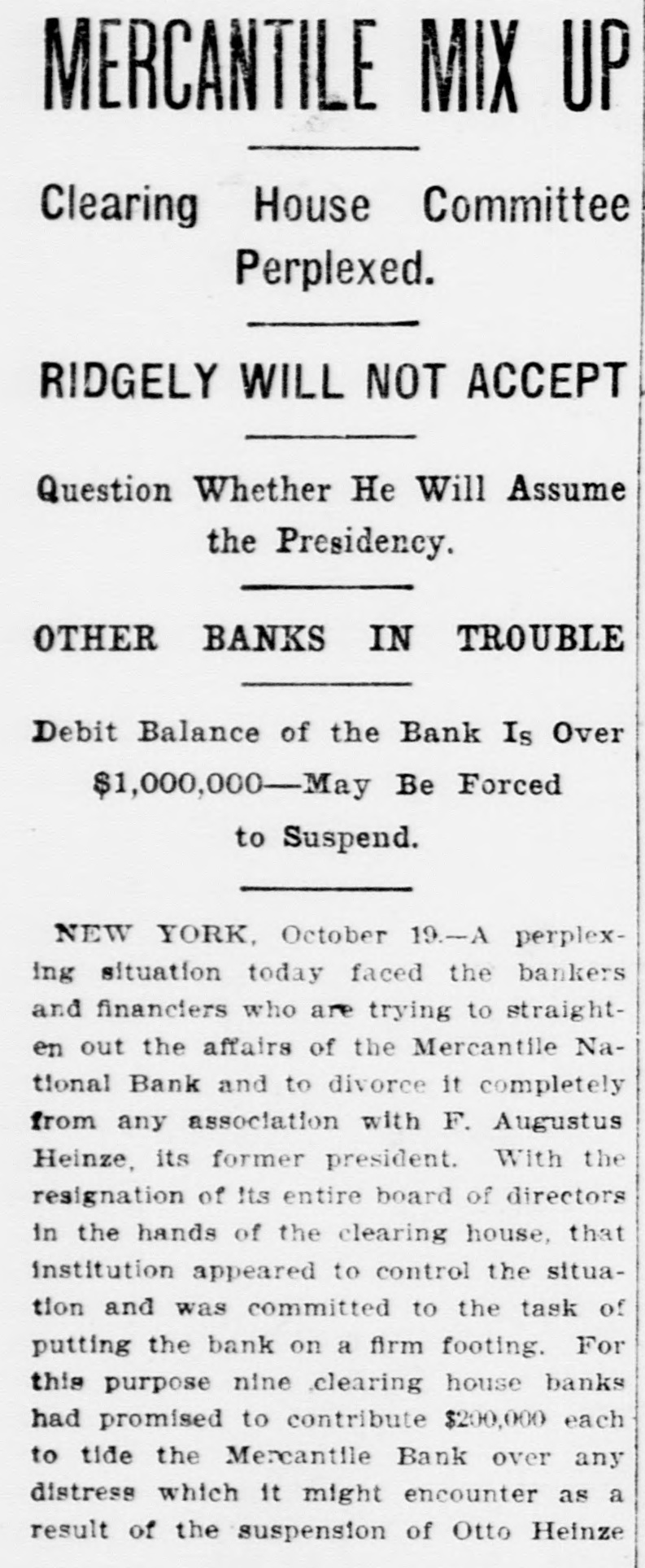 MERCANTILE MIX UP House Committee Clearing Perplexed. RIDGELY WILL NOT ACCEPT Question Whether He Will Assume the Presidency. OTHER BANKS IN TROUBLE Debit Balance of the Bank Is Over $1,000,000-May Be Forced to Suspend. NEW YORK, October 19.-A perplexing situation today faced the bankers and financiers who are trying to straighten out the affairs of the Mercantile National Bank and to divorce it completely from any association with F. Augustus Heinze, its former president. With the resignation of Its entire board of directors in the hands of the clearing house, that institution appeared to control the situation and was committed to the task of putting the bank on a firm footing. For this purpose nine .clearing house banks had promised to contribute $200,000 each to tide the Mercantile Bank over any distress which it might encounter as a result of the suspension of Otto Heinze