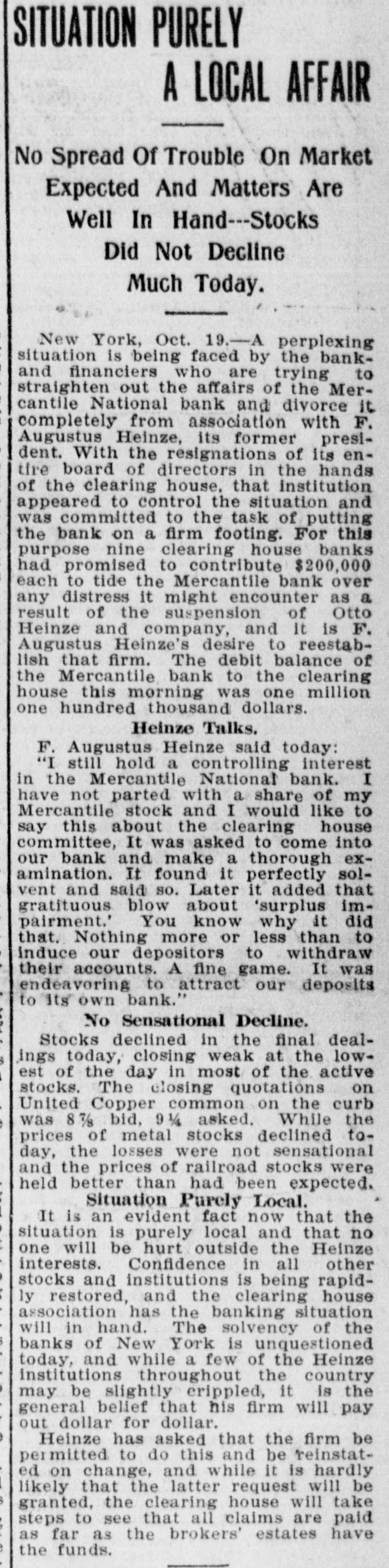 SITUATION PURELY A LOCAL AFFAIR No Spread Of Trouble On Market Expected And Matters Are Well In Hand--Stocks Did Not Decline Much Today. New York, Oct. 19.-A perplexing situation is being faced by the bankto and financiers who are trying straighten out the affairs of the Mercantile National bank and divorce it completely from association with F. Augustus Heinze, its former president. With the resignations of its entire board of directors in the hands of the clearing house, that institution appeared to control the situation and was committed to the task of putting the bank on a firm footing. For this purpose nine clearing house banks had promised to contribute $200,000 each to tide the Mercantile bank over any distress it might encounter as a result of the suspension of Otto Heinze and company, and it is F. Augustus Heinze's desire to reestablish that firm. The debit balance of the Mercantile bank to the clearing house this morning was one million one hundred thousand dollars. Heinze Talks. F. Augustus Heinze said today: "I still hold a controlling interest I in the Mercantile National bank. have not parted with a share of my Mercantile stock and I would like to say this about the clearing house committee, It was asked to come into our bank and make a thorough examination. It found it perfectly solvent and said so. Later it added that gratituous. blow about 'surplus impairment.' You know why it did that. Nothing more or less than to induce our depositors to withdraw their accounts. A fine game. It was endeavoring to attract our deposits to its own bank." No Sensational Decline. Stocks declined in the final dealings today, closing weak at the low3 est of the day in most of the active 1 stocks. The closing quotations on United Copper common on the curb was 8 7/3 bid, 9 1/4 asked. While the , prices of metal stocks declined today, the losses were not sensational and the prices of railroad stocks were held better than had been expected. Situation Purely Local. It is an evident fact now that the situation is purely local and that no one will be hurt outside the Heinze interests. Confidence in all other stocks and institutions is being rapidly restored, and the clearing house association has the banking situation will in hand. The solvency of the $ banks of New York is unquestioned today, and while a few of the Heinze institutions throughout the country may be slightly crippled, it is the general belief that his firm will pay out dollar for dollar. ) Heinze has asked that the firm be permitted to do this and be reinstated on change, and while it is hardly likely that the latter request will be $ granted, the clearing house will take steps to see that all claims are paid as far as the brokers' estates have e the funds.