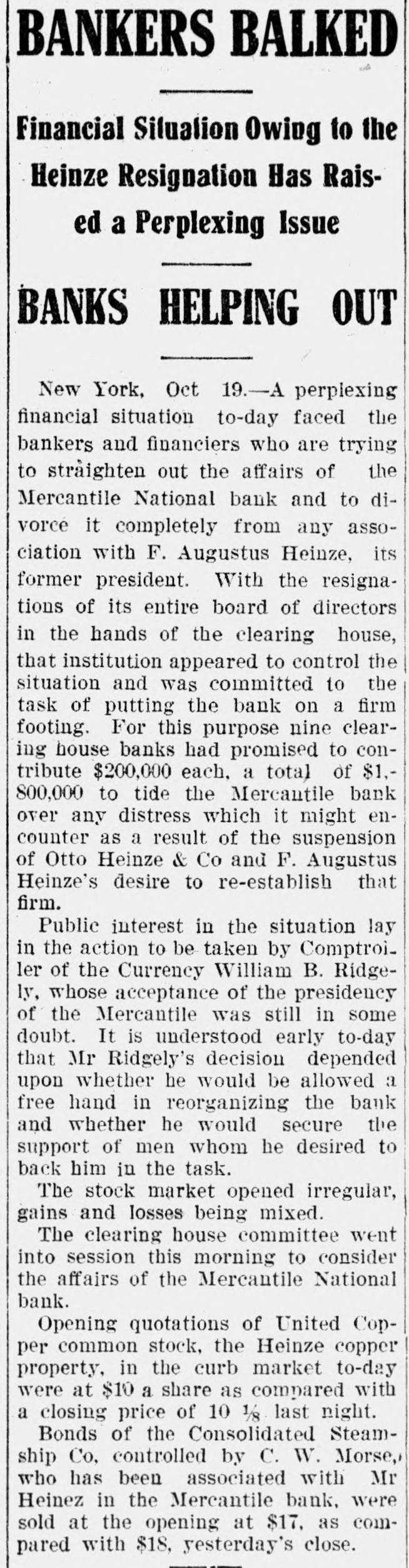 BANKERS BALKED Financial Siluation Owing to the Heinze Resignation Has Raised a Perplexing Issue BANKS HELPING OUT New York, Oct 19.-A perplexing financial situation to-day faced the bankers and financiers who are trying to straighten out the affairs of the Mercantile National bank and to divorce it completely from any association with F. Augustus Heinze, its former president. With the resignations of its entire board of directors in the hands of the clearing house, that institution appeared to control the situation and was committed to the task of putting the bank on a firm footing. For this purpose nine clearing house banks had promised to contribute $200,000 each, a total of $1,800,000 to tide the Mercautile bank over any distress which it might encounter as a result of the suspension of Otto Heinze & Co and F. Augustus Heinze's desire to re-establish that firm. Public interest in the situation lay in the action to be taken by Comptroiler of the Currency William B. Ridgely, whose acceptance of the presidency of the Mercantile was still in some doubt. It is understood early to-day that Mr Ridgely's decision depended upon whether he would be allowed a free hand in reorganizing the bank and whether he would secure the support of men whom he desired to back him in the task. The stock market opened irregular, gains and losses being mixed. The clearing house committee went into session this morning to consider the affairs of the Mercantile National bank. Opening quotations of United Copper common stock, the Heinze copper property, in the curb market to-day were at $10 a share as compared with a closing price of 10 1/8 last night. Bonds of the Consolidated Steamship Co, controlled by C. W. Morse, who has been associated with Mr Heinez in the Mercantile bank, were sold at the opening at $17, as compared with $18, yesterday's close.