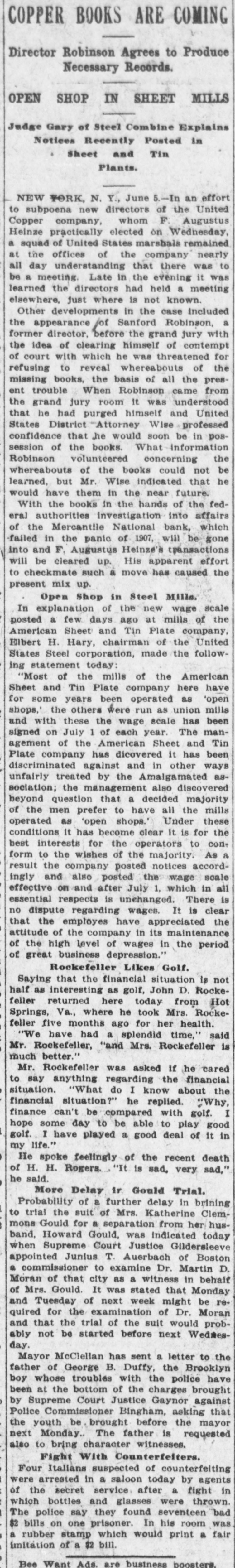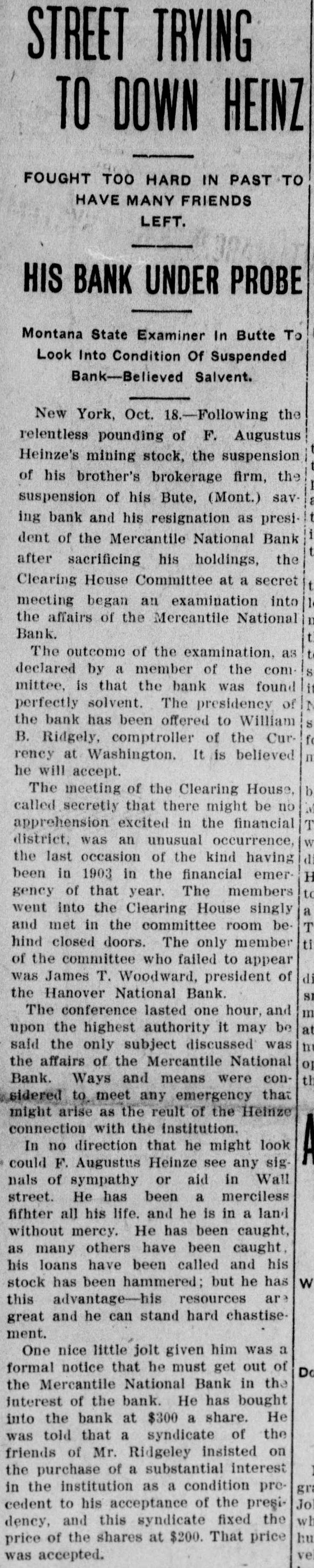 STREET TRYING TO DOWN HEINZ FOUGHT TOO HARD IN PAST TO HAVE MANY FRIENDS LEFT. HIS BANK UNDER PROBE Montana State Examiner In Butte To Look Into Condition Of Suspended Bank-Believed Salvent. New York, Oct. 18.-Following the relentless pounding of F. Augustus Heinze's mining stock, the suspension of his brother's brokerage firm, the suspension of his Bute, (Mont.) saving bank and his resignation as presi dent of the Mercantile National Bank after sacrificing his holdings, the t Clearing House Committee at a secret 1 meeting began an examination into I the affairs of the Mercantile National Bank. t t The outcome of the examination. as S declared by a member of the com i mittee, is that the bank was found I perfectly solvent. The presidency of the bank has been offered to William S f B. Ridgely, comptroller of the Cur n reney at Washington. It is believed he will accept. b The meeting of the Clearing House. a called secretly that there might be no T apprehension excited in the financial W district, was an unusual occurrence, d the last occasion of the kind having H been in 1903 in the financial emerto gency of that year. The members a went into the Clearing House singly T and met in the committee room be ti hind closed doors. The only member of the committee who failed to appear di was James T. Woodward, president of the Hanover National Bank. SI m The conference lasted one hour, and at upon the highest authority it may be In said the only subject discussed was 0) the affairs of the Mercantile National th Bank. Ways and means were considered to meet any emergency that might arise as the reult of the Heinze connection with the institution. In no direction that he might look could F. Augustus Heinze see any sig nals of sympathy or aid in Wall street. He has been a merciless fifhter all his life. and he is in a land without mercy. He has been caught, as many others have been caught, his loans have been called and his W stock has been hammered; but he has this advantage-his resources are great and he can stand hard chastisement. One nice little jolt given him was a formal notice that he must get out of Do the Mercantile National Bank in the interest of the bank. He has bought into the bank at $300 a share. He was told that a syndicate of the friends of Mr. Ridgeley insisted on the purchase of a substantial interest gra in the institution as a condition preJoi cedent to his acceptance of the presiwh dency, and this syndicate fixed the hu price of the shares at $200. That price ve was accepted.