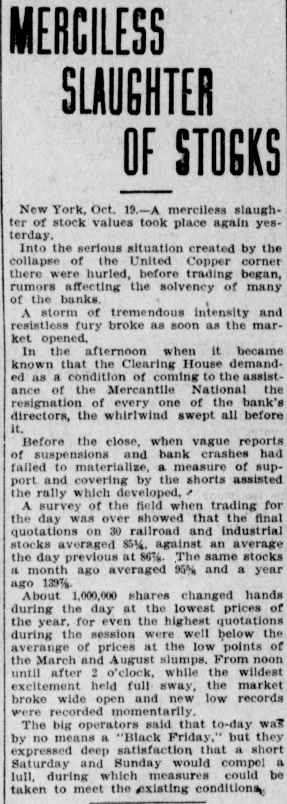 MERCILESS SLAUGHTER OF STOCKS New York, Oct. 19.-A merciless slaughter of stock values took place again yesterday. Into the serious situation created by the collapse of the United Copper corner there were hurled, before trading began, rumors affecting the solvency of many of the banks. A storm of tremendous intensity and resistless fury broke as soon as the market opened. In the afternoon when it became known that the Clearing House demanded as a condition of coming to the assistance of the Mercantile National the resignation of every one of the bank's directors, the whirlwind swept all before it. Before the close, when vague reports of suspensions and bank crashes had failed to materialize, a measure of support and covering by the shorts assisted the rally which developed. , A survey of the field when trading for the day was over showed that the final quotations on 30 railroad and industrial stocks averaged 851/4, against an average the day previous at 867/g. The same stocks a month ago averaged 95% and a year ago 1397/s. About 1,000,000 shares changed hands during the day at the lowest prices of the year, for even the highest quotations during the session were well below the averange of prices at the low points of the March and August slumps. From noon until after 2 o'clock, while the wildest excitement held full sway, the market broke wide open and new low records were recorded momentarily. The big operators said that to-day was by no means a "Black Friday," but they expressed deep satisfaction that a short Saturday and Sunday would compel a lull, during which measures could be taken to meet the existing conditions,