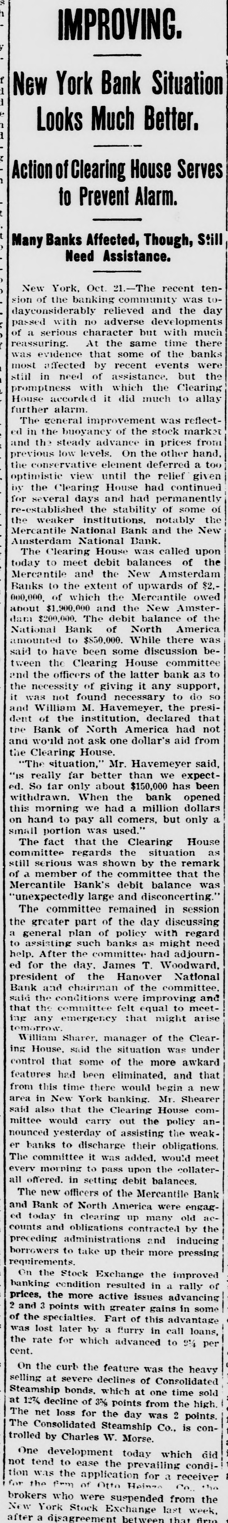 IMPROVING. New York Bank Situation Looks Much Better. Action of Clearing House Serves to Prevent Alarm. Many Banks Affected, Though, Still Need Assistance. New York, Oct. 21.-The recent tension of the banking community was todayconsiderably relieved and the day passed with no adverse developments of a serious character but with much reassuring. At the same time there was evidence that some of the banks most affected by recent events were still in need of assistance. but the promptness with which the Clearing House accorded it did much to allay further alarm. The general improvement was reflected in the buoyancy of the stock market and the steady advance in prices from previous low levels. On the other hand, the conservative element deferred a too optimistic view until the relief given by the Clearing House had continued for several days and had permanently re-established the stability of some of the weaker institutions, notably the Mercantile National Bank and the New Ainsterdam National Bank. The Clearing House was called upon today to meet debit balances of the Mercantile and the New Amsterdam Banks to the extent of upwards of $2,000,000. of which the Mercantile owed about $1,900,000 and the New Amsterdam $200,000. The debit balance of the National Bank of North America amounted to $850,000. While there was said to have been some discussion between the Clearing House committee and the officers of the latter bank a3 to the necessity of giving it any support, it was not found necessary to do SO and William M. Havemeyer, the president of the institution, declared that the Bank of North America had not and would not ask one dollar's aid from the Clearing House. "The situation," Mr. Havemeyer said, "is really far better than we expected. So far only about $150,000 has been withdrawn. When the bank opened this morning we had a million dollars on hand to pay all comers, but only a small portion was used." The fact that the Clearing House committee regards the situation as still serious was shown by the remark of a member of the committee that the Mercantile Bank's debit balance was "unexpectedly large and disconcerting." The committee remained in session the greater part of the day discussing a general plan of policy with regard to assisting such banks as might need help. After the committee had adjourned for the day. James T. Woodward. president of the Hanover National Bank and chairman of the committee. said the conditions were improving and that the committee felt equal to meeting any emergency that might arise tomorrow. William Sharer, manager of the Clearing House, said the situation was under control that some of the more awkard features had been eliminated. and that