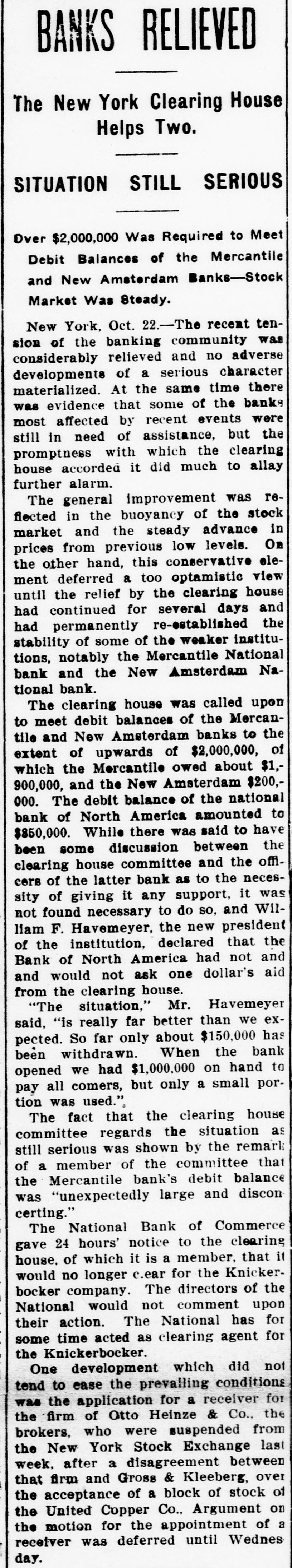 BANKS RELIEVED The New York Clearing House Helps Two. SITUATION STILL SERIOUS Over $2,000,000 Was Required to Meet Debit Balances of the Mercantile and New Amsterdam Banks-Stock Market Was Steady. New York, Oct. 22.-The recent tension of the banking community was considerably relieved and no adverse developments of a serious character materialized. At the same time there was evidence that some of the banks most affected by recent events were still in need of assistance, but the promptness with which the clearing house accorded it did much to allay further alarm. The general improvement was reflected in the buoyancy of the stock market and the steady advance in prices from previous low levels. On the other hand, this conservative element deferred a too optamistic view until the relief by the clearing house had continued for several days and had permanently re-established the stability of some of the weaker institutions, notably the Mercantile National bank and the New Amsterdam National bank. The clearing house was called upon to meet debit balances of the Mercantile and New Amsterdam banks to the extent of upwards of $2,000,000, of which the Mercantile owed about $1,900,000, and the New Amsterdam $200,000. The debit balance of the national bank of North America amounted to $850,000. While there was said to have been some discussion between the clearing house committee and the officers of the latter bank as to the necessity of giving it any support, it was not found necessary to do so, and William F. Havemeyer, the new president of the institution, declared that the Bank of North America had not and and would not ask one dollar's aid from the clearing house. "The situation," Mr. Havemeyer said, "is really far better than we expected. So far only about $150,000 has been withdrawn. When the bank opened we had $1,000,000 on hand to pay all comers, but only a small portion was used.". The fact that the clearing house committee regards the situation as still serious was shown by the remark of a member of the committee that the Mercantile bank's debit balance was "unexpectedly large and discon certing." The National Bank of Commerce gave 24 hours' notice to the clearing house, of which it is a member, that it would no longer c.ear for the Knickerbocker company. The directors of the National would not comment upon their action. The National has for some time acted as clearing agent for the Knickerbocker. One development which did not tend to ease the prevailing conditions was the application for a receiver for the firm of Otto Heinze & Co., the brokers, who were suspended from the New York Stock Exchange last week, after a disagreement between that firm and Gross & Kleeberg, over the acceptance of a block of stock of the United Copper Co., Argument on the motion for the appointment of a receiver was deferred until Wednes day.